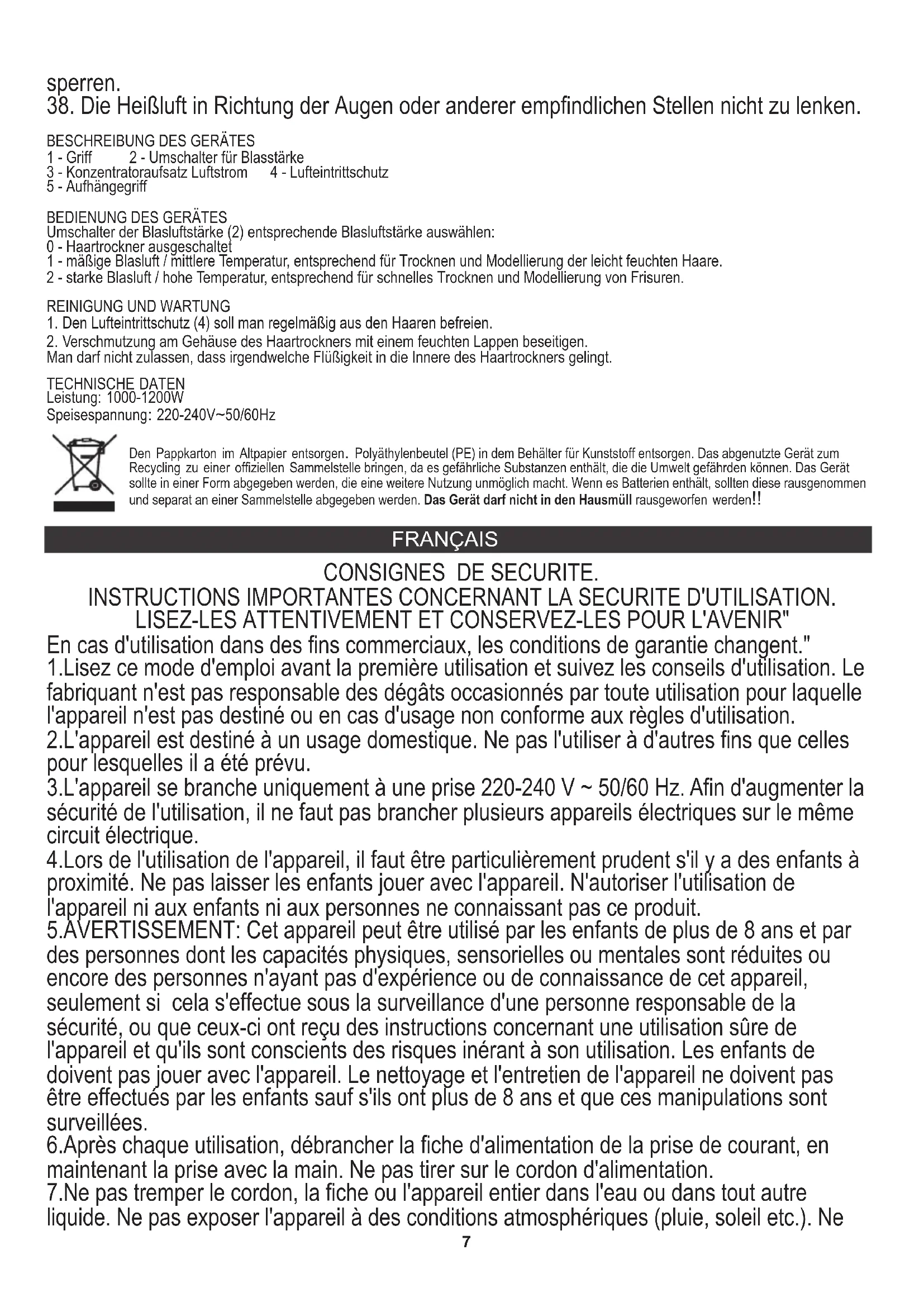 2.L'appareil est destiné à un usage domestique. Ne pas l'utiliser à d'autres fins que celles pour lesquelles il a été prévu. CONSIGNES DE SECURITE. INSTRUCTIONS IMPORTANTES CONCERNANT LA SECURITE D'UTILISATION. En cas d'utilisation dans des fins commerciaux, les conditions de garantie changent." 1.Lisez ce mode d'emploi avant la première utilisation et suivez les conseils d'utilisation. Le fabriquant n'est pas responsable des dégâts occasionnés par toute utilisation pour laquelle l'appareil n'est pas destiné ou en cas d'usage non conforme aux règles d'utilisation. 6.Après chaque utilisation, débrancher la fiche d'alimentation de la prise de courant, en maintenant la prise avec la main. Ne pas tirer sur le cordon d'alimentation. 5.AVERTISSEMENT: Cet appareil peut être utilisé par les enfants de plus de 8 ans et par des personnes dont les capacités physiques, sensorielles ou mentales sont réduites ou encore des personnes n'ayant pas d'expérience ou de connaissance de cet appareil, seulement si cela s'effectue sous la surveillance d'une personne responsable de la sécurité, ou que ceux-ci ont reçu des instructions concernant une utilisation sûre de l'appareil et qu'ils sont conscients des risques inérant à son utilisation. Les enfants de doivent pas jouer avec l'appareil. Le nettoyage et l'entretien de l'appareil ne doivent pas être effectués par les enfants sauf s'ils ont plus de 8 ans et que ces manipulations sont surveillées. 7.Ne pas tremper le cordon, la fiche ou l'appareil entier dans l'eau ou dans tout autre liquide. Ne pas exposer l'appareil à des conditions atmosphériques (pluie, soleil etc.). Ne 3.L'appareil se branche uniquement à une prise 220-240 V ~ 50/60 Hz. Afin d'augmenter la sécurité de l'utilisation, il ne faut pas brancher plusieurs appareils électriques sur le même circuit électrique. 4.Lors de l'utilisation de l'appareil, il faut être particulièrement prudent s'il y a des enfants à proximité. Ne pas laisser les enfants jouer avec l'appareil. N'autoriser l'utilisation de l'appareil ni aux enfants ni aux personnes ne connaissant pas ce produit. Den Pappkarton im Altpapier entsorgen. Polyäthylenbeutel (PE) in dem Behälter für Kunststoff entsorgen. Das abgenutzte Gerät zum Recycling zu einer offiziellen Sammelstelle bringen, da es gefährliche Substanzen enthält, die die Umwelt gefährden können. Das Gerät sollte in einer Form abgegeben werden, die eine weitere Nutzung unmöglich macht. Wenn es Batterien enthält, sollten diese rausgenommen und separat an einer Sammelstelle abgegeben werden. Das Gerät darf nicht in den Hausmüll rausgeworfen werden!! FRANÇAIS8