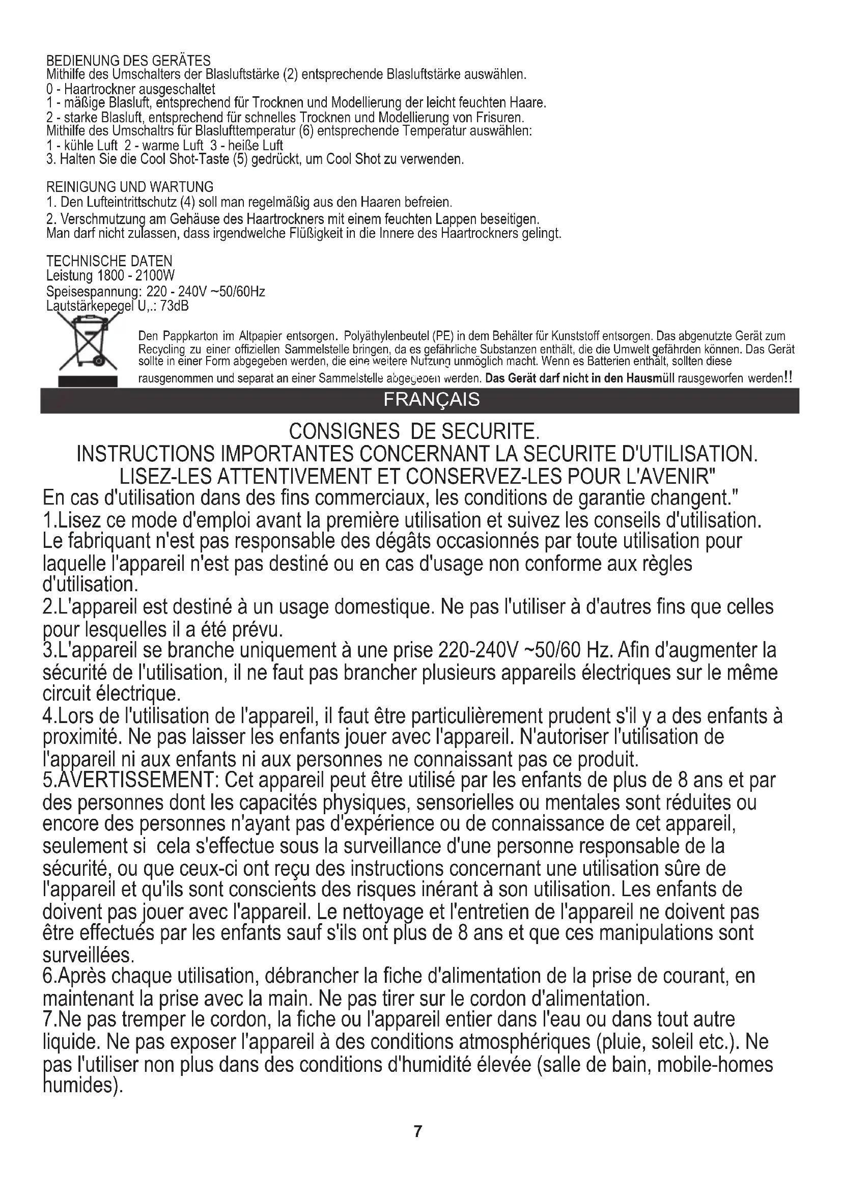 En cas d'utilisation dans des fins commerciaux, les conditions de garantie changent." 2.L'appareil est destiné à un usage domestique. Ne pas l'utiliser à d'autres fins que celles pour lesquelles il a été prévu. 1.Lisez ce mode d'emploi avant la première utilisation et suivez les conseils d'utilisation. Le fabriquant n'est pas responsable des dégâts occasionnés par toute utilisation pour laquelle l'appareil n'est pas destiné ou en cas d'usage non conforme aux règles d'utilisation. 3.L'appareil se branche uniquement à une prise 220-240V ~50/60 Hz. Afin d'augmenter la sécurité de l'utilisation, il ne faut pas brancher plusieurs appareils électriques sur le même circuit électrique. 7.Ne pas tremper le cordon, la fiche ou l'appareil entier dans l'eau ou dans tout autre liquide. Ne pas exposer l'appareil à des conditions atmosphériques (pluie, soleil etc.). Ne pas l'utiliser non plus dans des conditions d'humidité élevée (salle de bain, mobile-homes humides). 5.AVERTISSEMENT: Cet appareil peut être utilisé par les enfants de plus de 8 ans et par des personnes dont les capacités physiques, sensorielles ou mentales sont réduites ou encore des personnes n'ayant pas d'expérience ou de connaissance de cet appareil, seulement si cela s'effectue sous la surveillance d'une personne responsable de la sécurité, ou que ceux-ci ont reçu des instructions concernant une utilisation sûre de l'appareil et qu'ils sont conscients des risques inérant à son utilisation. Les enfants de doivent pas jouer avec l'appareil. Le nettoyage et l'entretien de l'appareil ne doivent pas être effectués par les enfants sauf s'ils ont plus de 8 ans et que ces manipulations sont surveillées. 6.Après chaque utilisation, débrancher la fiche d'alimentation de la prise de courant, en maintenant la prise avec la main. Ne pas tirer sur le cordon d'alimentation. 4.Lors de l'utilisation de l'appareil, il faut être particulièrement prudent s'il y a des enfants à proximité. Ne pas laisser les enfants jouer avec l'appareil. N'autoriser l'utilisation de l'appareil ni aux enfants ni aux personnes ne connaissant pas ce produit.