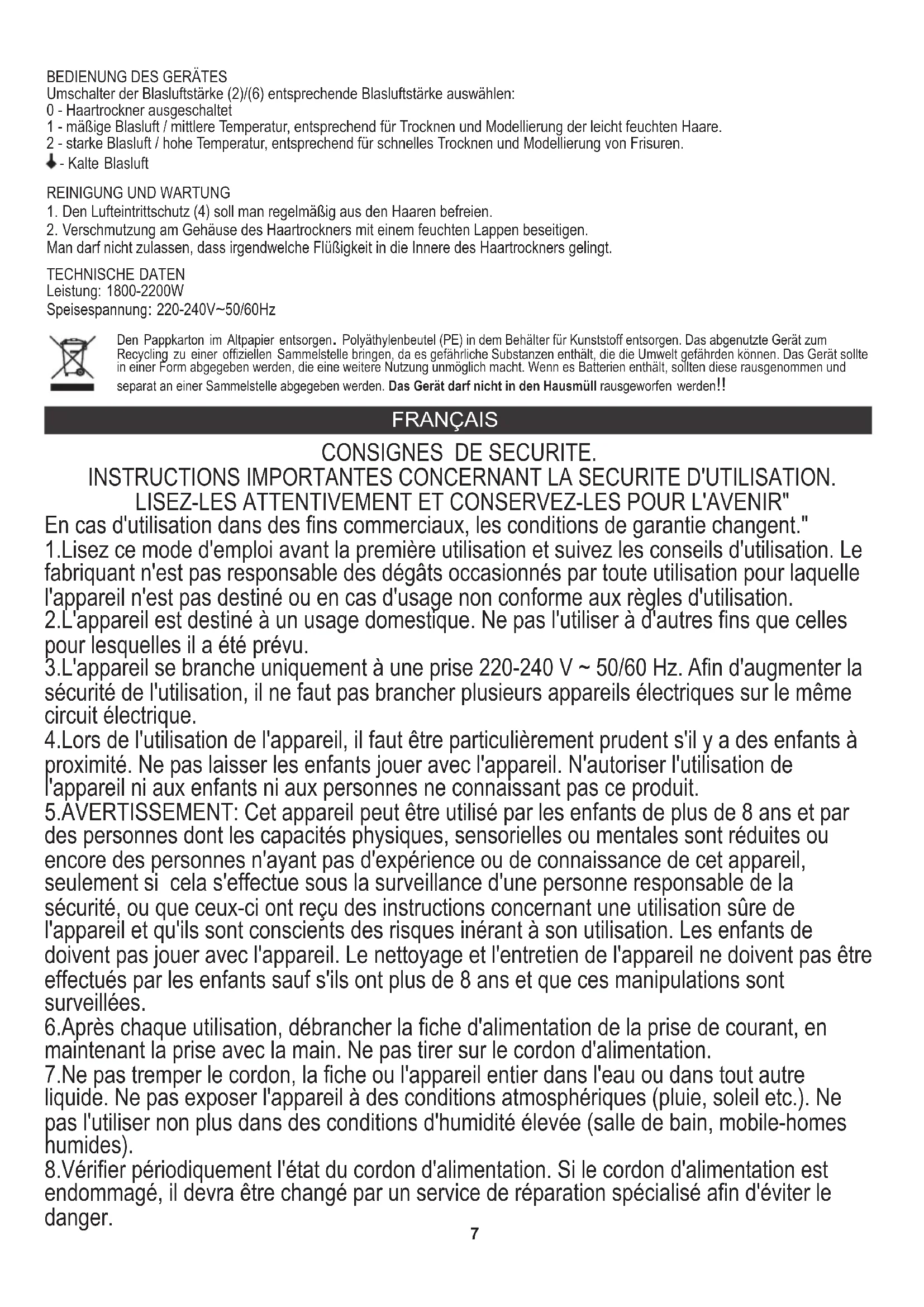 En cas d'utilisation dans des fins commerciaux, les conditions de garantie changent." 1.Lisez ce mode d'emploi avant la première utilisation et suivez les conseils d'utilisation. Le fabriquant n'est pas responsable des dégâts occasionnés par toute utilisation pour laquelle l'appareil n'est pas destiné ou en cas d'usage non conforme aux règles d'utilisation. 2.L'appareil est destiné à un usage domestique. Ne pas l'utiliser à d'autres fins que celles pour lesquelles il a été prévu. INSTRUCTIONS IMPORTANTES CONCERNANT LA SECURITE D'UTILISATION. CONSIGNES DE SECURITE. 7.Ne pas tremper le cordon, la fiche ou l'appareil entier dans l'eau ou dans tout autre liquide. Ne pas exposer l'appareil à des conditions atmosphériques (pluie, soleil etc.). Ne pas l'utiliser non plus dans des conditions d'humidité élevée (salle de bain, mobile-homes humides). 6.Après chaque utilisation, débrancher la fiche d'alimentation de la prise de courant, en maintenant la prise avec la main. Ne pas tirer sur le cordon d'alimentation. 4.Lors de l'utilisation de l'appareil, il faut être particulièrement prudent s'il y a des enfants à proximité. Ne pas laisser les enfants jouer avec l'appareil. N'autoriser l'utilisation de l'appareil ni aux enfants ni aux personnes ne connaissant pas ce produit. 3.L'appareil se branche uniquement à une prise 220-240 V ~ 50/60 Hz. Afin d'augmenter la sécurité de l'utilisation, il ne faut pas brancher plusieurs appareils électriques sur le même circuit électrique. 5.AVERTISSEMENT: Cet appareil peut être utilisé par les enfants de plus de 8 ans et par des personnes dont les capacités physiques, sensorielles ou mentales sont réduites ou encore des personnes n'ayant pas d'expérience ou de connaissance de cet appareil, seulement si cela s'effectue sous la surveillance d'une personne responsable de la sécurité, ou que ceux-ci ont reçu des instructions concernant une utilisation sûre de l'appareil et qu'ils sont conscients des risques inérant à son utilisation. Les enfants de doivent pas jouer avec l'appareil. Le nettoyage et l'entretien de l'appareil ne doivent pas être effectués par les enfants sauf s'ils ont plus de 8 ans et que ces manipulations sont surveillées. 8.Vérifier périodiquement l'état du cordon d'alimentation. Si le cordon d'alimentation est endommagé, il devra être changé par un service de réparation spécialisé afin d'éviter le danger. Den Pappkarton im Altpapier entsorgen. Polyäthylenbeutel (PE) in dem Behälter für Kunststoff entsorgen. Das abgenutzte Gerät zum Recycling zu einer offiziellen Sammelstelle bringen, da es gefährliche Substanzen enthält, die die Umwelt gefährden können. Das Gerät sollte in einer Form abgegeben werden, die eine weitere Nutzung unmöglich macht. Wenn es Batterien enthält, sollten diese rausgenommen und separat an einer Sammelstelle abgegeben werden. Das Gerät darf nicht in den Hausmüll rausgeworfen werden!! FRANÇAIS8