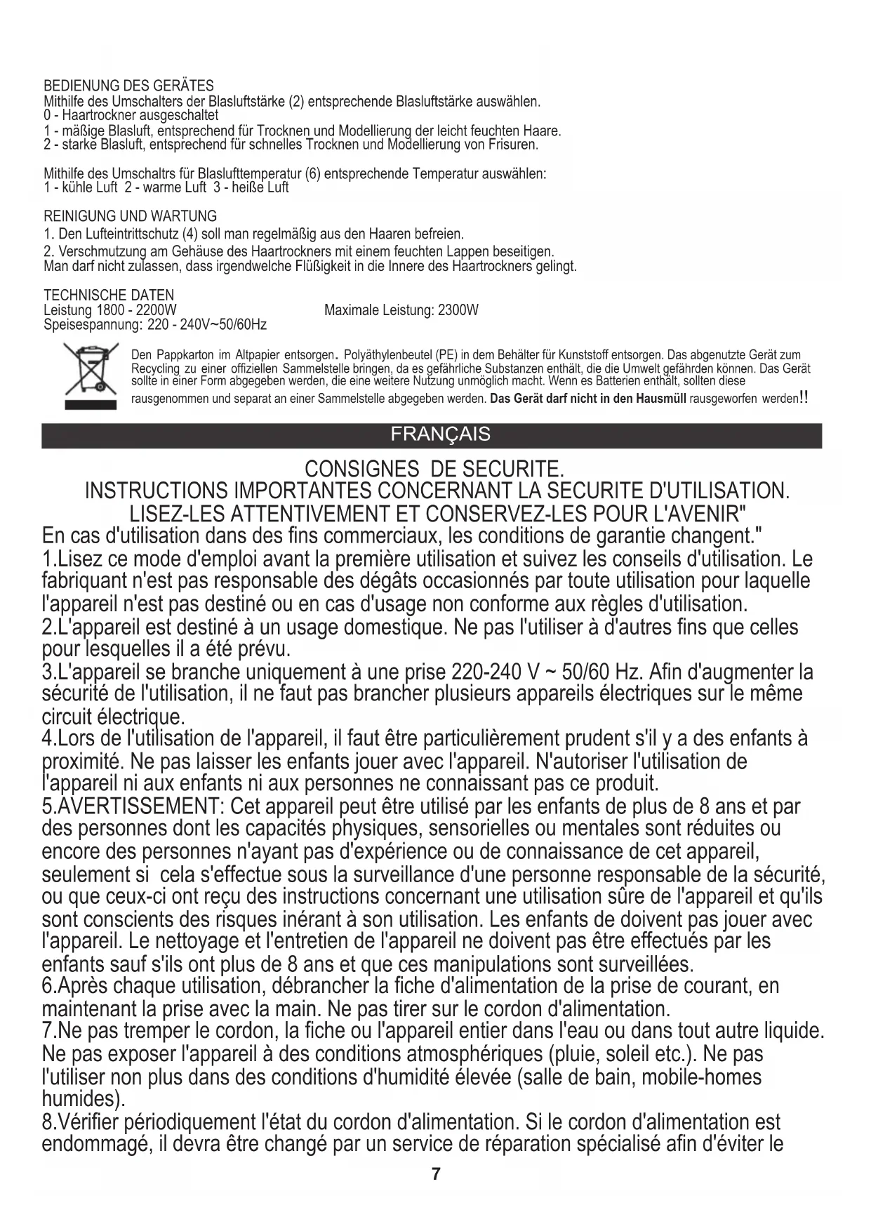 INSTRUCTIONS IMPORTANTES CONCERNANT LA SECURITE D'UTILISATION. 1.Lisez ce mode d'emploi avant la première utilisation et suivez les conseils d'utilisation. Le fabriquant n'est pas responsable des dégâts occasionnés par toute utilisation pour laquelle l'appareil n'est pas destiné ou en cas d'usage non conforme aux règles d'utilisation. En cas d'utilisation dans des fins commerciaux, les conditions de garantie changent." 2.L'appareil est destiné à un usage domestique. Ne pas l'utiliser à d'autres fins que celles pour lesquelles il a été prévu. 3.L'appareil se branche uniquement à une prise 220-240 V ~ 50/60 Hz. Afin d'augmenter la sécurité de l'utilisation, il ne faut pas brancher plusieurs appareils électriques sur le même circuit électrique. 4.Lors de l'utilisation de l'appareil, il faut être particulièrement prudent s'il y a des enfants à proximité. Ne pas laisser les enfants jouer avec l'appareil. N'autoriser l'utilisation de l'appareil ni aux enfants ni aux personnes ne connaissant pas ce produit. 5.AVERTISSEMENT: Cet appareil peut être utilisé par les enfants de plus de 8 ans et par des personnes dont les capacités physiques, sensorielles ou mentales sont réduites ou encore des personnes n'ayant pas d'expérience ou de connaissance de cet appareil, seulement si cela s'effectue sous la surveillance d'une personne responsable de la sécurité, ou que ceux-ci ont reçu des instructions concernant une utilisation sûre de l'appareil et qu'ils sont conscients des risques inérant à son utilisation. Les enfants de doivent pas jouer avec l'appareil. Le nettoyage et l'entretien de l'appareil ne doivent pas être effectués par les enfants sauf s'ils ont plus de 8 ans et que ces manipulations sont surveillées. 7.Ne pas tremper le cordon, la fiche ou l'appareil entier dans l'eau ou dans tout autre liquide. Ne pas exposer l'appareil à des conditions atmosphériques (pluie, soleil etc.). Ne pas l'utiliser non plus dans des conditions d'humidité élevée (salle de bain, mobile-homes humides). 6.Après chaque utilisation, débrancher la fiche d'alimentation de la prise de courant, en maintenant la prise avec la main. Ne pas tirer sur le cordon d'alimentation. 8.Vérifier périodiquement l'état du cordon d'alimentation. Si le cordon d'alimentation est endommagé, il devra être changé par un service de réparation spécialisé afin d'éviter le