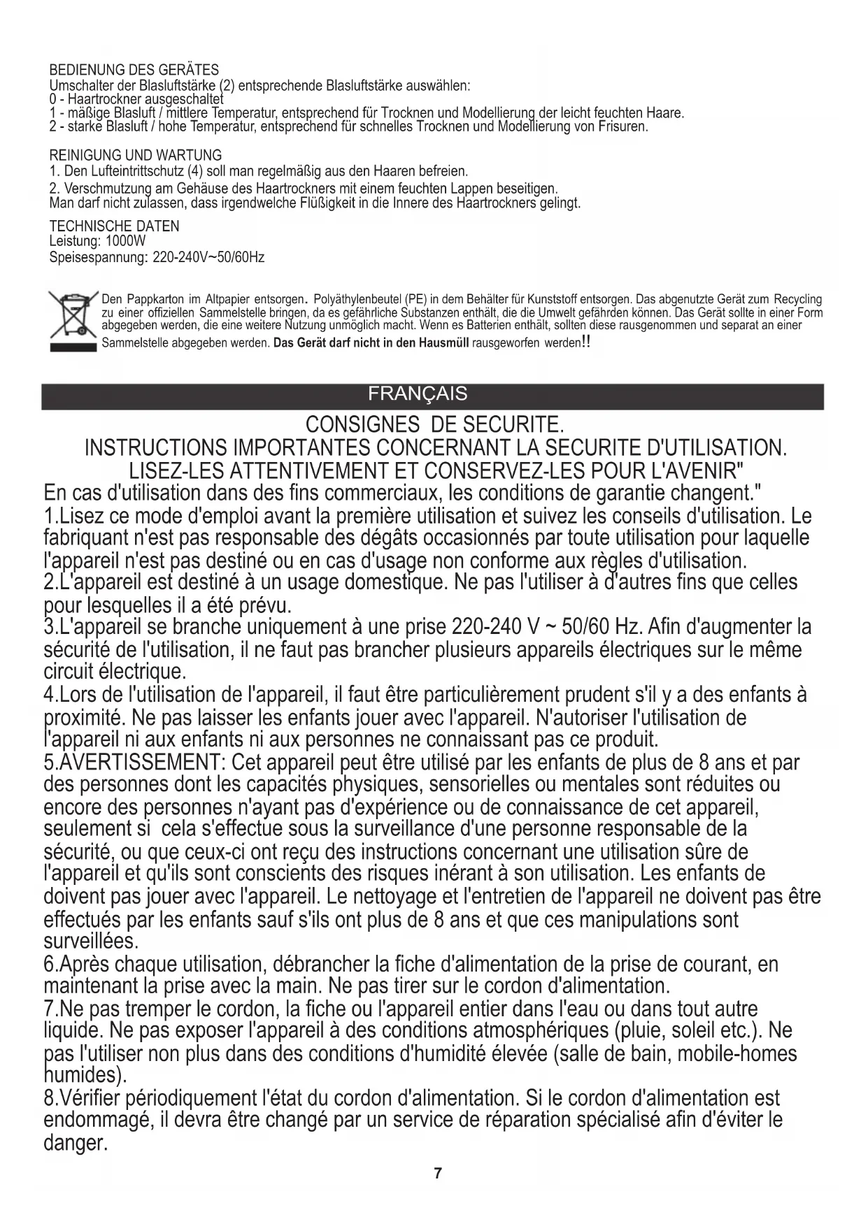 FRANÇAIS 7.Ne pas tremper le cordon, la fiche ou l'appareil entier dans l'eau ou dans tout autre liquide. Ne pas exposer l'appareil à des conditions atmosphériques (pluie, soleil etc.). Ne pas l'utiliser non plus dans des conditions d'humidité élevée (salle de bain, mobile-homes humides). 3.L'appareil se branche uniquement à une prise 220-240 V ~ 50/60 Hz. Afin d'augmenter la sécurité de l'utilisation, il ne faut pas brancher plusieurs appareils électriques sur le même circuit électrique. 2.L'appareil est destiné à un usage domestique. Ne pas l'utiliser à d'autres fins que celles pour lesquelles il a été prévu. 1.Lisez ce mode d'emploi avant la première utilisation et suivez les conseils d'utilisation. Le fabriquant n'est pas responsable des dégâts occasionnés par toute utilisation pour laquelle l'appareil n'est pas destiné ou en cas d'usage non conforme aux règles d'utilisation. 8.Vérifier périodiquement l'état du cordon d'alimentation. Si le cordon d'alimentation est endommagé, il devra être changé par un service de réparation spécialisé afin d'éviter le danger. INSTRUCTIONS IMPORTANTES CONCERNANT LA SECURITE D'UTILISATION. 4.Lors de l'utilisation de l'appareil, il faut être particulièrement prudent s'il y a des enfants à proximité. Ne pas laisser les enfants jouer avec l'appareil. N'autoriser l'utilisation de l'appareil ni aux enfants ni aux personnes ne connaissant pas ce produit. 5.AVERTISSEMENT: Cet appareil peut être utilisé par les enfants de plus de 8 ans et par des personnes dont les capacités physiques, sensorielles ou mentales sont réduites ou encore des personnes n'ayant pas d'expérience ou de connaissance de cet appareil, seulement si cela s'effectue sous la surveillance d'une personne responsable de la sécurité, ou que ceux-ci ont reçu des instructions concernant une utilisation sûre de l'appareil et qu'ils sont conscients des risques inérant à son utilisation. Les enfants de doivent pas jouer avec l'appareil. Le nettoyage et l'entretien de l'appareil ne doivent pas être effectués par les enfants sauf s'ils ont plus de 8 ans et que ces manipulations sont surveillées.
