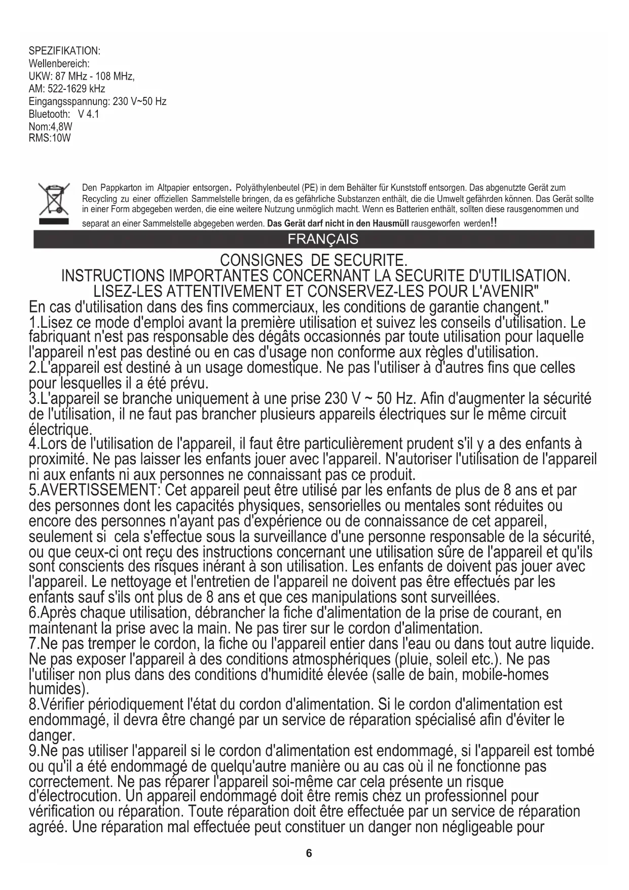 En cas d'utilisation dans des fins commerciaux, les conditions de garantie changent." 1.Lisez ce mode d'emploi avant la première utilisation et suivez les conseils d'utilisation. Le fabriquant n'est pas responsable des dégâts occasionnés par toute utilisation pour laquelle l'appareil n'est pas destiné ou en cas d'usage non conforme aux règles d'utilisation. 2.L'appareil est destiné à un usage domestique. Ne pas l'utiliser à d'autres fins que celles pour lesquelles il a été prévu. 3.L'appareil se branche uniquement à une prise 230 V ~ 50 Hz. Afin d'augmenter la sécurité de l'utilisation, il ne faut pas brancher plusieurs appareils électriques sur le même circuit électrique. 4.Lors de l'utilisation de l'appareil, il faut être particulièrement prudent s'il y a des enfants à proximité. Ne pas laisser les enfants jouer avec l'appareil. N'autoriser l'utilisation de l'appareil ni aux enfants ni aux personnes ne connaissant pas ce produit. 5.AVERTISSEMENT: Cet appareil peut être utilisé par les enfants de plus de 8 ans et par des personnes dont les capacités physiques, sensorielles ou mentales sont réduites ou encore des personnes n'ayant pas d'expérience ou de connaissance de cet appareil, seulement si cela s'effectue sous la surveillance d'une personne responsable de la sécurité, ou que ceux-ci ont reçu des instructions concernant une utilisation sûre de l'appareil et qu'ils sont conscients des risques inérant à son utilisation. Les enfants de doivent pas jouer avec l'appareil. Le nettoyage et l'entretien de l'appareil ne doivent pas être effectués par les enfants sauf s'ils ont plus de 8 ans et que ces manipulations sont surveillées. 6.Après chaque utilisation, débrancher la fiche d'alimentation de la prise de courant, en maintenant la prise avec la main. Ne pas tirer sur le cordon d'alimentation. 7.Ne pas tremper le cordon, la fiche ou l'appareil entier dans l'eau ou dans tout autre liquide. Ne pas exposer l'appareil à des conditions atmosphériques (pluie, soleil etc.). Ne pas l'utiliser non plus dans des conditions d'humidité élevée (salle de bain, mobile-homes humides). 8.Vérifier périodiquement l'état du cordon d'alimentation. Si le cordon d'alimentation est endommagé, il devra être changé par un service de réparation spécialisé afin d'éviter le danger. 9.Ne pas utiliser l'appareil si le cordon d'alimentation est endommagé, si l'appareil est tombé ou qu'il a été endommagé de quelqu'autre manière ou au cas où il ne fonctionne pas correctement. Ne pas réparer l'appareil soi-même car cela présente un risque d'électrocution. Un appareil endommagé doit être remis chez un professionnel pour vérification ou réparation. Toute réparation doit être effectuée par un service de réparation agréé. Une réparation mal effectuée peut constituer un danger non négligeable pour7 l'utilisateur.