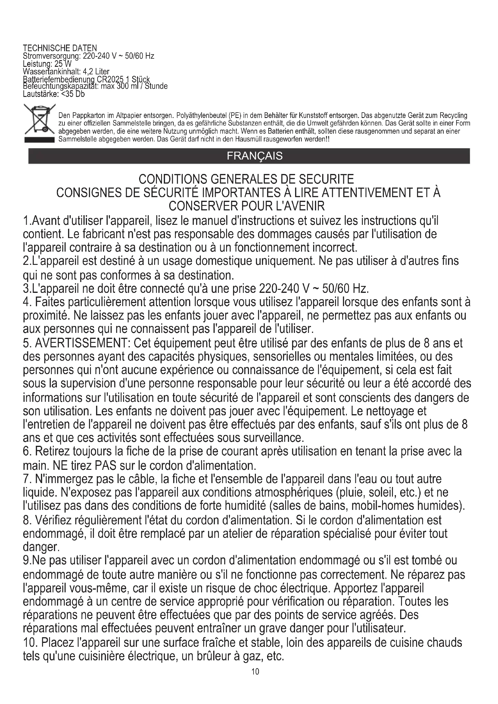 Alimentation: 220-240V ~ 50 / 60Hz Puissance: 25 W Capacité du réservoir d'eau: 4,2 litres Télécommande à pile CR2025 1 pièce Capacité d'humidification: max 300 ml / heure Volume: <35 Db Respect de l'environnement. Nous vous prions de bien vouloir trier les emballages en carton ainsi que les sachets plastiques (en polyéthylène). L'appareil usagé ne doit pas être jeté à la poubelle mais remis au point de collecte prévu à cet effet car il contient des éléments pouvant être nocifs pour l'environnement. L'appareil électrique doit être remis de manière à limiter au maximum une éventuelle utilisation ultérieure. Si l'appareil contient des piles, il faut les retirer et les remettre à un autre point de collecte. Ne pas jeter l'appareil dans une poubelle de déchets ménagers !!! ESPAÑOL