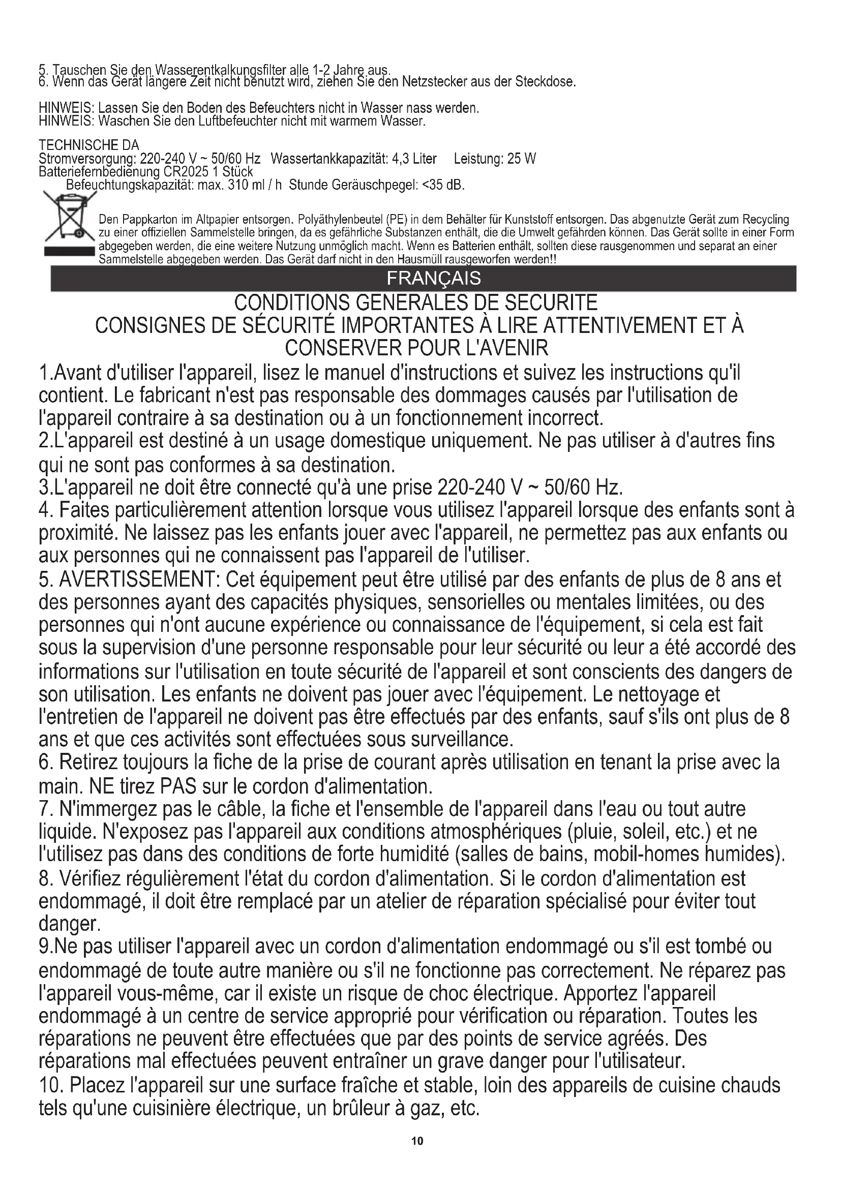 REMARQUE: Ne laissez pas la base de l'humidificateur se mouiller dans l'eau. REMARQUE: ne lavez pas l'humidificateur à l'eau tiède. DA TECHNIQUE Alimentation: 220-240V ~ 50 / 60Hz Capacité du réservoir d'eau: 4,3 litres Puissance: 25 W Télécommande à pile CR2025 1 pièce Capacité d'humidification: max 310 ml / heure Niveau sonore: <35 Db. Respect de l'environnement. Nous vous prions de bien vouloir trier les emballages en carton ainsi que les sachets plastiques (en polyéthylène). L'appareil usagé ne doit pas être jeté à la poubelle mais remis au point de collecte prévu à cet effet car il contient des éléments pouvant être nocifs pour l'environnement. L'appareil électrique doit être remis de manière à limiter au maximum une éventuelle utilisation ultérieure. Si l'appareil contient des piles, il faut les retirer et les remettre à un autre point de collecte. Ne pas jeter l'appareil dans une poubelle de déchets ménagers !!! ESPAÑOL