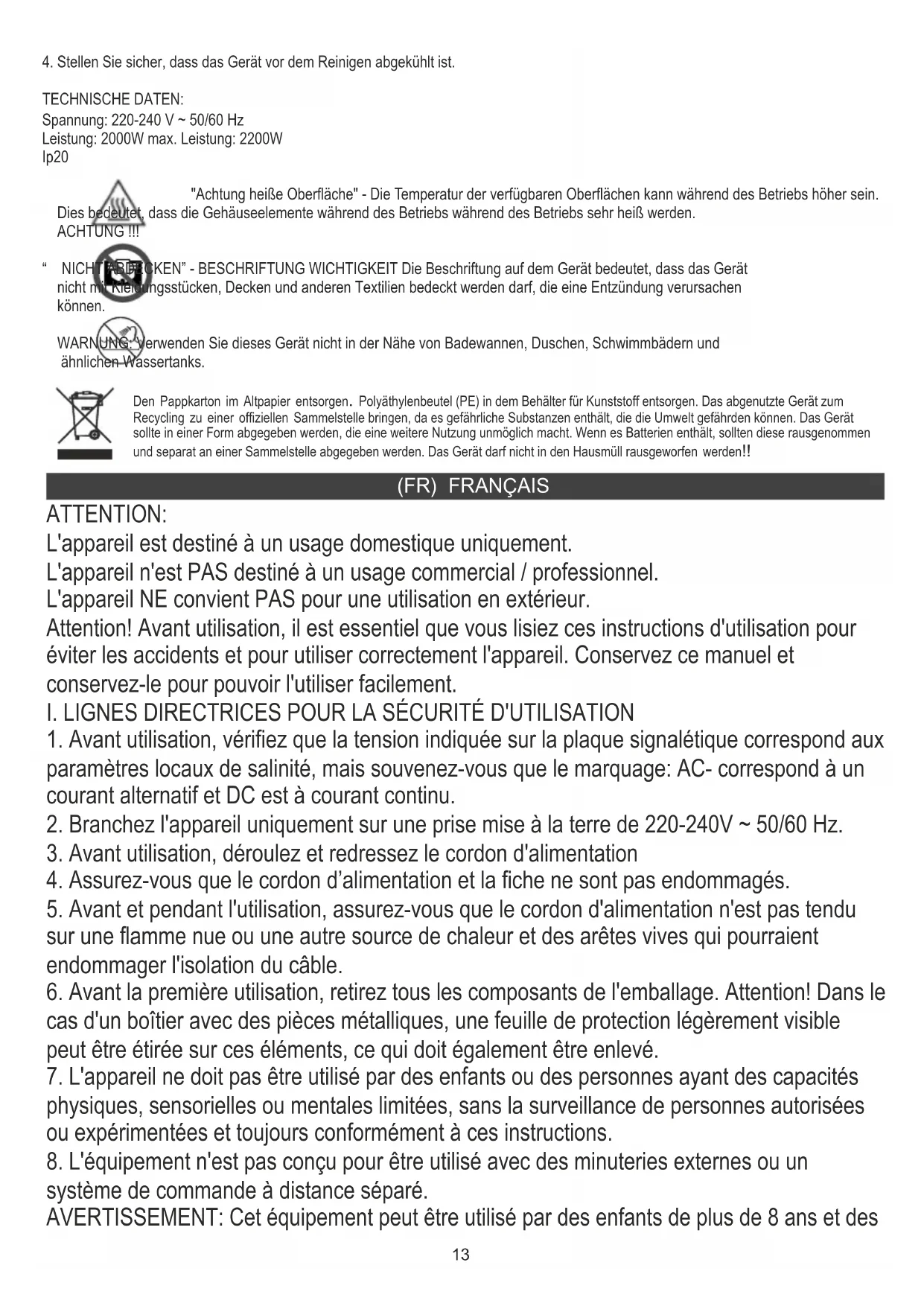 DONNÉES TECHNIQUES: Tension: 220-240V ~ 50 / 60Hz Puissance: 2000W Max. Puissance: 2200W Ip20 "Attention, surface chaude" - La température des surfaces disponibles peut être plus élevée lorsque l'équipement est en fonctionnement, ce qui signifie que les éléments du boîtier deviennent très chauds pendant le fonctionnement, CONSERVEZ ATTENTION !!! “ NE PAS COUVRIR” - IMPORTANCE DE L'INSCRIPTION L'inscription sur l'appareil signifie que l'appareil ne doit pas être recouvert de vêtements, couvertures ou autres produits textiles pouvant provoquer une inflammation.