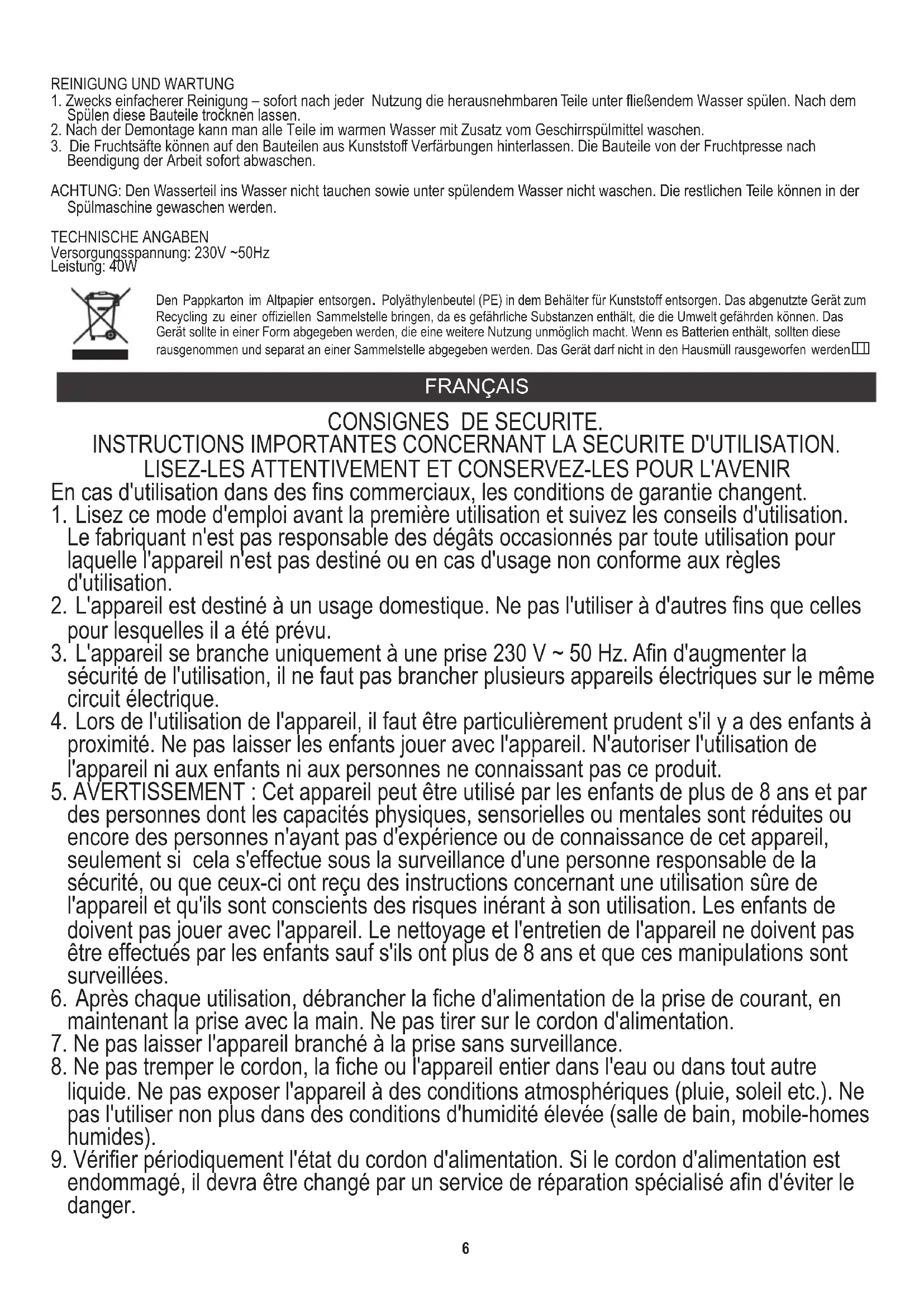 3. Les éléments en plastique peuvent se décolorer à cause des jus. Lavez-les immédiatement après la fin de travail avec centrifugeuse. Tension d'alimentation: 230V ~50Hz Puissance: 40W 1. Pour le nettoyage plus facile -immédiatement après chaque utilisation rincez les pièces amovibles sous l'eau courante. Après rinçage, laisser les éléments sécher.