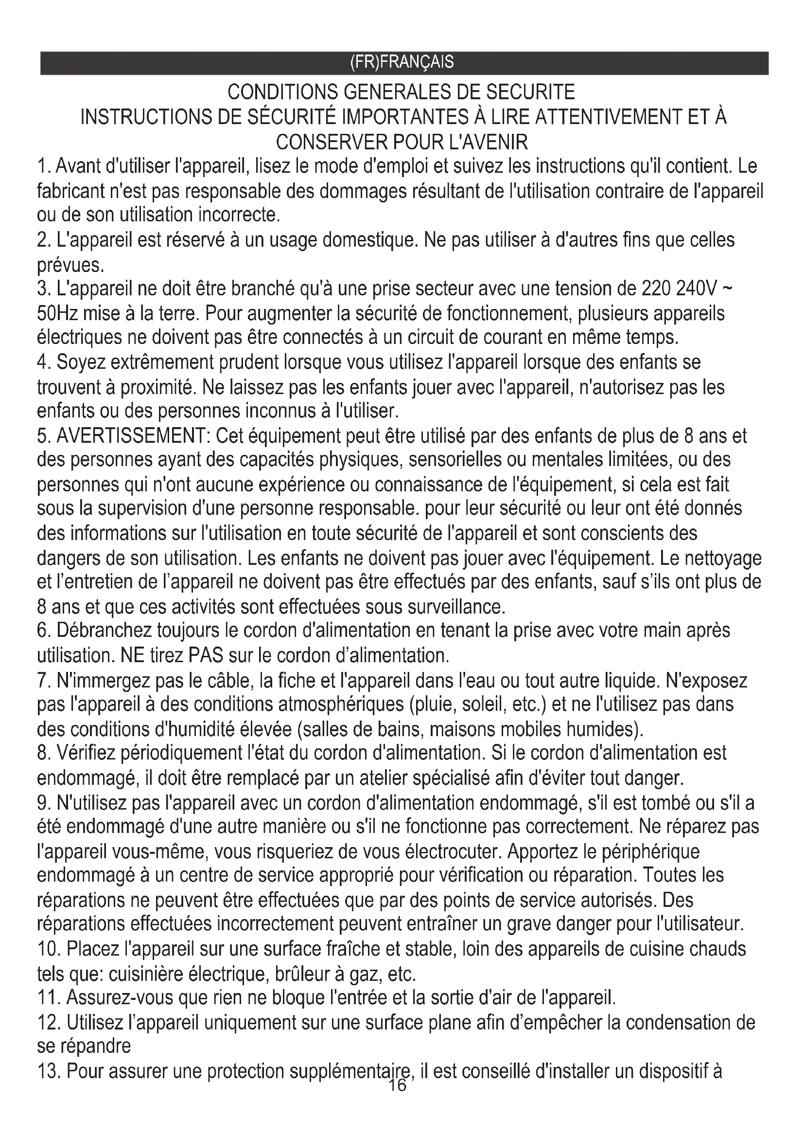 9. N'utilisez pas l'appareil avec un cordon d'alimentation endommagé, s'il est tombé ou s'il a