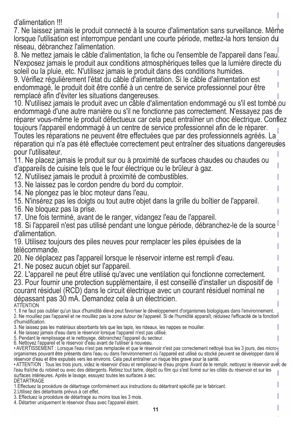 Leistung: 60W TECHNISCHE DATEN: Stromquelle: 220-240 V ~ 50 Hz Wasserverbrauch: 300 ml / Stunde11 DÉTARTRAGE 2. Ne mouillez pas l'appareil et ne mouillez pas la zone autour de l'appareil. Si de l'humidité apparaît, réduisez l'efficacité de la fonction d'humidification. 1.Effectuez la procédure de détartrage conformément aux instructions du détartrant spécifié par le fabricant. 2.Utilisez des détartrants prévus à cet effet.