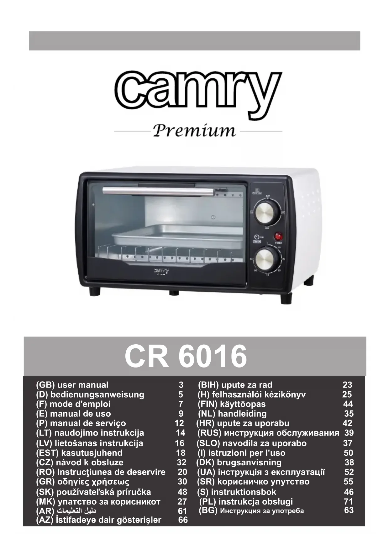 Téléchargez la notice de votre Four au format PDF gratuitement ! Retrouvez votre notice CR 6016 - CAMRY et reprennez votre appareil électronique en main. Sur cette page sont publiés tous les documents nécessaires à l'utilisation de votre appareil CR 6016 de la marque CAMRY.