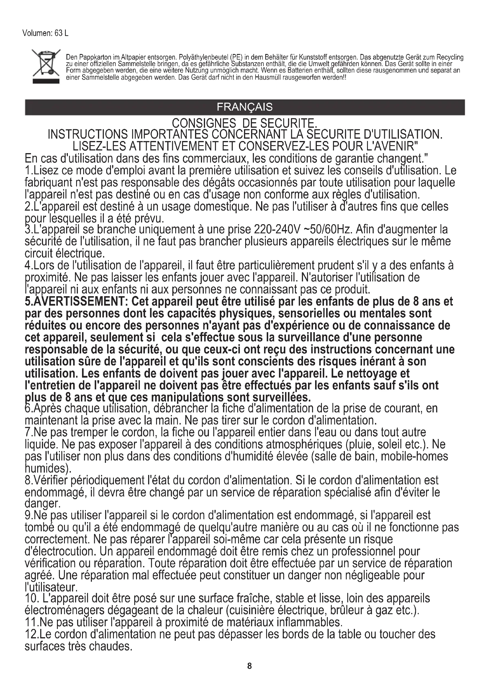 électroménagers dégageant de la chaleur (cuisinière électrique, brûleur à gaz etc.). 8.Vérifier périodiquement l'état du cordon d'alimentation. Si le cordon d'alimentation est endommagé, il devra être changé par un service de réparation spécialisé afin d'éviter le danger. INSTRUCTIONS IMPORTANTES CONCERNANT LA SECURITE D'UTILISATION. 5.AVERTISSEMENT: Cet appareil peut être utilisé par les enfants de plus de 8 ans et par des personnes dont les capacités physiques, sensorielles ou mentales sont réduites ou encore des personnes n'ayant pas d'expérience ou de connaissance de cet appareil, seulement si cela s'effectue sous la surveillance d'une personne responsable de la sécurité, ou que ceux-ci ont reçu des instructions concernant une utilisation sûre de l'appareil et qu'ils sont conscients des risques inérant à son utilisation. Les enfants de doivent pas jouer avec l'appareil. Le nettoyage et l'entretien de l'appareil ne doivent pas être effectués par les enfants sauf s'ils ont plus de 8 ans et que ces manipulations sont surveillées. 1.Lisez ce mode d'emploi avant la première utilisation et suivez les conseils d'utilisation. Le fabriquant n'est pas responsable des dégâts occasionnés par toute utilisation pour laquelle l'appareil n'est pas destiné ou en cas d'usage non conforme aux règles d'utilisation.