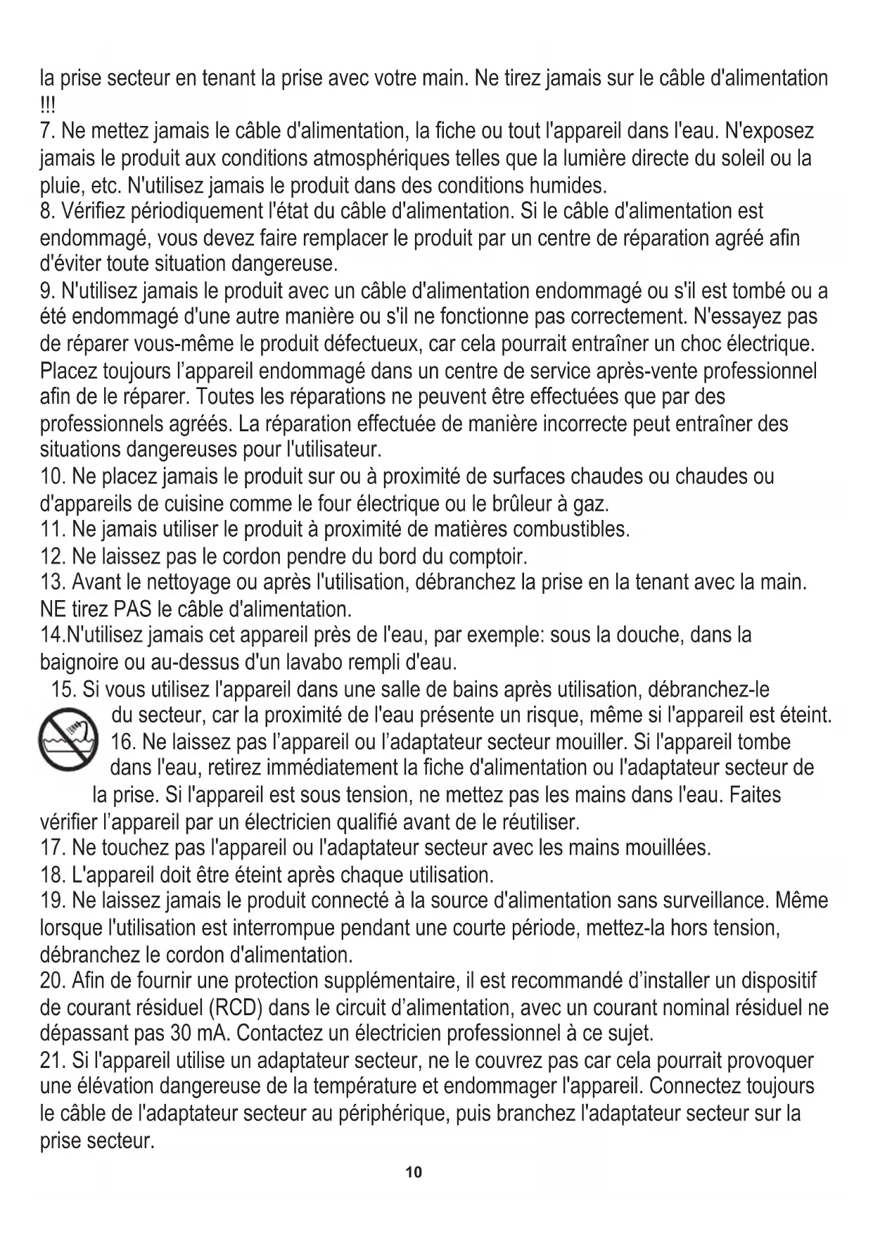 NE tirez PAS le câble d'alimentation. 14.N'utilisez jamais cet appareil près de l'eau, par exemple: sous la douche, dans la baignoire ou au-dessus d'un lavabo rempli d'eau.