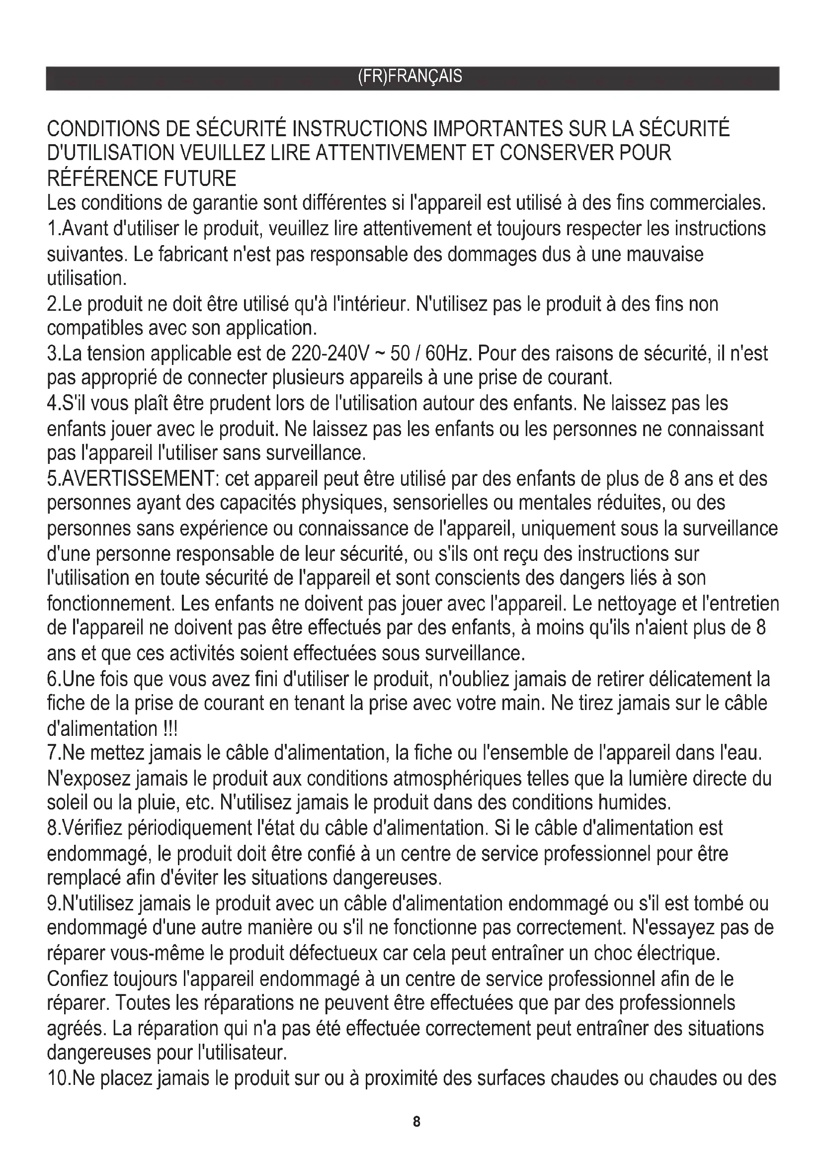 3.La tension applicable est de 220-240V ~ 50 / 60Hz. Pour des raisons de sécurité, il n'est pas approprié de connecter plusieurs appareils à une prise de courant. 5.AVERTISSEMENT: cet appareil peut être utilisé par des enfants de plus de 8 ans et des personnes ayant des capacités physiques, sensorielles ou mentales réduites, ou des personnes sans expérience ou connaissance de l'appareil, uniquement sous la surveillance d'une personne responsable de leur sécurité, ou s'ils ont reçu des instructions sur l'utilisation en toute sécurité de l'appareil et sont conscients des dangers liés à son fonctionnement. Les enfants ne doivent pas jouer avec l'appareil. Le nettoyage et l'entretien de l'appareil ne doivent pas être effectués par des enfants, à moins qu'ils n'aient plus de 8 ans et que ces activités soient effectuées sous surveillance. 8.Vérifiez périodiquement l'état du câble d'alimentation. Si le câble d'alimentation est endommagé, le produit doit être confié à un centre de service professionnel pour être remplacé afin d'éviter les situations dangereuses. 1.Avant d'utiliser le produit, veuillez lire attentivement et toujours respecter les instructions suivantes. Le fabricant n'est pas responsable des dommages dus à une mauvaise utilisation. 7.Ne mettez jamais le câble d'alimentation, la fiche ou l'ensemble de l'appareil dans l'eau. N'exposez jamais le produit aux conditions atmosphériques telles que la lumière directe du soleil ou la pluie, etc. N'utilisez jamais le produit dans des conditions humides. 10.Ne placez jamais le produit sur ou à proximité des surfaces chaudes ou chaudes ou des Les conditions de garantie sont différentes si l'appareil est utilisé à des fins commerciales.9 13.Ne laissez jamais le produit connecté à la source d'alimentation sans surveillance. Même lorsque l'utilisation est interrompue pendant une courte période, éteignez-la du réseau, débranchez l'alimentation. fonctionne. Ne touchez jamais les surfaces chaudes de l'appareil.