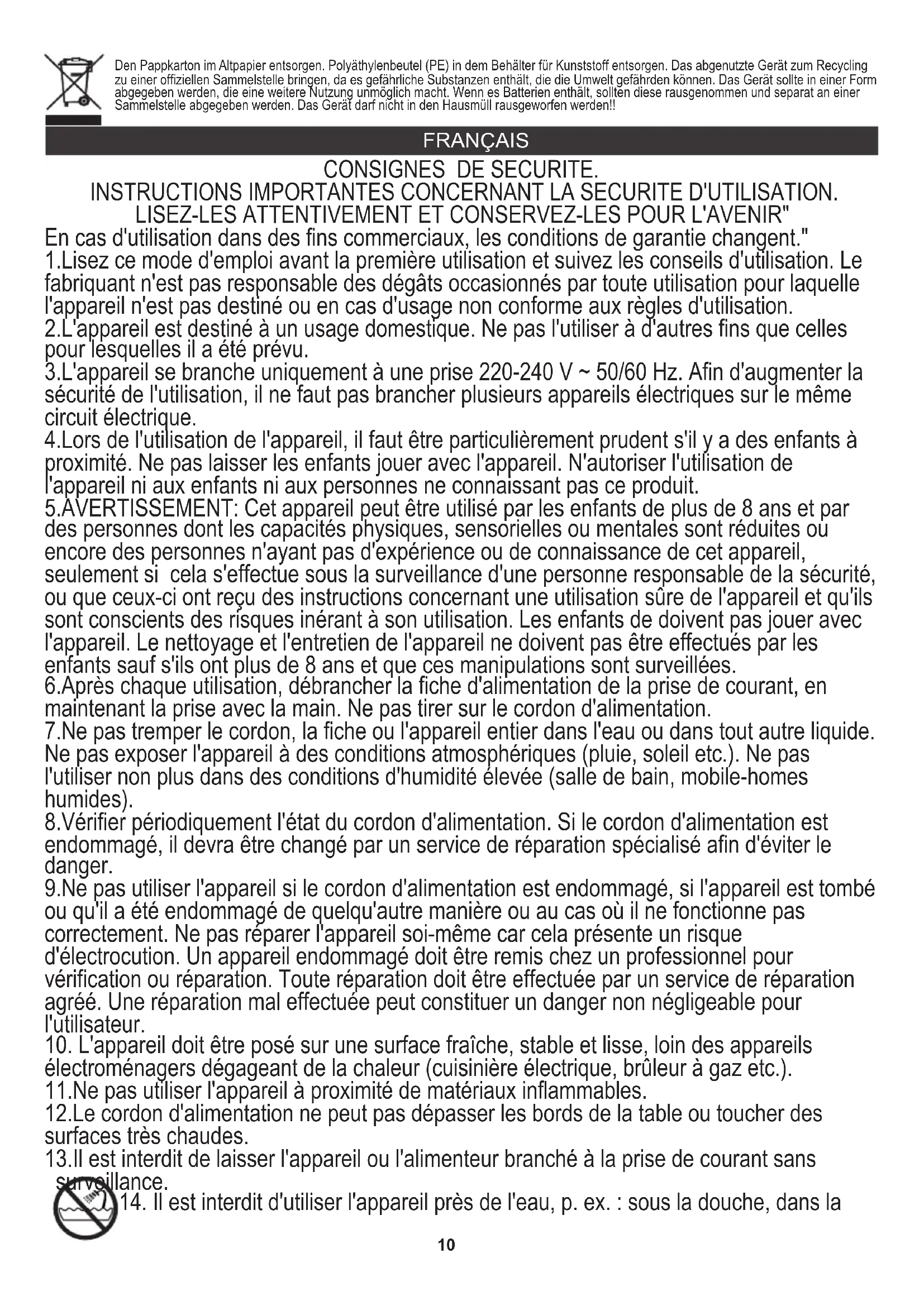En cas d'utilisation dans des fins commerciaux, les conditions de garantie changent." 1.Lisez ce mode d'emploi avant la première utilisation et suivez les conseils d'utilisation. Le fabriquant n'est pas responsable des dégâts occasionnés par toute utilisation pour laquelle l'appareil n'est pas destiné ou en cas d'usage non conforme aux règles d'utilisation. 2.L'appareil est destiné à un usage domestique. Ne pas l'utiliser à d'autres fins que celles pour lesquelles il a été prévu. 3.L'appareil se branche uniquement à une prise 220-240 V ~ 50/60 Hz. Afin d'augmenter la sécurité de l'utilisation, il ne faut pas brancher plusieurs appareils électriques sur le même circuit électrique. 4.Lors de l'utilisation de l'appareil, il faut être particulièrement prudent s'il y a des enfants à proximité. Ne pas laisser les enfants jouer avec l'appareil. N'autoriser l'utilisation de l'appareil ni aux enfants ni aux personnes ne connaissant pas ce produit. 5.AVERTISSEMENT: Cet appareil peut être utilisé par les enfants de plus de 8 ans et par des personnes dont les capacités physiques, sensorielles ou mentales sont réduites ou encore des personnes n'ayant pas d'expérience ou de connaissance de cet appareil, seulement si cela s'effectue sous la surveillance d'une personne responsable de la sécurité, ou que ceux-ci ont reçu des instructions concernant une utilisation sûre de l'appareil et qu'ils sont conscients des risques inérant à son utilisation. Les enfants de doivent pas jouer avec l'appareil. Le nettoyage et l'entretien de l'appareil ne doivent pas être effectués par les enfants sauf s'ils ont plus de 8 ans et que ces manipulations sont surveillées. 6.Après chaque utilisation, débrancher la fiche d'alimentation de la prise de courant, en maintenant la prise avec la main. Ne pas tirer sur le cordon d'alimentation. 7.Ne pas tremper le cordon, la fiche ou l'appareil entier dans l'eau ou dans tout autre liquide. Ne pas exposer l'appareil à des conditions atmosphériques (pluie, soleil etc.). Ne pas l'utiliser non plus dans des conditions d'humidité élevée (salle de bain, mobile-homes humides). 8.Vérifier périodiquement l'état du cordon d'alimentation. Si le cordon d'alimentation est endommagé, il devra être changé par un service de réparation spécialisé afin d'éviter le danger. 9.Ne pas utiliser l'appareil si le cordon d'alimentation est endommagé, si l'appareil est tombé ou qu'il a été endommagé de quelqu'autre manière ou au cas où il ne fonctionne pas correctement. Ne pas réparer l'appareil soi-même car cela présente un risque d'électrocution. Un appareil endommagé doit être remis chez un professionnel pour vérification ou réparation. Toute réparation doit être effectuée par un service de réparation agréé. Une réparation mal effectuée peut constituer un danger non négligeable pour l'utilisateur.