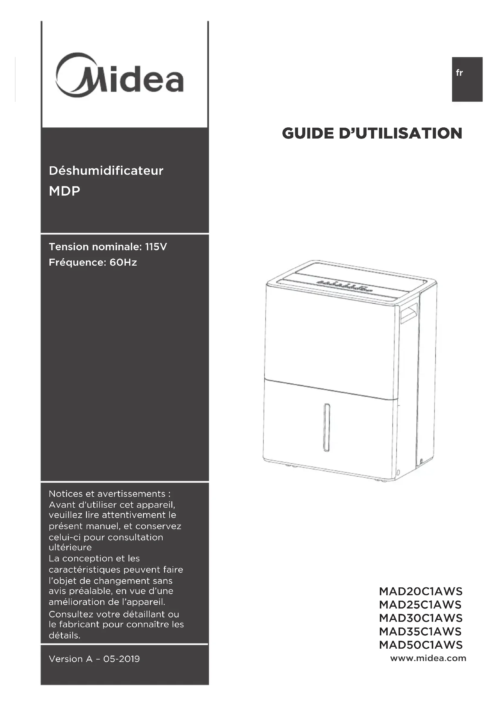 MDP Notices et avertissements : Avant d’utiliser cet appareil, veuillez lire attentivement le présent manuel, et conservez celui-ci pour consultation ultérieureLa conception et les caractéristiques peuvent faire l’objet de changement sans avis préalable, en vue d’une amélioration de l’appareil.Consultez votre détaillant ou le fabricant pour connaître les détails.Version A – 05-2019 Tension nominale: 115V Fréquence: 60Hz