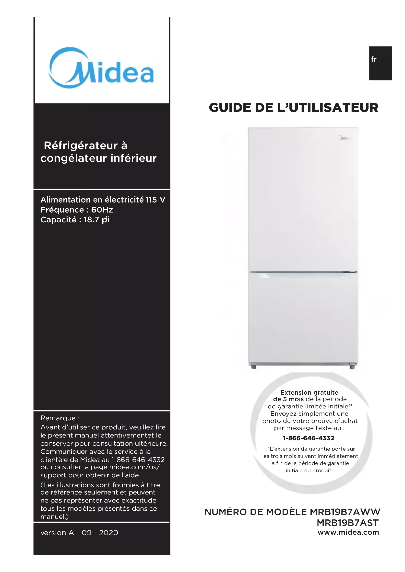 Remarque :Avant d’utiliser ce produit, veuillez lire le présent manuel attentivementet le conserver pour consultation ultérieure. Communiquer avec le service à la clientèle de Midea au 1-866-646-4332 ou consulter la page midea.com/us/support pour obtenir de l’aide.(Les illustrations sont fournies à titre de référence seulement et peuvent ne pas représenter avec exactitude tous les modèles présentés dans ce manuel.) Alimentation en électricité : 115 V Fréquence : 60Hz Capacité : 18.7 pi