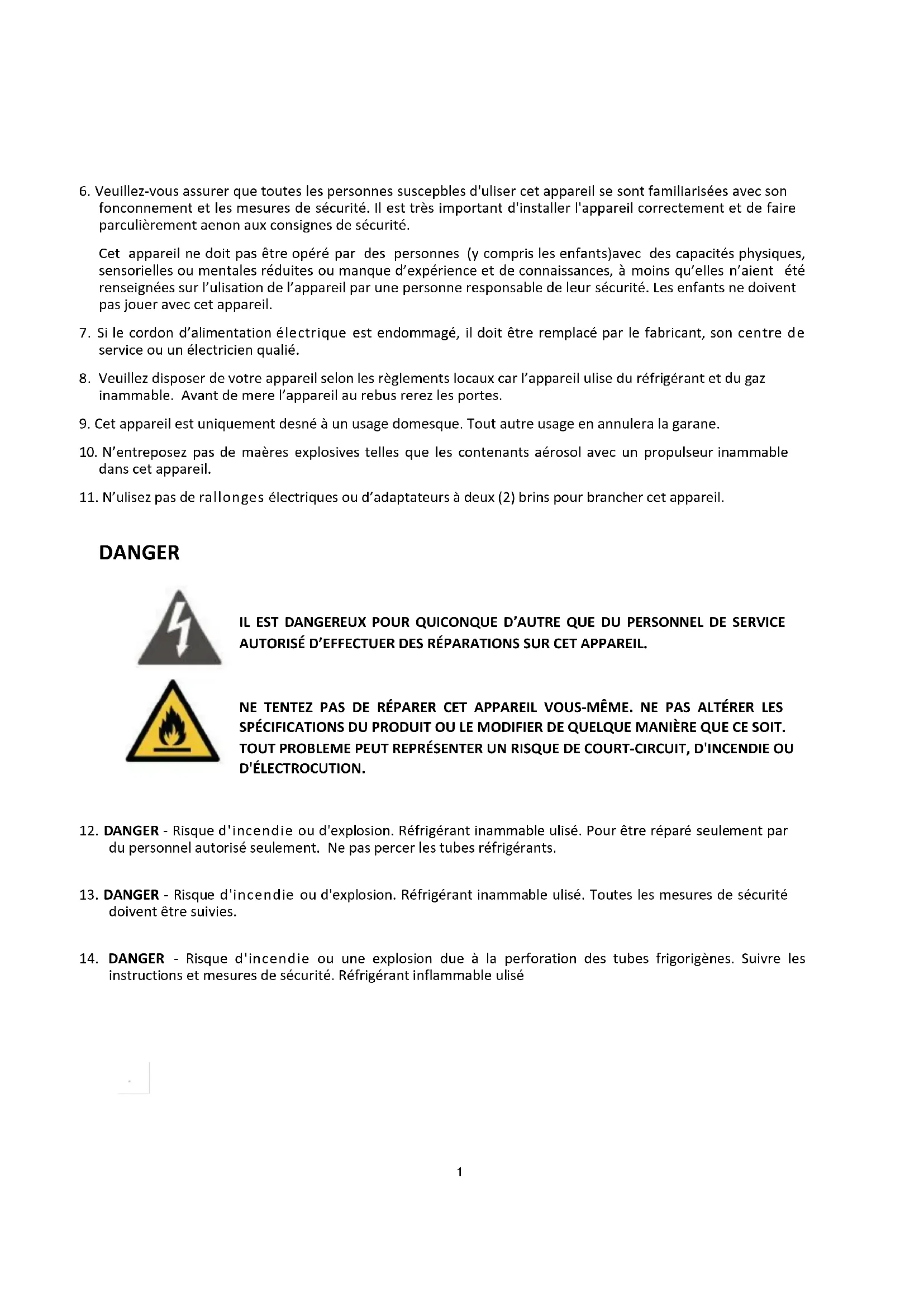 13. DANGER - Risque d'incendie ou d'explosion. Réfrigérant inflammable utilisé. Toutes les mesures de sécurité