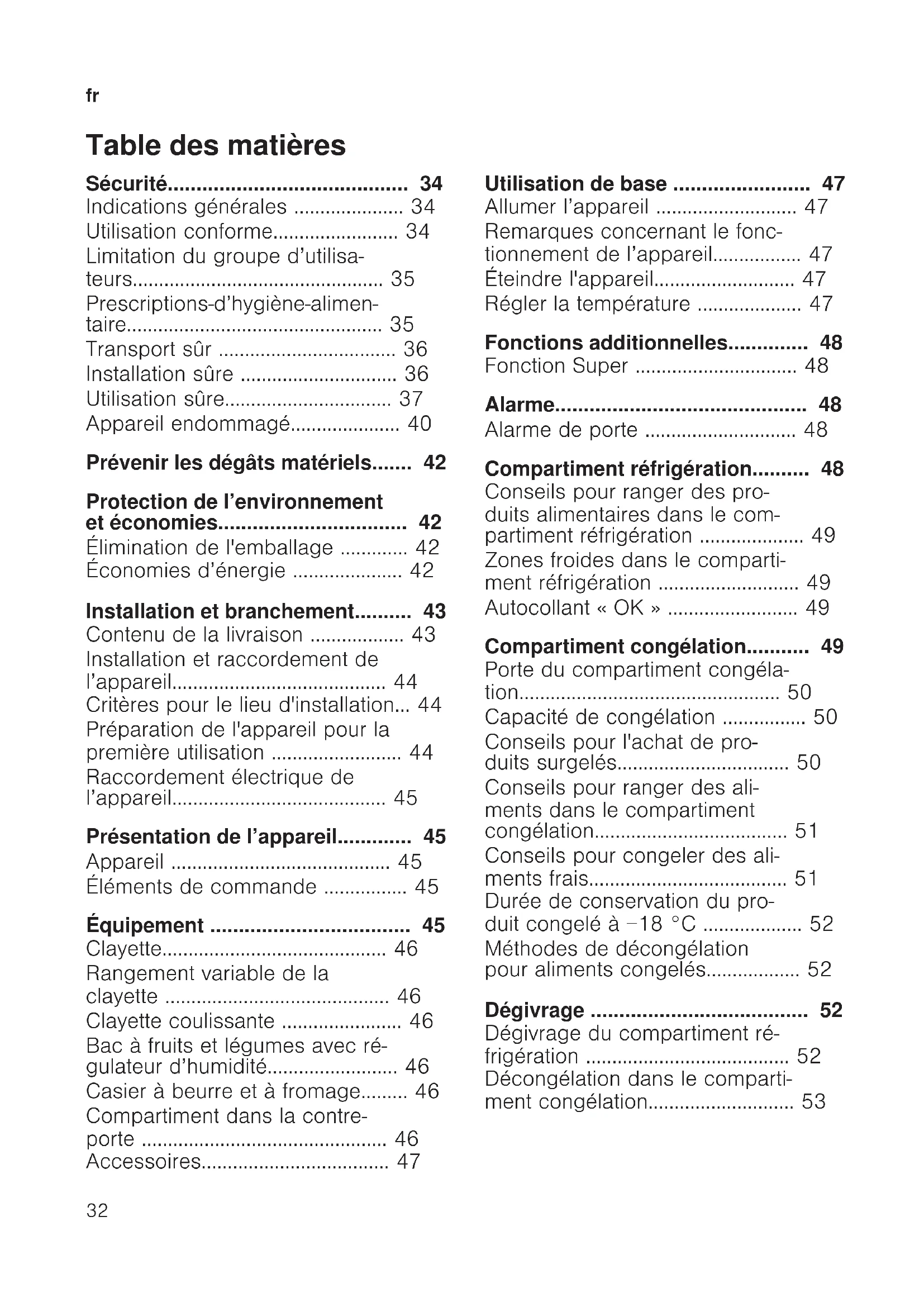Sécurité Respectez les informations relatives à la sécurité afin d’utiliser votre appareil en toute sécurité. Cet appareil est conforme aux dispositions de sécurité appli- cables aux appareils électriques et il est déparasité. Indications générales Vous trouverez ici des informations générales sur la présente no- tice. ¡ Lisez attentivement cette notice. C’est en effet la seule manière d’utiliser l’appareil de manière sûre et efficace. ¡ Cette notice d’utilisation s’adresse à l'utilisateur de l’appareil. ¡ Respectez les consignes de sécurité et les avertissements. ¡ Conservez la notice ainsi que les informations produit en vue d’une réutilisation ultérieure ou pour un futur nouveau proprié- taire. ¡ Contrôlez l’appareil après l’avoir déballé. Ne raccordez pas l’ap- pareil si ce dernier a été endommagé durant le transport. Utilisation conforme Pour utiliser l’appareil correctement et en toute sécurité, respectez les consignes d'utilisation conforme. Cet appareil est conçu pour être encastré uniquement. Respecter les instructions d'installation. Utilisez l’appareil uniquement: ¡ en conformité avec la présente notice d’utilisation. ¡ pour réfrigérer et congeler des produits alimentaires, et pour préparer de la glace. ¡ pour un usage privé et dans les pièces fermées d’un domicile. ¡ jusqu’à une altitude maximale de 2000m.Sécurité fr