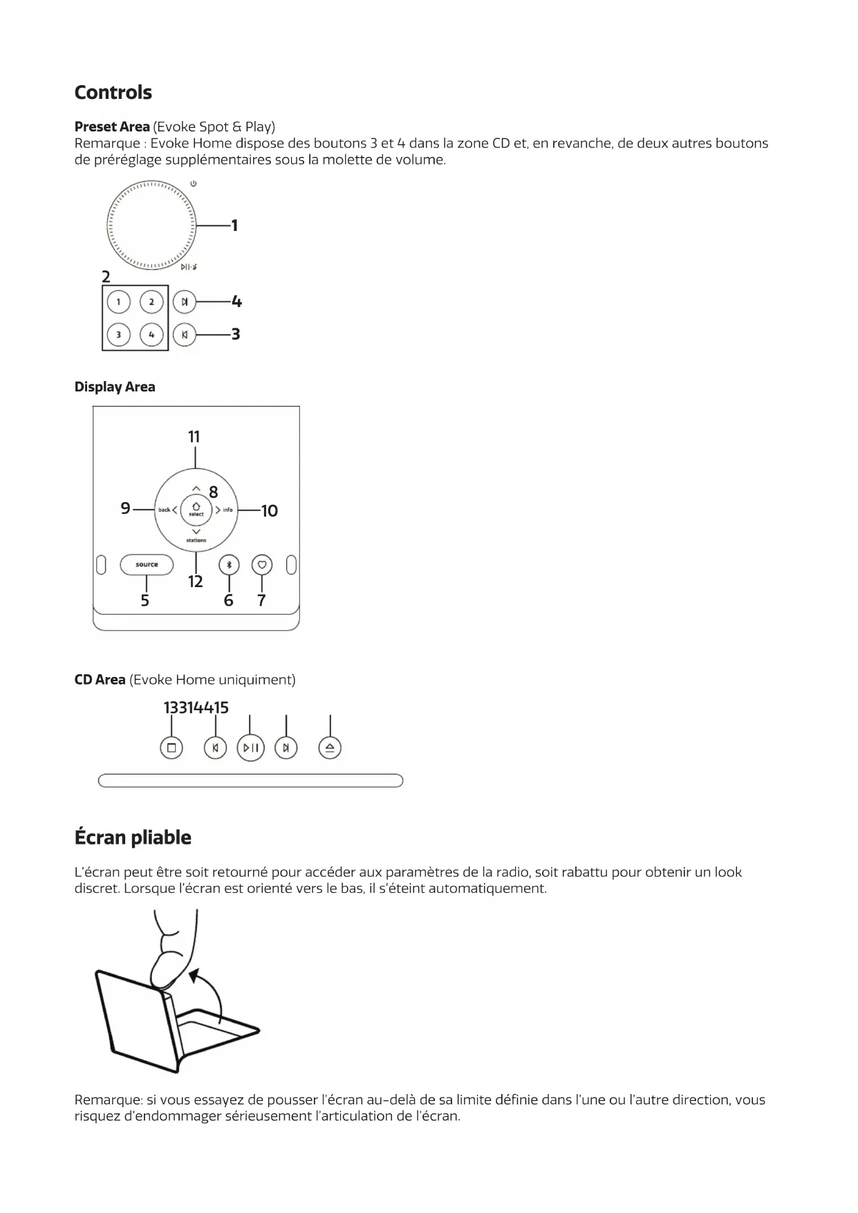 DAB 18:30 Radio 1 Music for a new generationFrançaisControls Preset Area (Evoke Spot & Play) Remarque : Evoke Home dispose des boutons 3 et 4 dans la zone CD et, en revanche, de deux autres boutons de préréglage supplémentaires sous la molette de volume. Display Area CD Area (Evoke Home uniquiment) Écran pliable L’écran peut être soit retourné pour accéder aux paramètres de la radio, soit rabattu pour obtenir un look discret. Lorsque l’écran est orienté vers le bas, il s’éteint automatiquement. Remarque: si vous essayez de pousser l’écran au-delà de sa limite définie dans l’une ou l’autre direction, vous risquez d’endommager sérieusement l’articulation de l’écran.