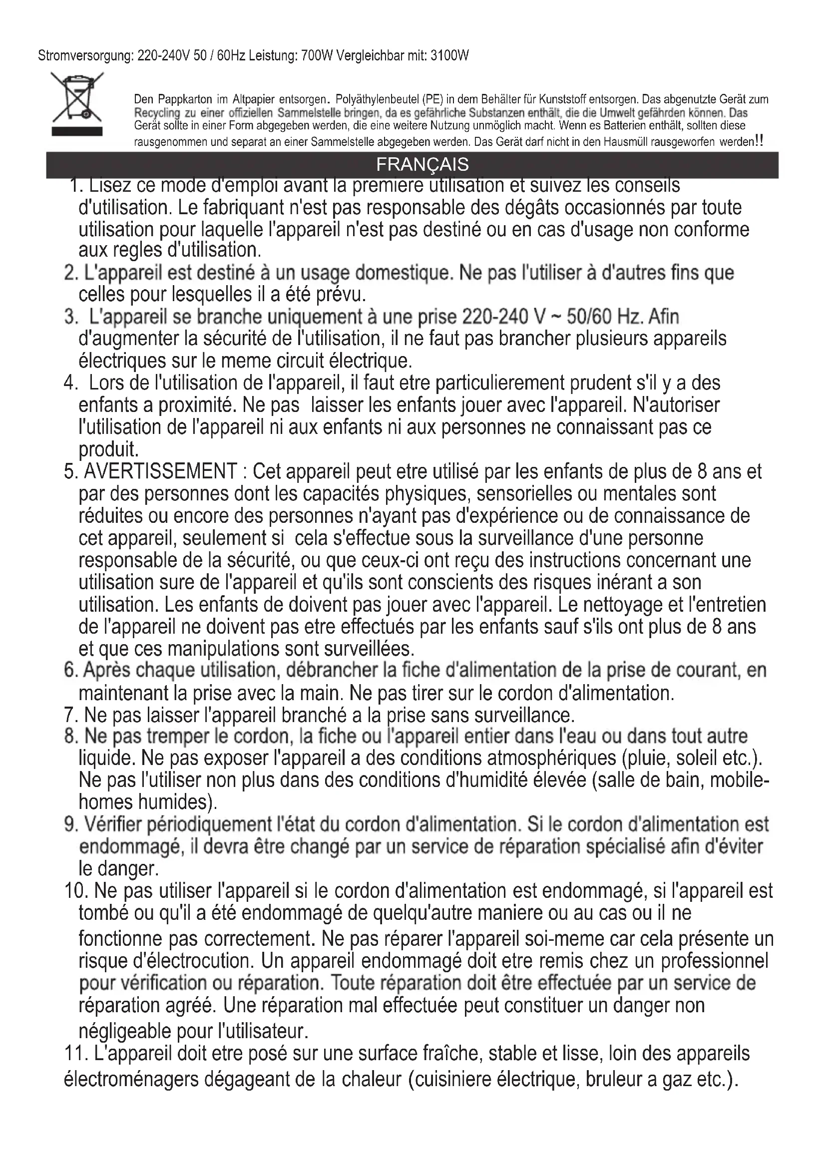 électroménagers dégageant de la chaleur (cuisiniere électrique, bruleur a gaz etc.). FRANÇAIS Stromversorgung: 220-240V 50 / 60Hz Leistung: 700W Vergleichbar mit: 3100W13. Le cordon d'alimentation ne peut pas dépasser les bords de la table ou toucher des surfaces tres chaudes.