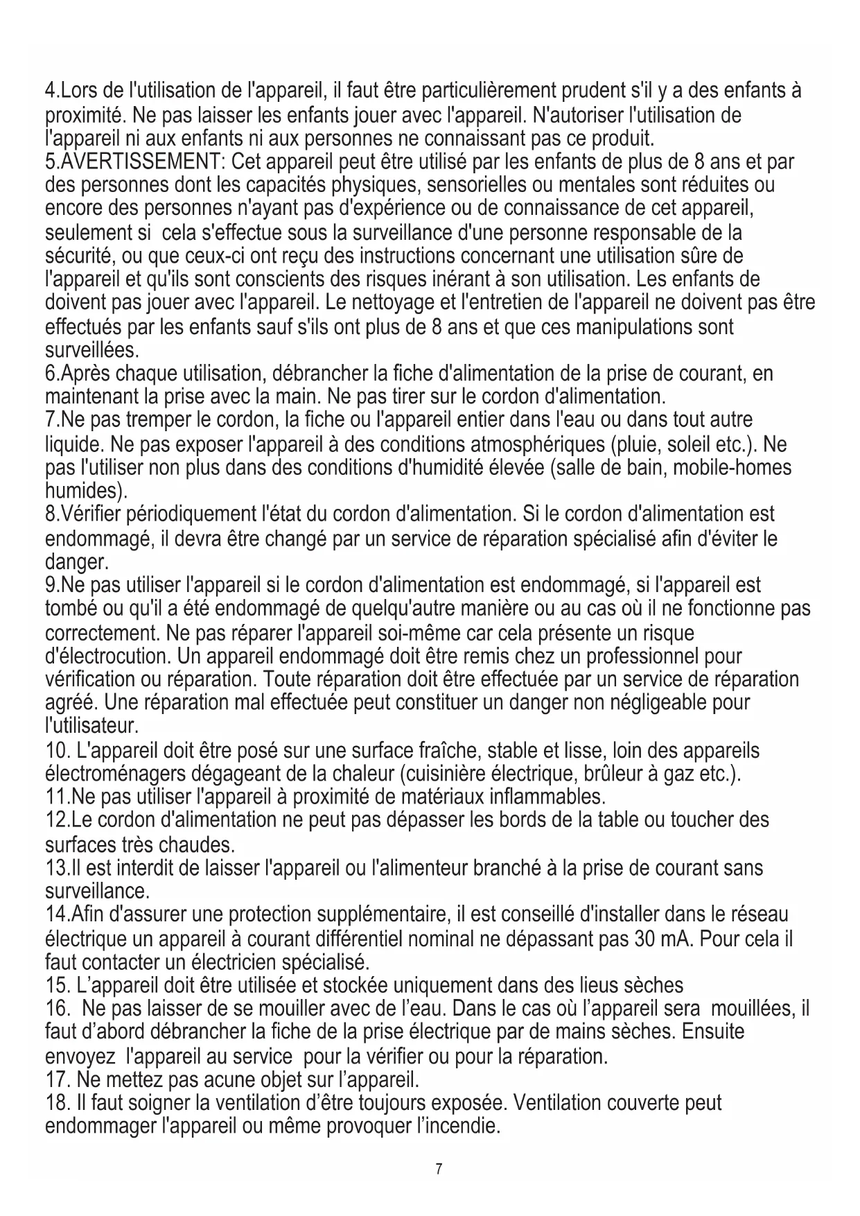 électroménagers dégageant de la chaleur (cuisinière électrique, brûleur à gaz etc.). 11.Ne pas utiliser l'appareil à proximité de matériaux inflammables. 12.Le cordon d'alimentation ne peut pas dépasser les bords de la table ou toucher des surfaces très chaudes. 13.Il est interdit de laisser l'appareil ou l'alimenteur branché à la prise de courant sans surveillance. 14.Afin d'assurer une protection supplémentaire, il est conseillé d'installer dans le réseau électrique un appareil à courant différentiel nominal ne dépassant pas 30 mA. Pour cela il faut contacter un électricien spécialisé.