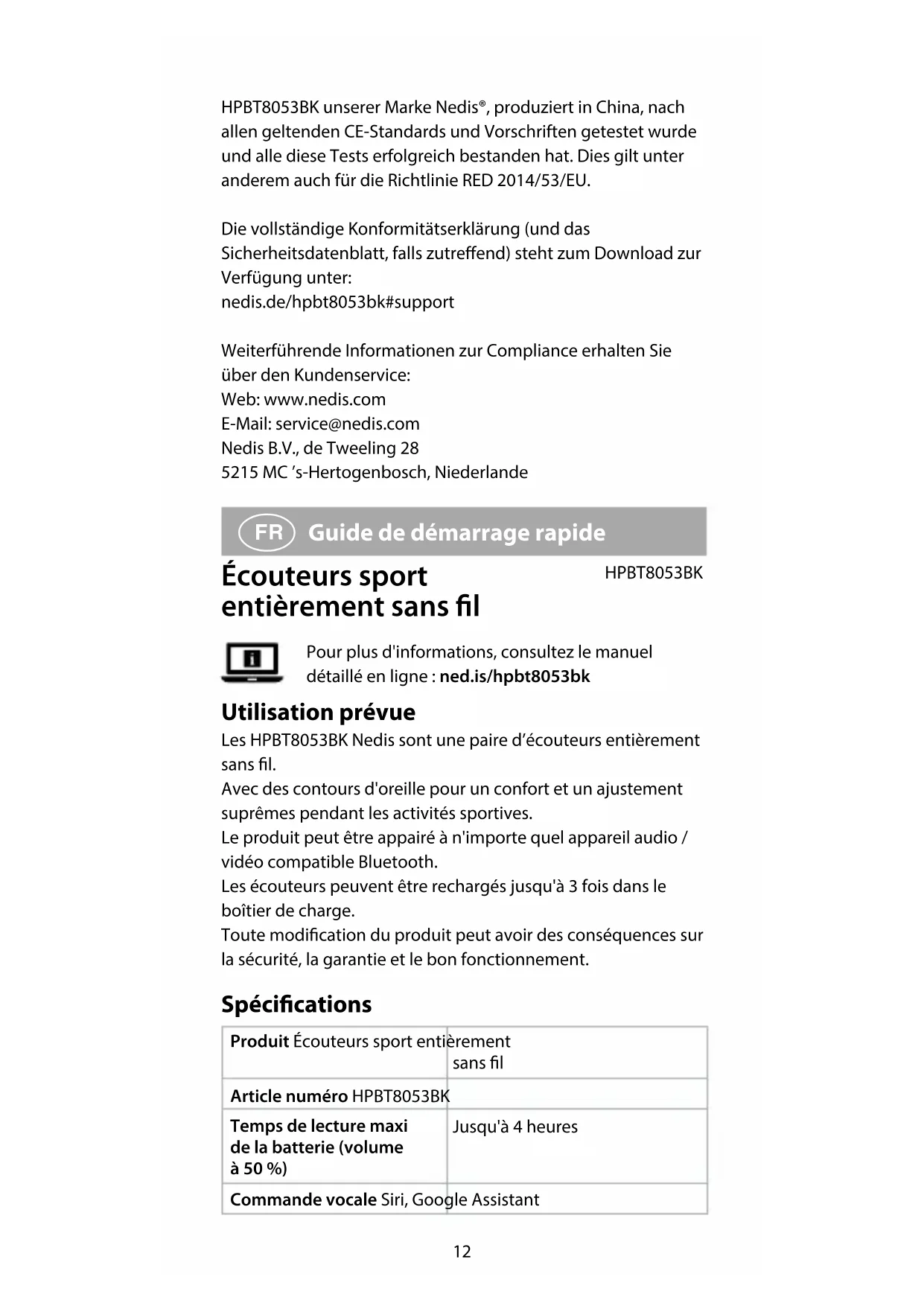 et A pendant 8 secondes. Il est suggéré d'utiliser cette fonction lorsque les écouteurs ne peuvent pas se connecter l’un à l’autre dans les conditions d'utilisation courante. Déclaration de conformité Nous, Nedis B.V., déclarons en tant que fabricant que le produit HPBT8053BK de notre marque Nedis®, produit en Chine, a été testé conformément à toutes les normes et réglementations CE en vigueur et que tous les tests ont été réussis. Cela inclut, sans toutefois s'y limiter, la directive RED 2014/53/UE.La Déclaration de conformité complète (et la che de sécurité le cas échéant) peut être trouvée et téléchargée via :nedis.fr/hpbt8053bk#supportPour plus d'informations sur la conformité, contactez le service client:Site Web: www.nedis.comE-mail: service@nedis.comNedis B.V., de Tweeling 285215 MC ’s-Hertogenbosch, Pays-Bas