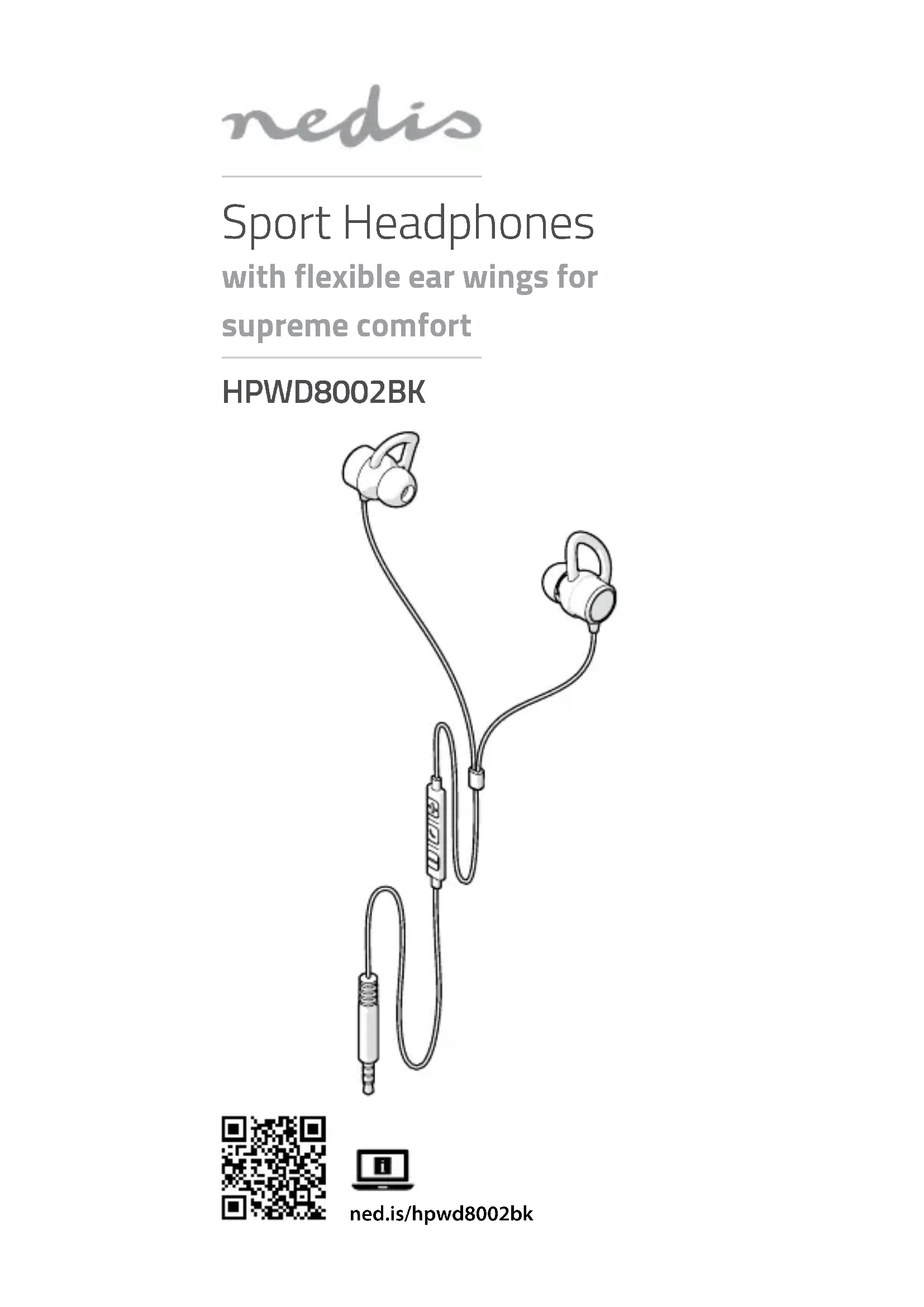 Guide de démarrage rapide Écouteurs de sport HPWD8002BK Pour plus d'informations, consultez le manuel détaillé en ligne : ned.is/hpwd8002bk Utilisation prévue Les HPWD8002BK sont une paire d’écouteurs laires intra- auriculaires à microphone intégré. Les ailettes d'oreille exibles assurent un ajustement et une stabilité sûrs. Le produit n’est pas destiné à un usage professionnel. Toute modication du produit peut avoir des conséquences sur la sécurité, la garantie et le bon fonctionnement. Spécications Produit Écouteurs de sport Article numéro HPWD8002BK Réponse en fréquence 20 Hz - 20000 Hz Sensibilité du casque 90 dB ± 3 dB Taille du moteur 10 mm Impédance 16 Ω Connexion Prise audio 3,5 mm Longueur de câble 1,2 m Microphone Intégré