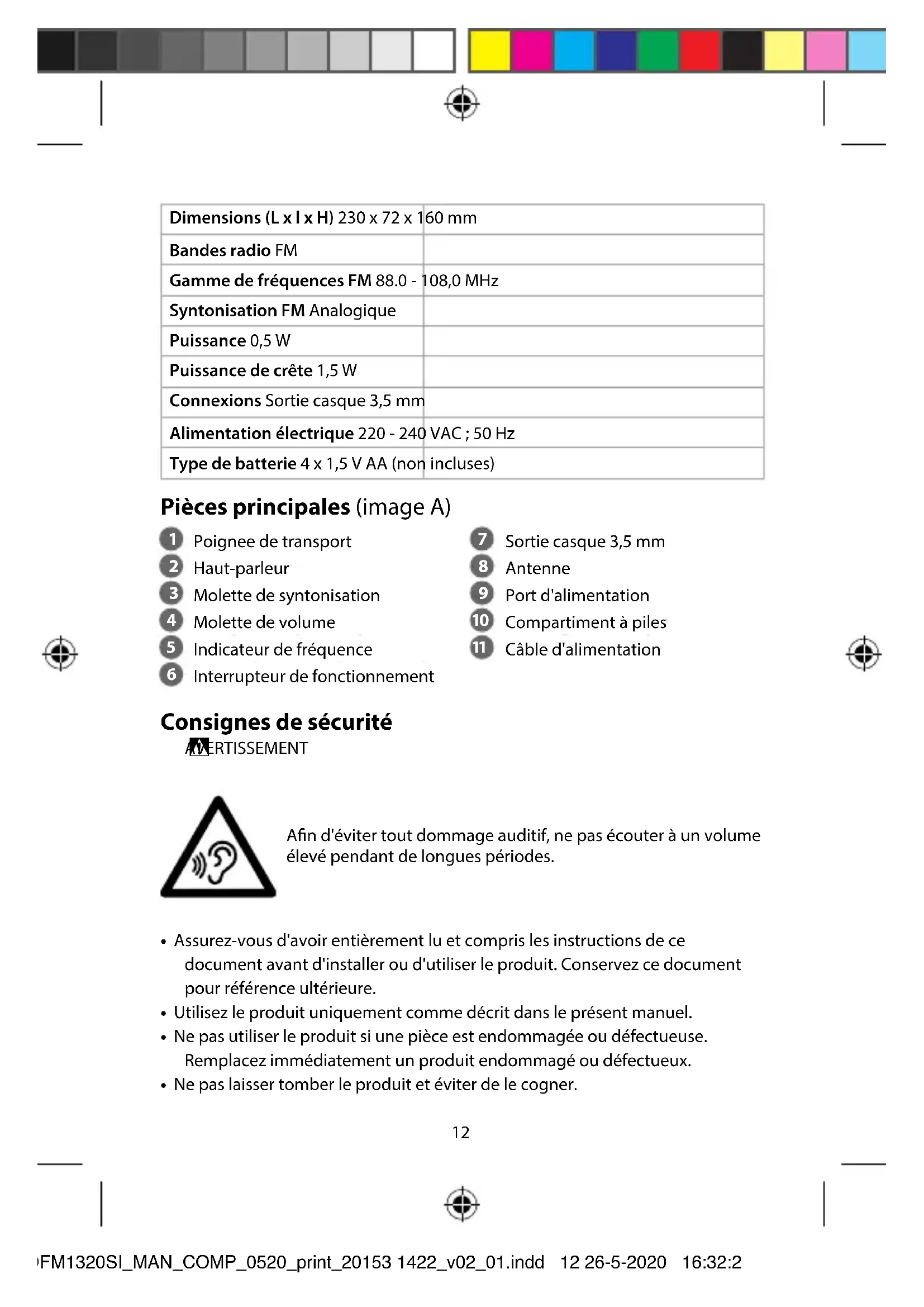 Guide de démarrage rapide Radio FM RDFM1320SI Pour plus d'informations, consultez le manuel détaillé en ligne : ned.is/rdfm1320si Utilisation prévue La RDFM1320SI est une radio AM/FM portable qui peut être utilisée en déplacement avec des piles ou peut être connectée à une prise de courant. Le produit n’est pas destiné à un usage professionnel. Toute modication du produit peut avoir des conséquences sur la sécurité, la garantie et le bon fonctionnement. Spécications Produit Radio FM Article numéro RDFM1320SI RDFM1320SI_MAN_COMP_0520_print_20153 1422_v02_01.indd 11 26-5-2020 16:32:2112 Dimensions (L x l x H) 230 x 72 x 160 mm Bandes radio FM Gamme de fréquences FM 88.0 - 108,0 MHz Syntonisation FM Analogique Puissance 0,5 W Puissance de crête 1,5 W Connexions Sortie casque 3,5 mm Alimentation électrique 220 - 240 VAC ; 50 Hz Type de batterie 4 x 1,5 V AA (non incluses) Pièces principales (image A)
