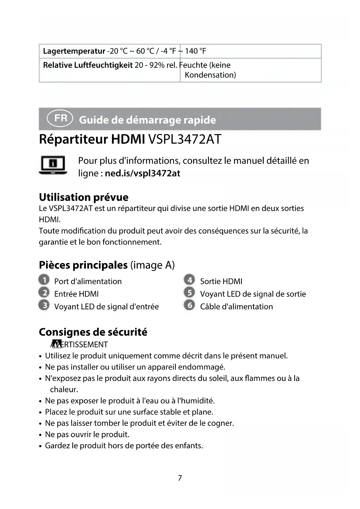 Guide de démarrage rapide Répartiteur HDMI VSPL3472AT Pour plus d'informations, consultez le manuel détaillé en ligne: ned.is/vspl3472at Utilisation prévue Le VSPL3472AT est un répartiteur qui divise une sortie HDMI en deux sorties HDMI.Toute modication du produit peut avoir des conséquences sur la sécurité, la garantie et le bon fonctionnement. Pièces principales (image A)