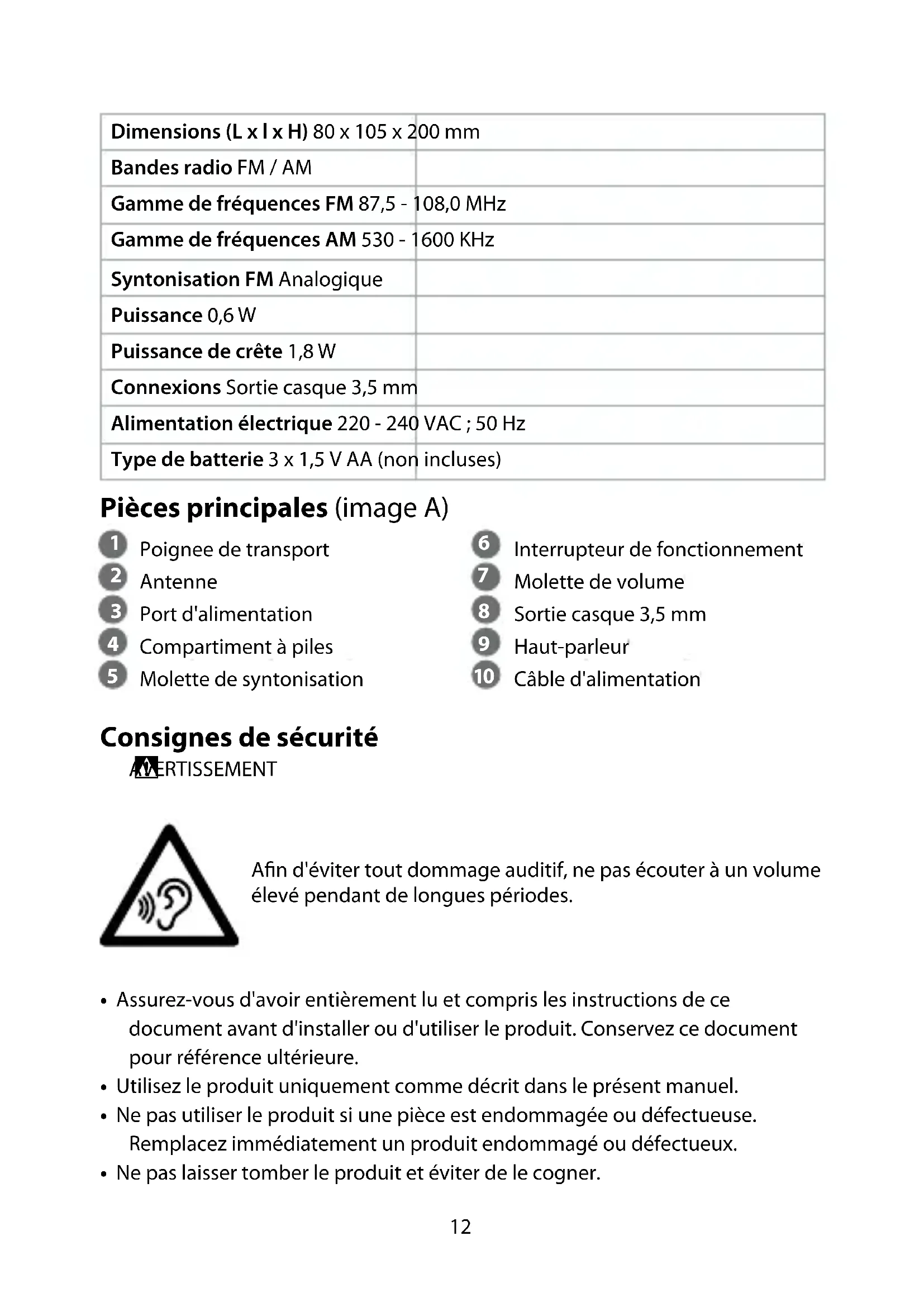 AVERTISSEMENT An d'éviter tout dommage auditif, ne pas écouter à un volume élevé pendant de longues périodes.