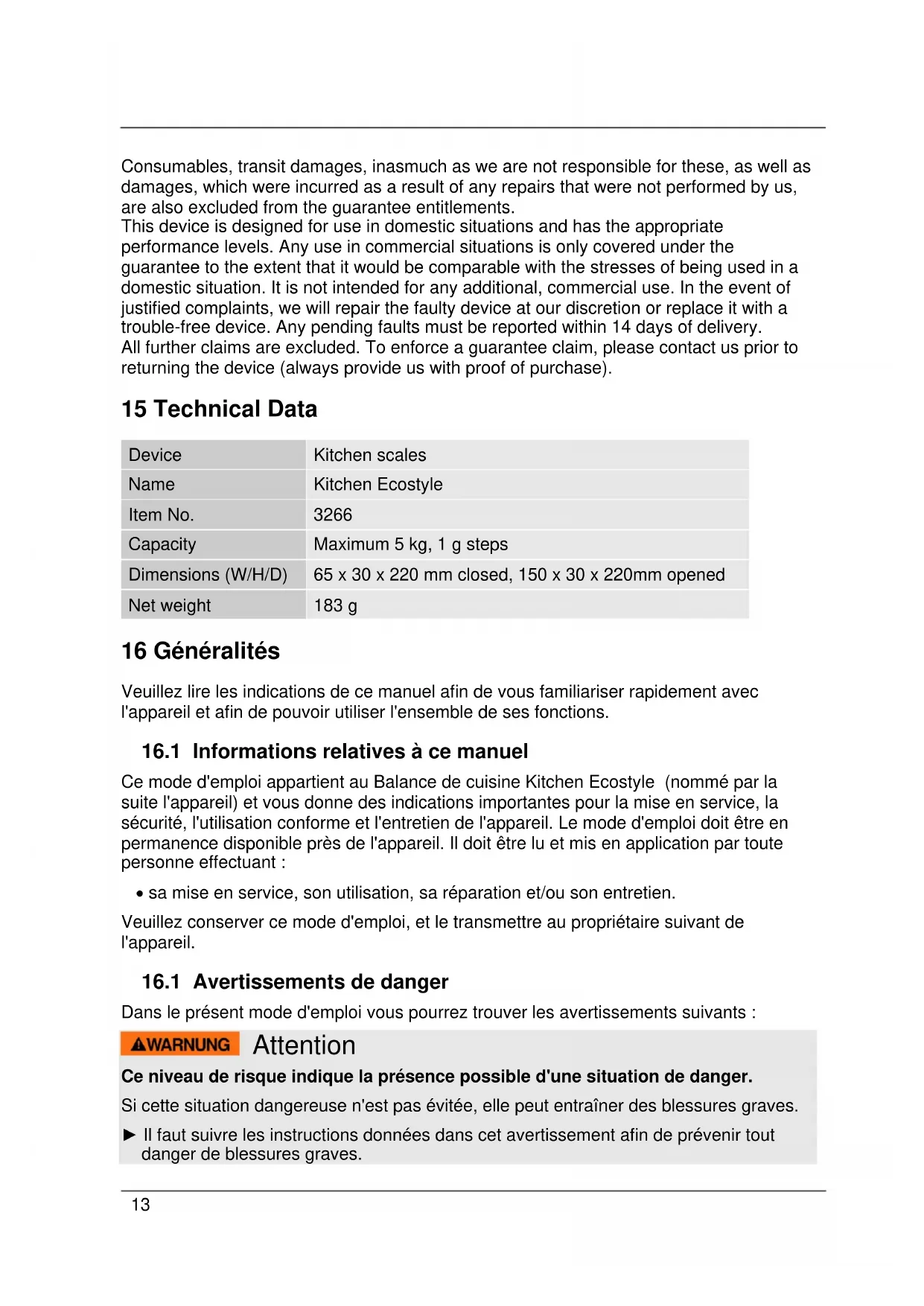 Nettoyez la surface du pèse-personne avec un chiffon légèrement humide. 21 Elimination des appareils usés Les appareils électriques et électroniques contiennent de nombreux matériaux recyclables. Mais ils contiennent également des produits nocifs qui sont indispensables au fonctionnement et à la sécurité. Ces derniers peuvent être nocifs pour les personnes ou pour l'environnement en cas d'élimination dans les ordures ménagères ou de traitement incorrect. Ne jamais jeter les anciens appareils avec les ordures ménagères. Remarque ► Portez les vieux appareils électriques et électroniques dans les points de collecte et de recyclage près de chez vous. Le cas échéant informez-vous auprès de la mairie, des services des ordures ou de votre concessionnaire. ► Assurez-vous que votre ancien appareil reste hors de portée des enfants jusqu'à son transport définitif.19 22 Garantie Sur ce produit nous accordons une garantie de 24 mois à partir de la date d'achat pour les manques et les défauts de fabrication ou de matériaux. Vous conserver entièrement vos droits de garantie légale accordés par le §439 et suivants BGB-E. La garantie ne concerne pas les dégâts causés par une utilisation ou une manipulation non conforme, ainsi que les défauts qui n'influencent que faiblement le fonctionnement ou la valeur de l'appareil. D'autre part ne sont pas garantis également les pièces d'usure, les dommages de transport dans la mesure où ils ne sont pas sous notre responsabilité, ainsi que les dommages occasionnés par des réparations qui n'ont pas été effectuées par nos soins. La construction et la puissance de cet appareil sont conçues pour un usage ménager privé. Un éventuel usage commercial reste couvert par la garantie dans la mesure où cette utilisation ne dépasse pas le cadre des contraintes d'un usage privé. L'appareil n'est pas prévu pour un usage commercial plus intensif. En cas de recours en garantie justifié nous déciderons de réparer l'appareil ou de le remplacer par un appareil sans défaut. Les manques doivent être signalés dans un délai de 14 jours après livraison. Tout autre recours est sans objet. Pour tout recours en garantie nous vous prions d'entrer en contact avec nos services avant de nous retourner l'appareil (toujours avec le bon d'achat!). 23 Caractéristiques techniques Appareil Balance de cuisine Nom Kitchen Ecostyle N°. d'article