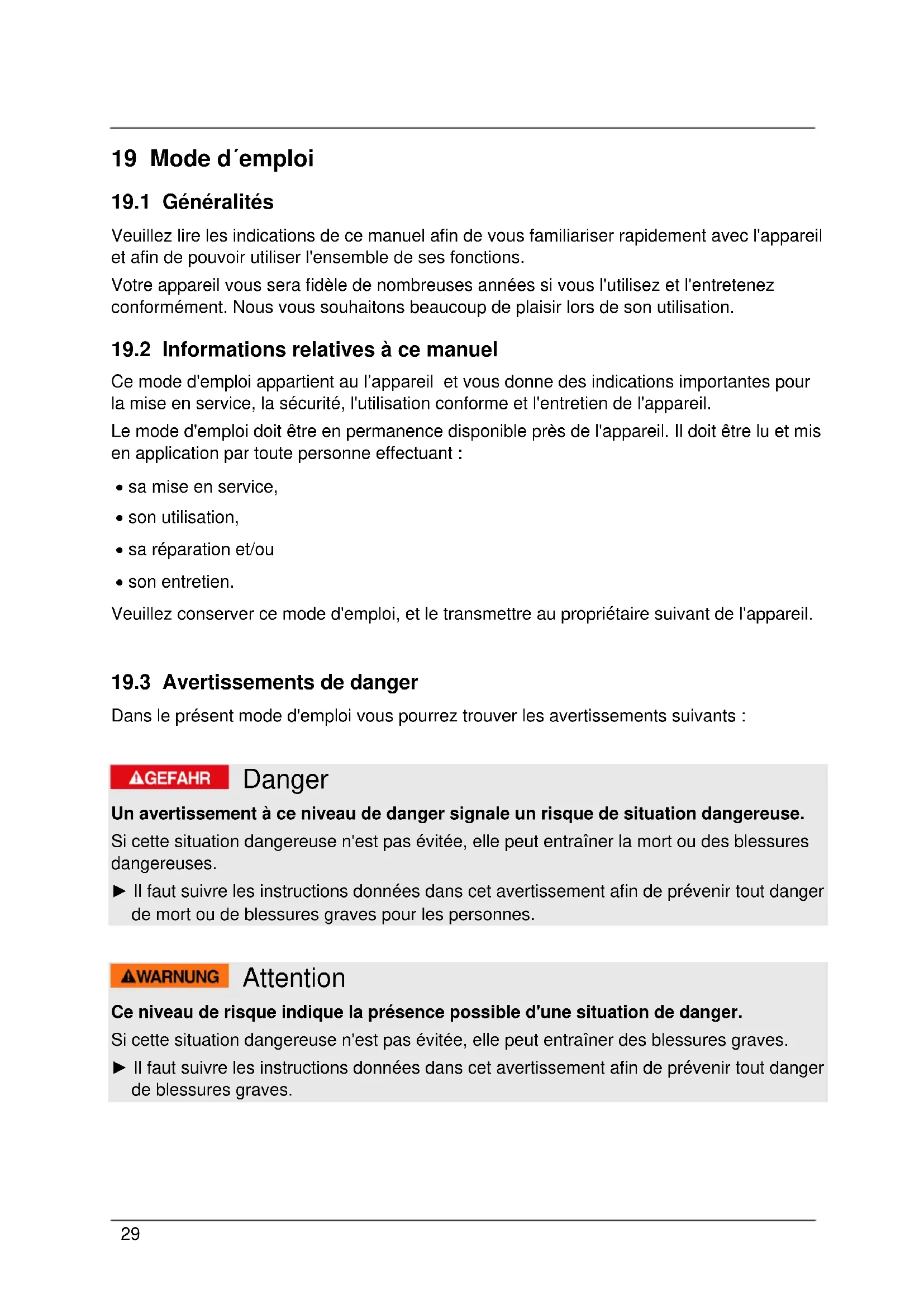Ce mode d'emploi appartient au l’appareil et vous donne des indications importantes pour la mise en service, la sécurité, l'utilisation conforme et l'entretien de l'appareil. Le mode d'emploi doit être en permanence disponible près de l'appareil. Il doit être lu et mis en application par toute personne effectuant :
