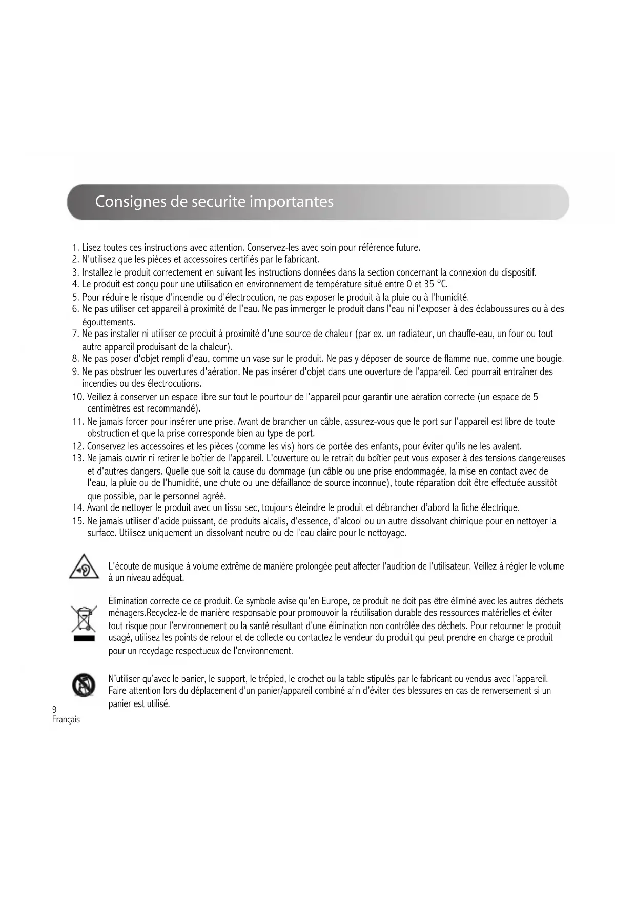 Français L'écoute de musique à volume extrême de manière prolongée peut affecter l'audition de l'utilisateur. Veillez à régler le volume à un niveau adéquat. Élimination correcte de ce produit. Ce symbole avise qu’en Europe, ce produit ne doit pas être éliminé avec les autres déchets ménagers.Recyclez-le de manière responsable pour promouvoir la réutilisation durable des ressources matérielles et éviter tout risque pour l’environnement ou la santé résultant d’une élimination non contrôlée des déchets. Pour retourner le produit usagé, utilisez les points de retour et de collecte ou contactez le vendeur du produit qui peut prendre en charge ce produit pour un recyclage respectueux de l’environnement. N’utiliser qu’avec le panier, le support, le trépied, le crochet ou la table stipulés par le fabricant ou vendus avec l’appareil. Faire attention lors du déplacement d’un panier/appareil combiné afin d’éviter des blessures en cas de renversement si un panier est utilisé.