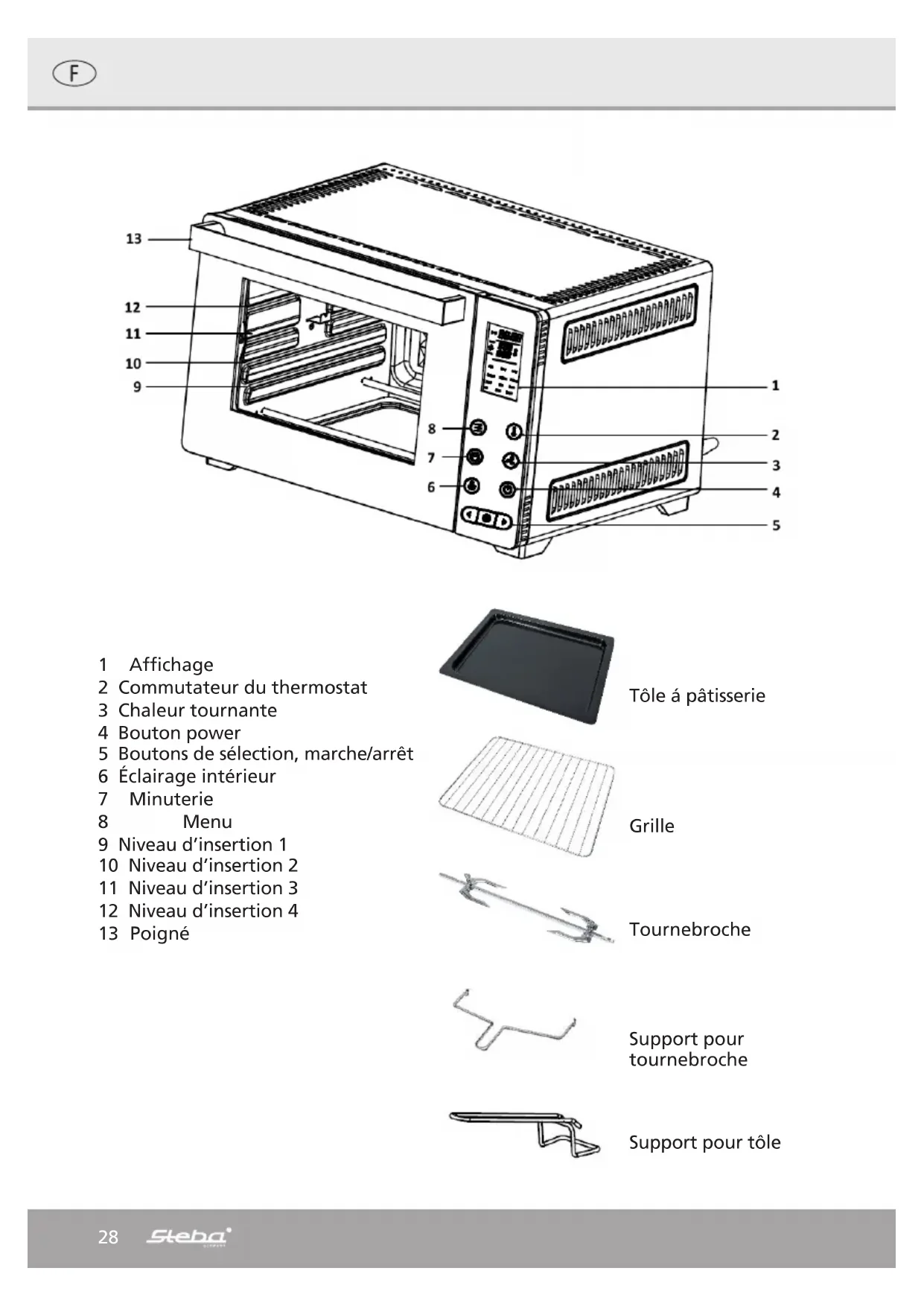 / 35 – 45°C Chicken 1 h 210°C / 1 Min – 3 h 150 – 210°C / Defrost 30 60°C 60°C 1 Min – 2 h / / Bread - Ferment 30 36°C 36°C 30 Min – 2 h 33 – 38°C 33 – 38°C Bread - Backen 60 165°C 165°C 1 Min – 2 h 150 – 200°C 150 – 200°C Cake 35 170°C 170°C 1 Min – 1 h 150 – 200°C 150 – 200°C Cookie 20 180°C 160°C 1 Min – 1 h 150 – 210°C 150 – 210°C Grill 20 230°C 230°C 1 Min – 1 h 200 – 230°C 200 – 230°C Pizza 20 200°C 200°C 1 Min – 30 Min 180 – 230°C 180 – 230°C Potato 60 230°C 230°C 1 Min – 2 h 180 – 230°C 180 – 230°C Pendant les programmes Cake, Cookie et Pizza, la minuterie commence à écouler après que la température a été atteinte. Programmation de Fonctions modifiables Température de la chaleur supérieur / inférieur Sélectionez la chaleur supérieur / inférieur avec le bouton menu. La LED indique la fonction. Utilisez les boutons de sélection pour choisir la température (par example 200°C) : ∙ Appuyez le bouton de température une fois, il s’allume la chaleur supérieur / infé- rieur avec 200°C. ∙ Appuyez le bouton de température deux fois, il s’allume chaleur supérieur avec 200°C ∙ Appuyez le bouton de température trois fois, il s’allume chaleur inférieur avec 200°C37 Fonctions Ferment / Yaourt Programme standard : 36°C, chaleur inférieur, 1 h Gamme modifiable : 35 – 45°C, 1 min – 10 h Appuyez le bouton menu et sélectionnez le programme « Ferment ». Pour changer les valeurs standard : ∙ Appuyez le bouton de température et sélectionnez la température souhaitée entre 35 et 35°C avec les boutons de sélection. ∙ Appuyez le bouton minuterie une fois pour changer les minutes de 1 à 60 minutes ∙ Appuyez le bouton minuterie deux fois pour changer les heures de 1 à 10 heures. ∙ Puis, appuyez le bouton marche. Bread Appuyez le bouton menu et sélectionnez le programme « Bread ». Puis, appuyez le bouton marche. L’appareil commence à fermenter à 36°C avec 30 min. Ensuit, l’appareil passe automatiquement au programme de base « Bread » à 165°C avec 60 min. La minuterie commence à courir que lorsque la température est atteinte. Pendant la fonctionnement, le programme ne peut pas être modifié. Si vous souhaitez de régler le temps de cuisson ou la température supplémentaire après le programme est fini, la minuterie peut être changé de 1 minute à 2 heures et la température entre 150 et 200°C. ∙ Appuyez le bouton menu et sélectionnez le chaleur supérieur / inférieur ou infé- rieur. ∙ Appuyez le bouton de la température et choisir la température souhaitée avec les boutons de sélections. ∙ Appuyez le bouton minuterie et choisir la température souhaitée evec les boutons de sélections. ∙ Puis, appuyez le bouton marche. Defrost Appuyez le bouton menu et sélectionnez le programme « Defrost ». Puis, appuyez le bouton marche. Le programme de base avec 30 min. et 60°C démarre. La minuterie peut être changé de 1 minute à 2 heures. ∙ Appuyez le bouton minuterie une fois pour changer les minutes de 1 à 60 minutes ∙ Appuyez le bouton minuterie deux fois pour changer les heures de 1 à 2 heures ∙ Puis, appuyez le bouton marche. Indication d’erreur E1 court-circuit du capteur de températur supérieur E2 circuit interrompu E3 court-circuit du capteur ed température inférieur E4 circuit interrompu38 Evacuation correcte de ce produit: Mettre les appareils usagés immédiatement au rebut. Au sein de l‘UE, ce symbole indique que le produit ne doit pas être jeté avec les déchets ménagers. Les anciens appareils contiennent des matériaux de valeur recyclables qui doivent être valorisés afin d‘éviter toute atteinte à l‘environnement ou à la santé humaine due à une élimination incorrecte des déchets. Les anciens appareils doivent par conséquent être mis au rebut via des systèmes de collecte appropriés ou ramenés à cet effet au point de vente où ils ont été achetés. Les appareils seront alors confiés à un centre de recyclage des matériaux. Élimination de l‘emballage Ne pas jeter l‘emballage avec les déchets ménagers, mais avec les déchets recyclables. Jeter les emballages en papier, carton et carton ondulé aux points de collecte de vi- eux papiers. Les composants d‘emballage en plastique et les films doivent également être jetés dans les conteneurs prévus à cet effet. Exemples d‘identification des plastiques : PE pour le polyéthylène, code 02 pour le PEHD, 04 pour le PEBD, PP pour le polypropylène, PS pour le polystyrène. Service après-vente Si, contre toute attente, l‘appareil doit être confié au service après-vente, nous con- tacter aux coordonnées suivantes. En cas de garantie applicable, nous nous charge- ons de l‘enlèvement de l‘appareil. L‘appareil doit être correctement emballé pour le transport. Les paquets non affranchis ne pourront pas être pris en charge ! STEBA Elektrogeräte GmbH & Co KG Pointstr. 2, 96129 Strullendorf / Allemagne tél. service commercial : 09543 / 449-17 / -18, tél. S.A.V. : 09543 / 449-44, fax : 09543 / 449-19 e-mail : elektro@steba.com Internet : http://www.steba.com Attention ! Les appareils électriques doivent être réparés exclusivement par des élec- triciens qualifiés, les réparations non conformes pouvant entraîner des conséquences graves.3940 1 Display 2 Temperatuur schakelaar 3 Convection schakekelaar 4 Aan knop 5 Start/Stop 6 Verlichting 7 Timer 8 Menu 9 Inschuifniveau 1 10 Inschuifniveau 2 11 Inschuifniveau 3 12 Inschuifniveau 4 13 Deurhendel Bakplaat Grillrooster Draaispit Spit uitnemer Bakplaat uitnemer41 Algemeen Dit geïsoleerde apparaat is uitsluitend bedoeld voor privé ge- bruik en gebruik binnenshuis en niet geschikt voor commerciële doeleinden. Hij is geschikt voor grillen, bakken, gratineren en op- warmen van voedsel. Lees de handleiding zorgvuldig en bewaar deze op een veilige plaats. Wanneer het appar