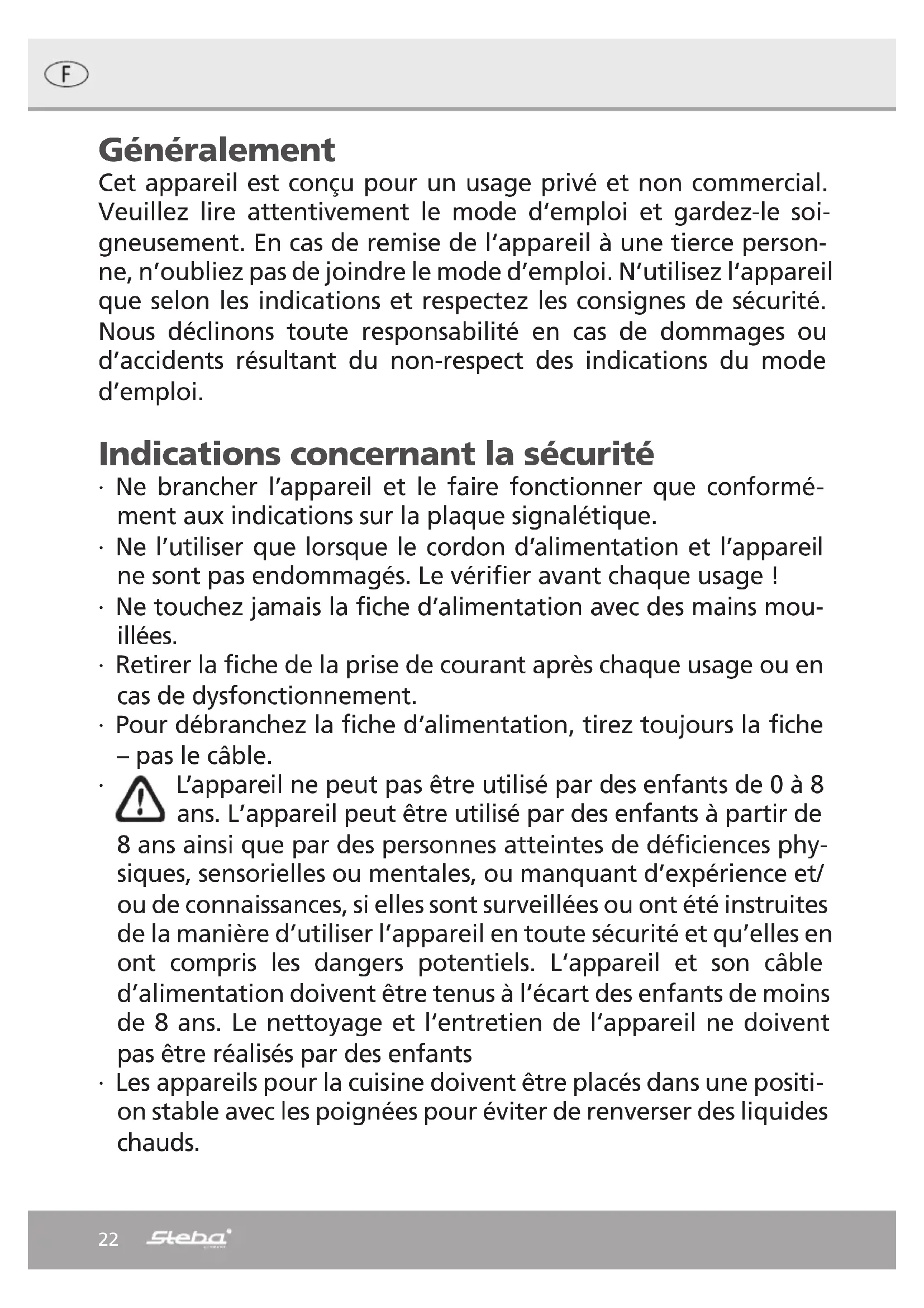 - This information is approximate and depends on the size, the weight and the temperature of the food. Danger of splashes! To avoid splashes or foaming of the fat only use food which is not too wet (dry the food with cloth, remove ice from the food etc.). Insert the food slowly into the fryer. If the fat is foaming excessively, lift the basket several times. Never carry the fryer when there is hot oil inside. Danger of burns! Always cool down the fryer before moving it. Parts of the appliance, e.g. the upper edge of the oil tank or the steam escaping from the fryer can be very hot. Take care that nobody can rip at the power cord and pull the appliance from the table (especially children). To avoid this attach the power cord, e.g. to the leg of the table.18 Important Tips: According the latest knowledge of researchers, following max. temperatures should be obeyed and all foods should be fried max to a gold colour: 170°C for all potatoes, breaded food and all other starch containing products 190°C for meat and poultry with no breading In opposite to the tips on the packaging of frozen food we advise to defrost the food short before frying to avoid any ice inside the fryer. After frying: Remaining of breading or other food should be removed from the oil regularly. ∙ The fat should be cooled down after frying. Them the fat should be poured into a bowl. After that the fryer and the basket should be cleaned. Put a coffee filter paper into the basket and put the basket into the fryer and pour the fat slowly into the filter. ∙ At fish or meat the oil can be used 5-10times. When potatoes are used the fat can be used longer. Attention: Old or dirty fat can be inflamed when it is overheated, therefore it must be exchanged on time. In case of fire, pull the plug out of the socket and extinguish the fire by closing the lid. Never use water to extinguish the fire! Always exchange the oil when it smells strange, is dark brown or starts smoking at low temperatures. After deep fat frying: Clean the fat Residue from the coating or the food should be removed from the frying fat or oil at regular intervals. Any contamination or water is deposited in the "Cool Zone" beneath the heating elements and will not combust. ∙ First allow the fat to cool after frying, then carefully pour the fat into a metal pan with handles. ∙ Coating residue and water in the oil must be removed. ∙ Clean the frying basket and the pan (see paragraph "Cleaning and care"). ∙ Hook frying basket onto fryer (draining position, place kitchen paper in basket as a filter). ∙ Slowly pour the fat back into the fryer through the filter paper. ∙ Only use the paper fat filter once. If the fat has taken on a little taste, this can be improved by setting the temperature to just below 150°C and putting a handful of spinach leaves, parsley, lettuce leaves or 2 potatoes that have been peeled, sliced and well dried into the hot fat and leaving them to brown. Remove and throw away the vegetables.19 Storing oil or fat If the fryer is used at regular intervals, the fat can be kept in the fryer with the lid closed. If the fryer is stored in a cool, dry location, the fat can be kept in the fryer for for some weeks. If you do not fry frequently, the filtered fat can be kept in a sealed container that is protected from the light. The frying fat can be used for food such as fish or meat 5-10 times without problems. The fat is not as contaminated by potato dishes such as French fries or pastries, and can be therefore used more frequently. Caution! Used or contaminated fat or oil can self-ignite if overheated, which is why the oil should be replaced in good time. In the event of a fire, disconnect the plug form the power supply and extinguish burning fat by covering with the lid. Never extinguish using water! Replace the frying fat if: ∙ It has turned brown ∙ It has an unpleasant smell ∙ Starts to smoke sooner than expected Remove control panel with heater, remove container and pour the liquid oil that has not yet fully cooled down into a container with a closure. Used fat and oil should not be poured onto compost or down the drain. If large quantities are being produced, ask your local authority for the location of a collection point. Practical tips for frying Dry the food carefully before putting it into the fat, tap superfluous flour, press the breading firmly. Food containing much protein such as fish, poultry, meat and seafood can be fried in the raw if they are well dried. Food containing little protein such as vegetables and fruit should be coated with breadcrumbs or with batter, hereby the pores close quickly. The crust is also ideal for frying meat, poultry, fish and seafood.20 Disposal: Packaging disposal: Do not throw away the package materials. Please put it in the recycling bin. Gift box: Paper, should be put to the old paper collection point. Plastic packaging material and foils should be collected in the special collection containers. Correct Disposal of this product This marking indicates that this product should not be disposed with other household wastes throughout the EU. To prevent possible harm to the environment or human health from uncontrolled waste disposal, recycle it responsibly to promote the sustainable reuse of material resources. To return your used device, please use the return and collection systems or contact the retailer where the product was purchased. They can take this product for environmental safe recycling. Service and Repair: If the appliance must be repaired, plaese get in touch with your trader or with the manufacturer: STEBA Elektrogeräte GmbH & Co KG Pointstr. 2, 96129 Strullendorf / Germany Distribution-Tel.: 09543 / 449-17 / -18, Service-Tel.: 09543 / 449-44, Fax: 09543 / 449-19 e-Mail: elektro@steba.com Internet: http://www.steba.com2122 Généralement Cet appareil est conçu pour un usage privé et non commercial. Veuillez lire attentivement le mode d‘emploi et gardez-le soi- gneusemen