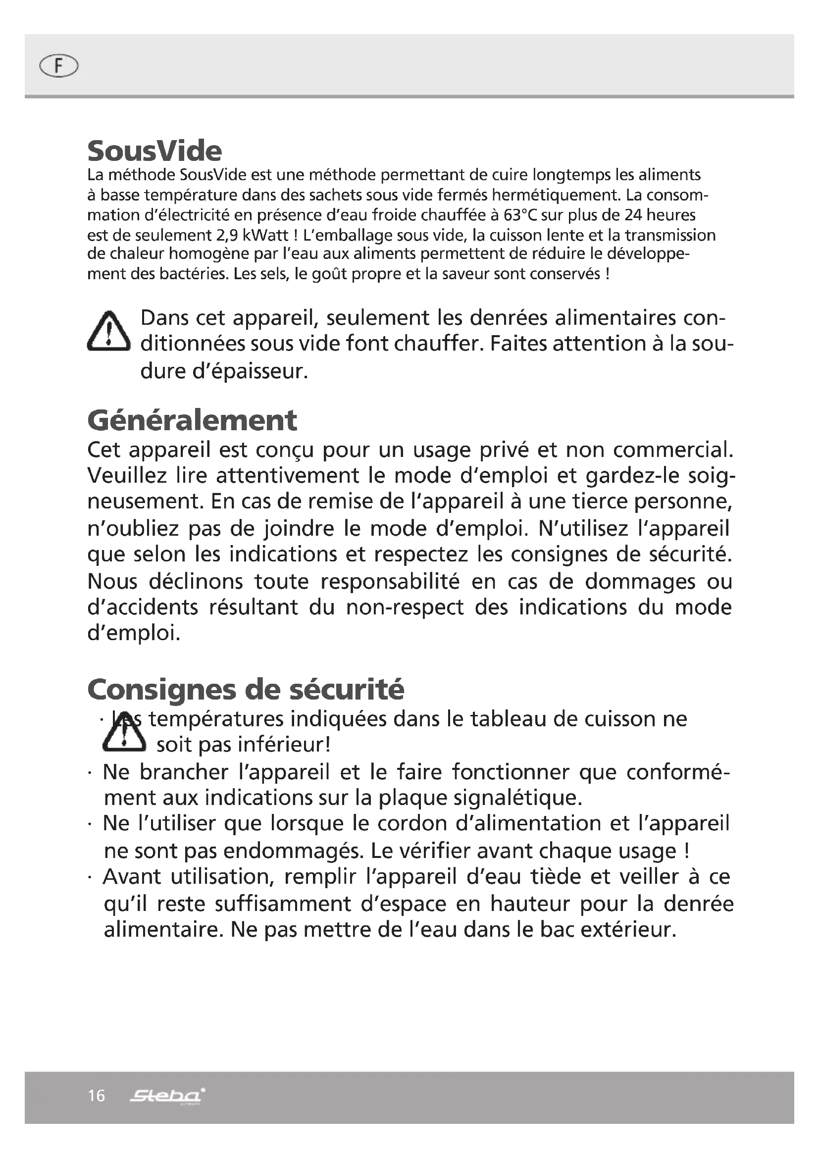 Attention ! L’appareil chauffe. Vous risquez de vous brûler! Ne le transporter qu’une fois refroidi. Du- rant le fonctionnement, la température des surfaces pouvant être touchées peut être très élevée.18 Nettoyage et entretien ∙ Après utilisation, ne pas laisser d’eau dans le récipient. ∙ Retirer la prise de secteur avant tout nettoyage. ∙ Laisser refroidir l’appareil à température ambiante. ∙ Ne pas plonger les composants électriques dans l’eau. ∙ Retirer prudemment le plat de l’appareil. ∙ Le plat et le couvercle peuvent être nettoyés à l’eau chaude additionnée de liquide vaisselle classique. Ensuite, bien essuyer les pièces et s’assurer qu’il ne reste pas d’eau dans le couvercle. ∙ Ne pas utiliser de nettoyant acide ou abrasif. ∙ Essuyer les résistances et la surface du boîtier avec un chiffon humide. ∙ Remonter l’appareil après nettoyage. Attention ! L’appareil est chaud. ∙ Ne transporter qu’après refroidissement. Durant le fonctionnement de l’appareil, la température des surfaces accessibles augmente. ∙ Faire attention à l’évacuation de vapeur durant la cuisson et à l’ouverture du cou- vercle. ∙ Débrancher l’appareil lorsqu’il n’est pas utilisé. ∙ Si une rallonge est utilisée, veiller à ce que les enfants ne tirent pas dessus ou qu’elle puisse être à l’origine d’une perte d’équilibre. ∙ Retirer le couvercle avec précaution, de l’eau chaude se trouvant à l‘intérieur de celui-ci. Avant la première utilisation : ∙ Nettoyer l’appareil avant utilisation avec soin avant de le remplir avec de l’eau. ∙ Nettoyer le récipient avec soin avec de l’eau chaude et un peu de liquide vaisselle, Verser, rincer et sécher. ∙ Attention : ne pas plonger les composants électriques dans l’eau ! ∙ N’essuyer l‘intérieur du couvercle qu’avec un chiffon humide puis sécher. Mettre sous vide N’utiliser que des sachets pouvant être mis sous vide. Les sachets classiques ne garan- tissent pas une fermeture hermétique. Vérifier qu’il n’y a pas de traces d’épices dans la zone de la soudure qui pourraient empêcher tout soudage hermétique.19 Scellant vide VK5: Art No 05-05-00 EAN: 4011833301819 feuille sac: 22 x 30cm: Art No 93-30-00 EAN: 4011833400574 feuille sac: 28 x 40cm: Art No 93-40-00 EAN: 4011833400581 feuille role: 22 x 500cm: Art No 93-22-00 EAN: 4011833400550 feuille role: 28 x 500cm: Art No 93-28-00 EAN: 4011833400567 Réglage de l’appareil Display Température Heure Lampe témoin Start / Stop On / Off ∙ Appuyer au moins 2 secondes sur la touche on/off . La touche s’allume, „0000“. Appuyer la température un fois, „40C“ affiche sur le display. Régler la tempéra- ture désirée à l’aide de la touche +/- et lancer a procédure. Appuyer sur heure , 00:01 heure affiché sur le display, avec la touché +/- régeler temps désiréé et ap´puyer sur la touché . ∙ Heure. Une pression rapide sur la touche = un pas d‘1 minute, une pression plus longue = avancée rapide. Le réglage maximum est de 24 heures. ∙ Quand l’appareil est en marche, une lampe témoin est allumée. ∙ Environ 2 à 3 °C en des sous du niveau d e température s ouhaité de l’eau, l e signal « Température » s’allume jusqu’à la fin du processus de cuisson. ∙ Appuyer sur la touche on/off pour arrêter l’appareil. Quantité d’eau Ne pas mettre trop d’eau dans l’appareil afin qu’il reste suffisamment de place pour les aliments. Si nécessaire, compléter avec de l’eau jusqu’à atteindre la valeur de 2 cm en dessous du bord (Max). Les aliments doivent toujours être recouverts d’eau. Lorsque de l’eau réchauffée est utilisée, il faut quelques minutes au capteur de tem- pérature pour s’ajuster au niveau de température souhaité.20 Viande : Température 58°C à 62°C Epaisseur Heure 10 mm 30 minutes 20 mm 45 minutes 30 mm 95 minutes 40 mm 120 minutes 50 mm 180 minutes 60 mm 250 minutes Volaille : Température 63°C à 65°C Epaisseur Temps de cuisson 10 mm 20 minutes 20 mm 40 minutes 30 mm 75 minutes 40 mm 90 minutes Poisson : Température 55°C à 58°C Epaisseur Temps de cuisson 10 mm 10 minutes 20 mm 20 minutes 30 mm 30 minutes 40 mm 40 minutes 50 mm 50 minutes 60 mm 60 minutes Légumes : Température 80°C à 85°C Type Temps de cuisson Asperges 25 minutes Pommes de terre 40 minutes Légumes racines 70 minutes Assaisonnement Les aliments peuvent être assaisonnés ou des herbes peuvent être placées sur la préparation avant la mise sous vide. Soyez prudent avec l’assaisonnement car le goût propre des aliments est conservé avec la préparation sous vide. Généralités La méthode SousVide permet de pasteuriser les aliments à des températures très précises et d’en allonger ainsi la durée de conservation. Après pasteurisation, faire immédiatement refroidir le sachet dans de l’eau glacée et stocker en réfrigérateur à une température inférieure à 7°C, congeler ou consommer aussitôt. La pasteurisa- tion se fait à une température interne d’environ 62°C. D’une manière générale, les aliments se développent au mieux sous des températures situées entre 55°C et 65°C. Les températures situées juscue 65 °C disposent d’une tolérance supplémentaire d’ 1 °C et les températures d’au moins 70 °C, de 2 à 3 °C. Il convient de prêter attention à ce niveau de tolérance pour les valeurs de réglage de la température (régler p. ex. sur 72 °C lorsqu’une température de 75 °C est souhaitée). Le Temps de cuisson dépend de l’épaisseur des aliments ∙ L’appareil ne fonctionne correctement que lorsque le couvercle est en place. ∙ Pour des aliments congelés, le temps de cuisson augmente d’au moins 20 %. ∙ Toutes les données de temps sont des valeurs approximatives et elles devraient être adaptées à votre propre goût. ∙ Pour les viandes épaisses, doubler le temps de cuisson