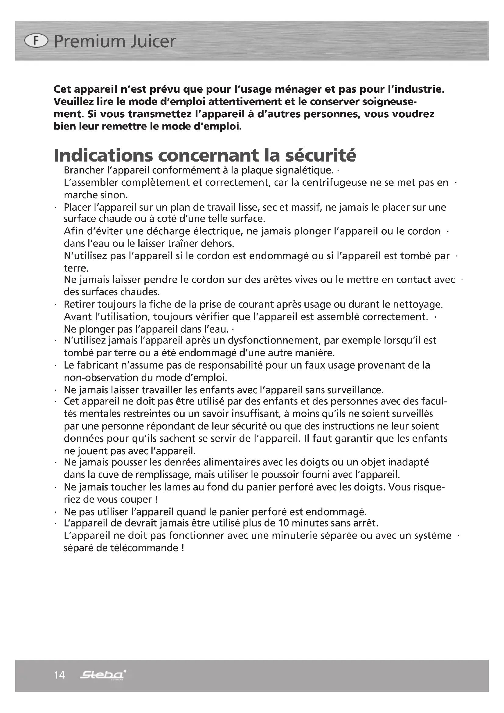 - Ne pas surcharger le réservoir à pulpes, car l’appareil ne peut pas travailler correcte- ment et peut être endommagé.16 Bon à savoir Laver tous les fruits et les légumes. Il n’est pas nécessaire de couper la plupart des fruits ou légumes en morceaux, dans la mesure où ils rentrent facilement dans l’orifice de remplissage. Toujours éplucher auparavant les fruits avec une peau ou une écorce dure ou imman- geable tels que les melons, kiwis, ananas. Éplucher les agrumes avant d’en extraire le jus. Pour les pommes, ajouter un peu de jus de citron, ce qui évite que le jus se décolore. Dénoyauter ou épépiner les fruits à noyaux ou à pépins. Ne pas mettre de bananes ou d’avocats dans l’appareil, car il serait bouché. La pulpe se compose de fibres et de cellulose et contient de nombreuses substances nutritives. On peut utiliser la pulpe de légumes et de pommes de terre pour lier les soupes. Il faut travailler la pulpe le jour même. Nettoyage Placer l’interrupteur sur 0 et retirer la fiche de la prise de courant. ∙ Rabattre le levier de verrouillage et retirer le recouvrement. ∙ Tirer le bac-collecteur du jus vers le haut avec les deux mains. ∙ Basculer le bac-collecteur avec précaution afin que le panier perforé sorte en glis- ∙ sant. Tenir le panier perforé sur le bord et le nettoyer avec précaution sous l’eau couran- ∙ te avec la brosse fournie avec l’appareil. Toutes les autres pièces telles que le bac-collecteur du jus, le recouvrement, le réser- ∙ voir à pulpes et le réservoir à jus peuvent être nettoyés dans un bain d’eau chaude additionnée de liquide vaisselle. Bien les sécher ensuite. Essuyer la base du moteur seulement avec un chiffon humide ; bien veiller à ce que ∙ de l’eau ne pénètre pas à l’intérieur de la base.17 Evacuation correcte de ce produit : Rendre les appareils ayant fait leur temps immédiatement inutilisables Au sein de l’UE, ce symbole indique que ce produit ne doit pas être évacué avec les déchets mécaniques. Les vieux appareils contiennent des matériaux qui peuvent être recyclés et qui devraient être déposés à des centres de récupération et afin de ne pas altérer l’environnement, voire la santé des personnes par une élimintation des déchets non- contrôlée. Veuillez donc évacuer les appareils usés par des systèmes de collecte bien appropriés ou envoyez-lea opoù vous l’avez acheté en vue d’évacuation. L’appareil sera alors amené à la récupération des matériaux. Service Après-Vente : Si contre toute attente, votre appareil devait avoir besoin du SAV, veuillez alors vous adresser à l’adresse suivante. Nous en organiserons alors d’enlèvement. Des paquets non affranchis ne pourront pas être pris en charge. STEBA Elektrogeräte GmbH & Co KG Pointstr. 2 • 96129 Strullendorf / Germany Tél. : (0) 95 43 / 449-0 Fax: 0 95 43 / 449-19 e-Mail: elektro@steba.com Internet: http://www.steba.com Attention! Les appareils électriques ne seront réparés que par du personnel élec- tricien qualifié étant donné que des réparations non-conformes peuvent avoir des conséquences graves. Données techniques: 230V ~ ; 50/60 Hz ; 850 watts Dimensions extérieures : H 44 x L 35 x P 24cm Acessoires spéciaux : Verseuse à jus (réf. 99-16-00)