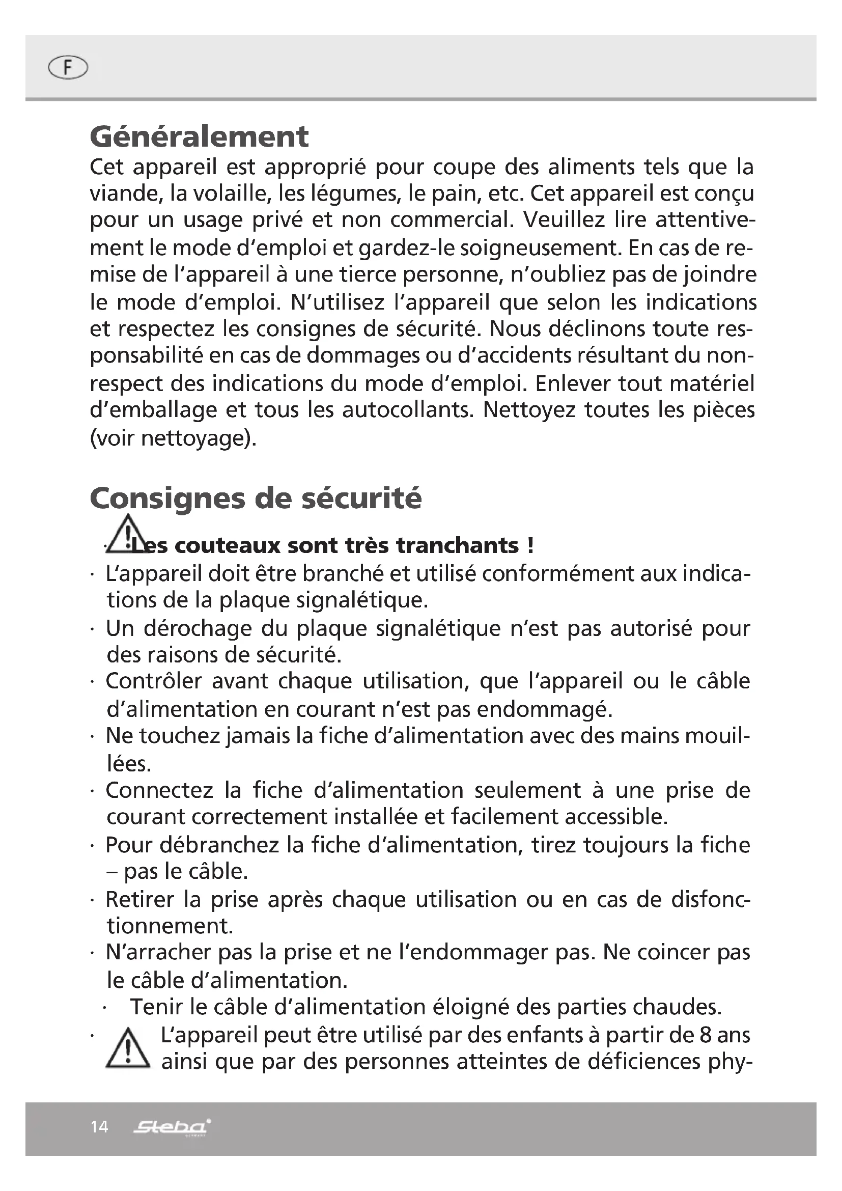 Usage ∙ Make sure that the device is not plugged in before inserting the blades! ∙ Place the two blades on top of each other and slide the metal pin of one into the hole of the other blade ∙ Take the two blades with the blade guard and insert them into the slots on the mo- tor part until they snap into place. ∙ Now remove the blade guard and plug in the device. ∙ Carefully cut the food without much pressure from top to bottom. ∙ Pay attention not to cut into bones or metal, neither operate the device on a metal surface. Otherwise the blades will blunt. ∙ Never press the ON / Off button and the release button simultaneously. ∙ Long-term usage: in order not to damage the motor, the operating time should not exceed 15 minutes. Then, let the motor cool down for approx. 5 minutes.13 Correct Disposal of this product This marking indicates that this product should not be disposed with other household wastes throughout the EU. To prevent possible harm to the envi- ronment or human health from uncontrolled waste disposal, recycle it re- sponsibly to promote the sustainable reuse of material resources. To return your used device, please use the return and collection systems or contact the retailer where the product was purchased. They can take this product for environmental safe recycling. Packaging disposal: Do not throw away the package materials. Please put it in the recycling bin. Gift box: Paper, should be put to the old paper collection point. Plastic packaging material and foils should be collected in the spe- cial collection containers. Service and Repair: If the appliance must be repaired, please get in touch with your trader or with the manufacturer: STEBA Elektrogeräte GmbH & Co KG Pointstr. 2, 96129 Strullendorf / Germany Distribution-Tel.: 09543 / 449-17 / -18, Service-Tel.: 09543 / 449-44, Fax: 09543 / 449-19 e-Mail: elektro@steba.com Internet: http://www.steba.com14 Généralement Cet appareil est approprié pour coupe des aliments tels que la viande, la volaille, les légumes, le pain, etc. Cet appareil est conçu pour un usage privé et non commercial. Veuillez lire attentive- ment le mode d‘emploi et gardez-le soigneusement. En cas de re- mise de l‘appareil à une tierce personne, n’oubliez pas de joindre le mode d’emploi. N’utilisez l‘appareil que selon les indications et respectez les consignes de sécurité. Nous déclinons toute res- ponsabilité en cas de dommages ou d’accidents résultant du non- respect des indications du mode d’emploi. Enlever tout matériel d’emballage et tous les autocollants. Nettoyez toutes les pièces (voir nettoyage). Consignes de sécurité ∙ Les couteaux sont très tranchants ! ∙ L‘appareil doit être branché et utilisé conformément aux indica- tions de la plaque signalétique. ∙ Un dérochage du plaque signalétique n‘est pas autorisé pour des raisons de sécurité. ∙ Contrôler avant chaque utilisation, que l’appareil ou le câble d’alimentation en courant n’est pas endommagé. ∙ Ne touchez jamais la fiche d’alimentation avec des mains mouil- lées. ∙ Connectez la fiche d’alimentation seulement à une prise de courant correctement installée et facilement accessible. ∙ Pour débranchez la fiche d’alimentation, tirez toujours la fiche – pas le câble. ∙ Retirer la prise après chaque utilisation ou en cas de disfonc- tionnement. ∙ N’arracher pas la prise et ne l’endommager pas. Ne coincer pas le câble d’alimentation. ∙ Tenir le câble d’alimentation éloigné des parties chaudes. ∙ L‘appareil peut être utilisé par des enfants à partir de 8 ans ainsi que par des personnes atteintes de déficiences phy-15 siques, sensorielles ou mentales, ou manquant d‘expérience et/ ou de connaissances, si elles sont surveillées ou ont été instruites de la manière d‘utiliser l‘appareil en toute sécurité et qu‘elles en ont compris les dangers potentiels. Le nettoyage et l‘entretien de l‘appareil ne doivent pas être réalisés par des enfants, sauf s‘ils sont âgés de plus de 8 ans et exécutent ces opérations sous surveillance. ∙ Tenir l‘appareil et le cordon d‘alimentation hors de portée des enfants de moins de 8 ans. ∙ Veillez á ce que des enfants ne jouent pas avec l’emballage (par exemple sac en plastique). ∙ L´appareil ne doit pas fonctionner avec une minuterie ou avec un système séparé de télécommande ! ∙ N‘entreposez pas l‘appareil à l‘extérieur ou dans une pièce hu- mide. ∙ Ne mettez jamais l‘appareil dans l‘eau. ∙ N‘utilisez jamais l‘appareil après un fonctionnement défaillant, par ex. s’il est tombé ou s’il a été endommagé d‘une autre ma- nière. ∙ Le fabricant ne sera pas tenu responsable en cas de mauvaise utilisation ou d‘utilisation inappropriée par non-respect du mode d‘emploi. ∙ Pour éviter tout danger, les réparations sur l‘appareil, notam- ment le remplacement d‘un câble endommagé, ne peuvent être réalisées que par un service après-vente autorisé. ∙ N‘utilisez l‘appareil que pour les applications décrites dans le mode d‘emploi. ∙ Cet appareil est conçu pour un usage privé et similaires telles que : o dans les cuisines pour les employés dans les magasins, bu- reaux et autres zones industrielles o dans les propriétés agricoles et par les clients des hôtels, motels et autres établissements résidentiels o dans chambres d’hôtes ∙ Avant la première utilisation : toutes les pièces doivent être nettoyées et séchées minutieusement.16 ∙ Si vous utilisez une rallonge, celle-ci doit avoir une section de 1,5 mm². ∙ Si vous utilisez une multiprise testée pas GS avec 16 A, il est interdit de le charger avec plus de 3680 watts en raison d’un danger incendie. ∙ Si vous utilisez une rallonge, faire attention que les enfants ne le tirent pas où trébucher sur le câble. ∙ Tirez Ia fiche d‘alimentations toujours si l‘appareil est 