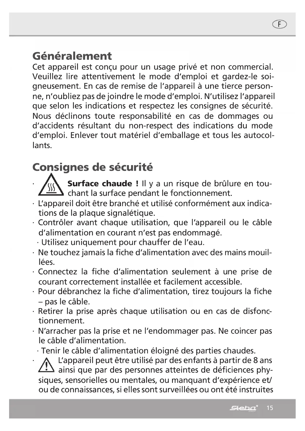 Do not fill the above the maximum marking on the water gauge because hot water can escape. ∙ Place the container onto the base. ∙ Press the ON/OFF button, the blue LED shines. ∙ The device starts with the 100°C mode and starts heating. ∙ The temperature indicator displays the water temperature. Once the desired tem- perature is reached, the boiling process can be stopped with the ON/OFF switch. The temperature indicator is out of order if there is less water as MIN in the device. Troubleshooting Dear Client, Thank you for buying this STEBA product. The following table will help you with problems that may occur when using your device. For many problems there is a sim- ple solution, because not everything that appears like a malfunction must be serious. Please check the following list before contacting our customer service. Problem Reason Solution Control light does not shine once device is plugged in ∙ No power ∙ To many devices at one power cord ∙ Check is plug is plugged-in correctly ∙ Check the fuse Boiling result is bad ∙ Lid is not closed prop- erly ∙ Heating plate is calci- fied ∙ Close the lid ∙ Decalcify the device Device turns off ∙ Due to scale, heat ac- cumulates and triggers the microswitch ∙ Leave to cool for 10 minutes. ∙ Descale14 Correct Disposal of this product This marking indicates that this product should not be disposed with other household wastes throughout the EU. To prevent possible harm to the envi- ronment or human health from uncontrolled waste disposal, recycle it re- sponsibly to promote the sustainable reuse of material resources. To return your used device, please use the return and collection systems or contact the retailer where the product was purchased. They can take this product for environmental safe recycling. Packaging disposal: Do not throw away the package materials. Please put it in the recycling bin. Gift box: Paper, should be put to the old paper collection point. Plastic packaging material and foils should be collected in the spe- cial collection containers. Service and Repair: If the appliance must be repaired, please get in touch with your trader or with the manufacturer: STEBA Elektrogeräte GmbH & Co KG Pointstr. 2, 96129 Strullendorf / Germany Distribution-Tel.: 09543 / 449-17 / -18, Service-Tel.: 09543 / 449-44, Fax: 09543 / 449-19 e-Mail: elektro@steba.com Internet: http://www.steba.com15 Généralement Cet appareil est conçu pour un usage privé et non commercial. Veuillez lire attentivement le mode d‘emploi et gardez-le soi- gneusement. En cas de remise de l‘appareil à une tierce person- ne, n’oubliez pas de joindre le mode d’emploi. N’utilisez l‘appareil que selon les indications et respectez les consignes de sécurité. Nous déclinons toute responsabilité en cas de dommages ou d’accidents résultant du non-respect des indications du mode d’emploi. Enlever tout matériel d’emballage et tous les autocol- lants. Consignes de sécurité ∙ Surface chaude ! Il y a un risque de brûlure en tou- chant la surface pendant le fonctionnement. ∙ L‘appareil doit être branché et utilisé conformément aux indica- tions de la plaque signalétique. ∙ Contrôler avant chaque utilisation, que l’appareil ou le câble d’alimentation en courant n’est pas endommagé. ∙ Utilisez uniquement pour chauffer de l’eau. ∙ Ne touchez jamais la fiche d’alimentation avec des mains mouil- lées. ∙ Connectez la fiche d’alimentation seulement à une prise de courant correctement installée et facilement accessible. ∙ Pour débranchez la fiche d’alimentation, tirez toujours la fiche – pas le câble. ∙ Retirer la prise après chaque utilisation ou en cas de disfonc- tionnement. ∙ N’arracher pas la prise et ne l’endommager pas. Ne coincer pas le câble d’alimentation. ∙ Tenir le câble d’alimentation éloigné des parties chaudes. ∙ L‘appareil peut être utilisé par des enfants à partir de 8 ans ainsi que par des personnes atteintes de déficiences phy- siques, sensorielles ou mentales, ou manquant d‘expérience et/ ou de connaissances, si elles sont surveillées ou ont été instruites16 de la manière d‘utiliser l‘appareil en toute sécurité et qu‘elles en ont compris les dangers potentiels. Le nettoyage et l‘entretien de l‘appareil ne doivent pas être réalisés par des enfants, sauf s‘ils sont âgés de plus de 8 ans et exécutent ces opérations sous surveillance. ∙ Tenir l‘appareil et le cordon d‘alimentation hors de portée des enfants de moins de 8 ans. ∙ Veillez á ce que des enfants ne jouent pas avec l’emballage (par exemple sac en plastique). ∙ L´appareil ne doit pas fonctionner avec une minuterie ou avec un système séparé de télécommande ! ∙ Ne laissez jamais l‘appareil sans surveillance lors de son fonc- tionnement. ∙ N‘entreposez pas l‘appareil à l‘extérieur ou dans une pièce hu- mide. ∙ Ne mettez jamais l‘appareil dans l‘eau. ∙ N‘utilisez jamais l‘appareil après un fonctionnement défaillant, par ex. s’il est tombé ou s’il a été endommagé d‘une autre ma- nière. ∙ Le fabricant ne sera pas tenu responsable en cas de mauvaise utilisation ou d‘utilisation inappropriée par non-respect du mode d‘emploi. ∙ Pour éviter tout danger, les réparations sur l‘appareil, notam- ment le remplacement d‘un câble endommagé, ne peuvent être réalisées que par un service après-vente autorisé. Seule- ment les pièces détachées original peuvent être utiliser. ∙ L‘appareil chauffe beaucoup, ne le transportez donc qu‘après refroidissement. ∙ N‘utilisez l‘appareil que pour les applications décrites dans le mode d‘emploi.17 ∙ Cet appareil est conçu pour un usage privé et similaires telles que : o dans les cuisines pour les employés dans les magasins, bu- reaux et autres zones industrielles o dans les propriétés agricoles et par les clients des hôtels, motels et