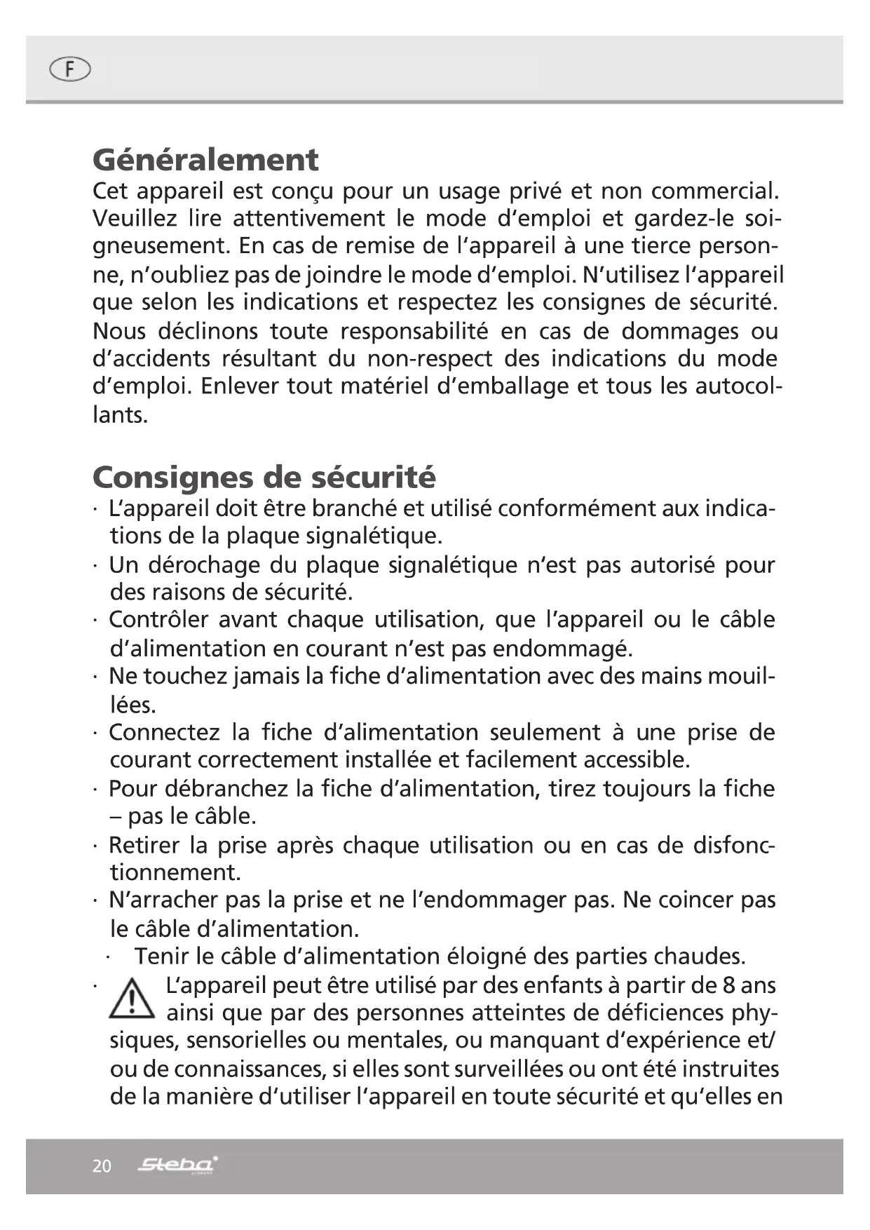 58,55 dB(A) Maximum air velocity c 3,25 meters/sec Measurement standard for service value IEC 60879:1986(CORR.1992) Contact details for obtaining more infor- mation Steba Elektrogeräte GmbH & Co.KG Pointstr. 2 96129 Strullendorf19 Correct Disposal of this product This marking indicates that this product should not be disposed with other household wastes throughout the EU. To prevent possible harm to the envi- ronment or human health from uncontrolled waste disposal, recycle it re- sponsibly to promote the sustainable reuse of material resources. To return your used device, please use the return and collection systems or contact the retailer where the product was purchased. They can take this product for environmental safe recycling. Packaging disposal: Do not throw away the package materials. Please put it in the recycling bin. Gift box: Paper, should be put to the old paper collection point. Plastic packaging material and foils should be collected in the spe- cial collection containers. Service and Repair: If the appliance must be repaired, please get in touch with your trader or with the manufacturer: STEBA Elektrogeräte GmbH & Co KG Pointstr. 2, 96129 Strullendorf / Germany Distribution-Tel.: 09543 / 449-17 / -18, Service-Tel.: 09543 / 449-44, Fax: 09543 / 449-19 e-Mail: elektro@steba.com Internet: http://www.steba.com20 Généralement Cet appareil est conçu pour un usage privé et non commercial. Veuillez lire attentivement le mode d‘emploi et gardez-le soi- gneusement. En cas de remise de l‘appareil à une tierce person- ne, n’oubliez pas de joindre le mode d’emploi. N’utilisez l‘appareil que selon les indications et respectez les consignes de sécurité. Nous déclinons toute responsabilité en cas de dommages ou d’accidents résultant du non-respect des indications du mode d’emploi. Enlever tout matériel d’emballage et tous les autocol- lants. Consignes de sécurité ∙ L‘appareil doit être branché et utilisé conformément aux indica- tions de la plaque signalétique. ∙ Un dérochage du plaque signalétique n‘est pas autorisé pour des raisons de sécurité. ∙ Contrôler avant chaque utilisation, que l’appareil ou le câble d’alimentation en courant n’est pas endommagé. ∙ Ne touchez jamais la fiche d’alimentation avec des mains mouil- lées. ∙ Connectez la fiche d’alimentation seulement à une prise de courant correctement installée et facilement accessible. ∙ Pour débranchez la fiche d’alimentation, tirez toujours la fiche – pas le câble. ∙ Retirer la prise après chaque utilisation ou en cas de disfonc- tionnement. ∙ N’arracher pas la prise et ne l’endommager pas. Ne coincer pas le câble d’alimentation. ∙ Tenir le câble d’alimentation éloigné des parties chaudes. ∙ L‘appareil peut être utilisé par des enfants à partir de 8 ans ainsi que par des personnes atteintes de déficiences phy- siques, sensorielles ou mentales, ou manquant d‘expérience et/ ou de connaissances, si elles sont surveillées ou ont été instruites de la manière d‘utiliser l‘appareil en toute sécurité et qu‘elles en21 ont compris les dangers potentiels. Le nettoyage et l‘entretien de l‘appareil ne doivent pas être réalisés par des enfants, sauf s‘ils sont âgés de plus de 8 ans et exécutent ces opérations sous surveillance. ∙ Tenir l‘appareil et le cordon d‘alimentation hors de portée des enfants de moins de 8 ans. ∙ Veillez á ce que des enfants ne jouent pas avec l’emballage (par exemple sac en plastique). ∙ L´appareil ne doit pas fonctionner avec une minuterie ou avec un système séparé de télécommande ! ∙ Ne sortez jamais de chez vous sans éteindre l’appareil, assurez-vous que l’interrupteur soit en position Eteint. ∙ N‘entreposez pas l‘appareil à l‘extérieur ou dans une pièce hu- mide. ∙ Ne mettez jamais l‘appareil dans l‘eau. ∙ N‘utilisez jamais l‘appareil après un fonctionnement défaillant, par ex. s’il est tombé ou s’il a été endommagé d‘une autre ma- nière. ∙ Le fabricant ne sera pas tenu responsable en cas de mauvaise utilisation ou d‘utilisation inappropriée par non-respect du mode d‘emploi. ∙ Pour éviter tout danger, les réparations sur l‘appareil, notam- ment le remplacement d‘un câble endommagé, ne peuvent être réalisées que par un service après-vente autorisé. Seule- ment les pièces détachées original peuvent être utiliser. ∙ N‘utilisez l‘appareil que pour les applications décrites dans le mode d‘emploi. ∙ Ne soufflez pas avec l’appareil sur une flamme (par ex. cheminée, bougies etc.), des bébés ou des patients. Veillez à ce que les ouvertures d‘aspiration / d‘évacuation ne soient pas recouvertes ! ∙ Pendant le fonctionnement, ne mettez jamais des choses dans le treillis.22 ∙ Cet appareil est conçu pour un usage privé et similaires telles que : o dans les cuisines pour les employés dans les magasins, bu- reaux et autres zones industrielles o dans les propriétés agricoles et par les clients des hôtels, motels et autres établissements résidentiels o dans chambres d’hôtes ∙ Si vous utilisez une rallonge, celle-ci doit avoir une section de 1,5 mm². ∙ Si vous utilisez une multiprise testée pas GS avec 16 A, il est interdit de le charger avec plus de 3680 watts en raison d’un danger incendie. ∙ Si vous utilisez une rallonge, faire attention que les enfants ne le tirent pas où trébucher sur le câble. ∙ Tirez Ia fiche d‘alimentations toujours si l‘appareil est sans sur- veillance, avant le montage, le démontage, ou le nettoyage. ∙ Nettoyage ∙ Toujours débrancher l´appareil et le laisser com- plétement refroidir avant de le nettoyer. ∙ Ne jamais plonger l’appareil dans l’eau. ∙ Pour un nettoyage du boîtier, utilisez un chiffon humide. ∙ Quand la grille d’aération est poussiéreuse, on peut la nettoyer avec un aspirateur. Plan de travail 