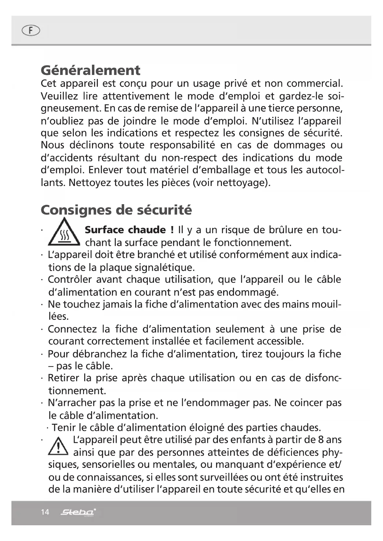 Burnt bread produces acrylamide! ∙ Press the lever down until it engages. ∙ Once the desired degree of browning is reached, the lifting mechanism automati- cally lifts the toast. ∙ Stop the toasting process: press the button to cancel the process. ∙ Warm up toast: press the button immediately after turning on the device. 2 LEDs light up and the toast is warmed. ∙ Defrosting: press the button immediately after turning on the device. The toasting time will be extended. ∙ Bun warmer: open the bun warmer and place it onto the toaster. Select the de- gree of browning 3 and press the lever downwards. Put the buns (maybe lightly moistened) on the warmer and turn after half of the time.13 Correct Disposal of this product This marking indicates that this product should not be disposed with other household wastes throughout the EU. To prevent possible harm to the envi- ronment or human health from uncontrolled waste disposal, recycle it re- sponsibly to promote the sustainable reuse of material resources. To return your used device, please use the return and collection systems or contact the retailer where the product was purchased. They can take this product for environmental safe recycling. Packaging disposal: Do not throw away the package materials. Please put it in the recycling bin. Gift box: Paper, should be put to the old paper collection point. Plastic packaging material and foils should be collected in the spe- cial collection containers. Service and Repair: If the appliance must be repaired, please get in touch with your trader or with the manufacturer: STEBA Elektrogeräte GmbH & Co KG Pointstr. 2, 96129 Strullendorf / Germany Distribution-Tel.: 09543 / 449-17 / -18, Service-Tel.: 09543 / 449-44, Fax: 09543 / 449-19 e-Mail: elektro@steba.com Internet: http://www.steba.com14 Généralement Cet appareil est conçu pour un usage privé et non commercial. Veuillez lire attentivement le mode d‘emploi et gardez-le soi- gneusement. En cas de remise de l‘appareil à une tierce personne, n’oubliez pas de joindre le mode d’emploi. N’utilisez l‘appareil que selon les indications et respectez les consignes de sécurité. Nous déclinons toute responsabilité en cas de dommages ou d’accidents résultant du non-respect des indications du mode d’emploi. Enlever tout matériel d’emballage et tous les autocol- lants. Nettoyez toutes les pièces (voir nettoyage). Consignes de sécurité ∙ Surface chaude ! Il y a un risque de brûlure en tou- chant la surface pendant le fonctionnement. ∙ L‘appareil doit être branché et utilisé conformément aux indica- tions de la plaque signalétique. ∙ Contrôler avant chaque utilisation, que l’appareil ou le câble d’alimentation en courant n’est pas endommagé. ∙ Ne touchez jamais la fiche d’alimentation avec des mains mouil- lées. ∙ Connectez la fiche d’alimentation seulement à une prise de courant correctement installée et facilement accessible. ∙ Pour débranchez la fiche d’alimentation, tirez toujours la fiche – pas le câble. ∙ Retirer la prise après chaque utilisation ou en cas de disfonc- tionnement. ∙ N’arracher pas la prise et ne l’endommager pas. Ne coincer pas le câble d’alimentation. ∙ Tenir le câble d’alimentation éloigné des parties chaudes. ∙ L‘appareil peut être utilisé par des enfants à partir de 8 ans ainsi que par des personnes atteintes de déficiences phy- siques, sensorielles ou mentales, ou manquant d‘expérience et/ ou de connaissances, si elles sont surveillées ou ont été instruites de la manière d‘utiliser l‘appareil en toute sécurité et qu‘elles en15 ont compris les dangers potentiels. Le nettoyage et l‘entretien de l‘appareil ne doivent pas être réalisés par des enfants, sauf s‘ils sont âgés de plus de 8 ans et exécutent ces opérations sous surveillance. ∙ Tenir l‘appareil et le cordon d‘alimentation hors de portée des enfants de moins de 8 ans. ∙ Veillez á ce que des enfants ne jouent pas avec l’emballage (par exemple sac en plastique). ∙ L´appareil ne doit pas fonctionner avec une minuterie ou avec un système séparé de télécommande ! ∙ Ne laissez jamais l‘appareil sans surveillance lors de son fonc- tionnement. ∙ N‘entreposez pas l‘appareil à l‘extérieur ou dans une pièce hu- mide. ∙ Risque de choc électrique ! Ne touchez jamais le fente chaud avec des objets métalliques ou vos doigts ! ∙ Ne mettez jamais l‘appareil dans l‘eau. ∙ N‘utilisez jamais l‘appareil après un fonctionnement défaillant, par ex. s’il est tombé ou s’il a été endommagé d‘une autre ma- nière. ∙ Le fabricant ne sera pas tenu responsable en cas de mauvaise utilisation ou d‘utilisation inappropriée par non-respect du mode d‘emploi. ∙ Pour éviter tout danger, les réparations sur l‘appareil, notam- ment le remplacement d‘un câble endommagé, ne peuvent être réalisées que par un service après-vente autorisé. Seule- ment les pièces détachées original peuvent être utiliser. ∙ L‘appareil chauffe beaucoup, ne le transportez donc qu‘après refroidissement. ∙ N‘utilisez l‘appareil que pour les applications décrites dans le mode d‘emploi. ∙ Ne placez aucun des matériaux que le papier, carton, plastique etc. dans l’appareil.16 ∙ Cet appareil est conçu pour un usage privé et similaires telles que : o dans les cuisines pour les employés dans les magasins, bureaux et autres zones industrielles o dans les propriétés agricoles et par les clients des hôtels, motels et autres établissements résidentiels o dans chambres d’hôtes ∙ Avant la première utilisation : toutes les pièces doivent être nettoyées et séchées minutieusement. Pour éliminer l‘odeur du neuf, faites chauffer l‘appareil pendant 2 – fois sans toast. ∙ Attention ! L´extérieur de l´appareil devient chaud. Risque de brûlures. Pendant le fonctionne- ment, la température des 