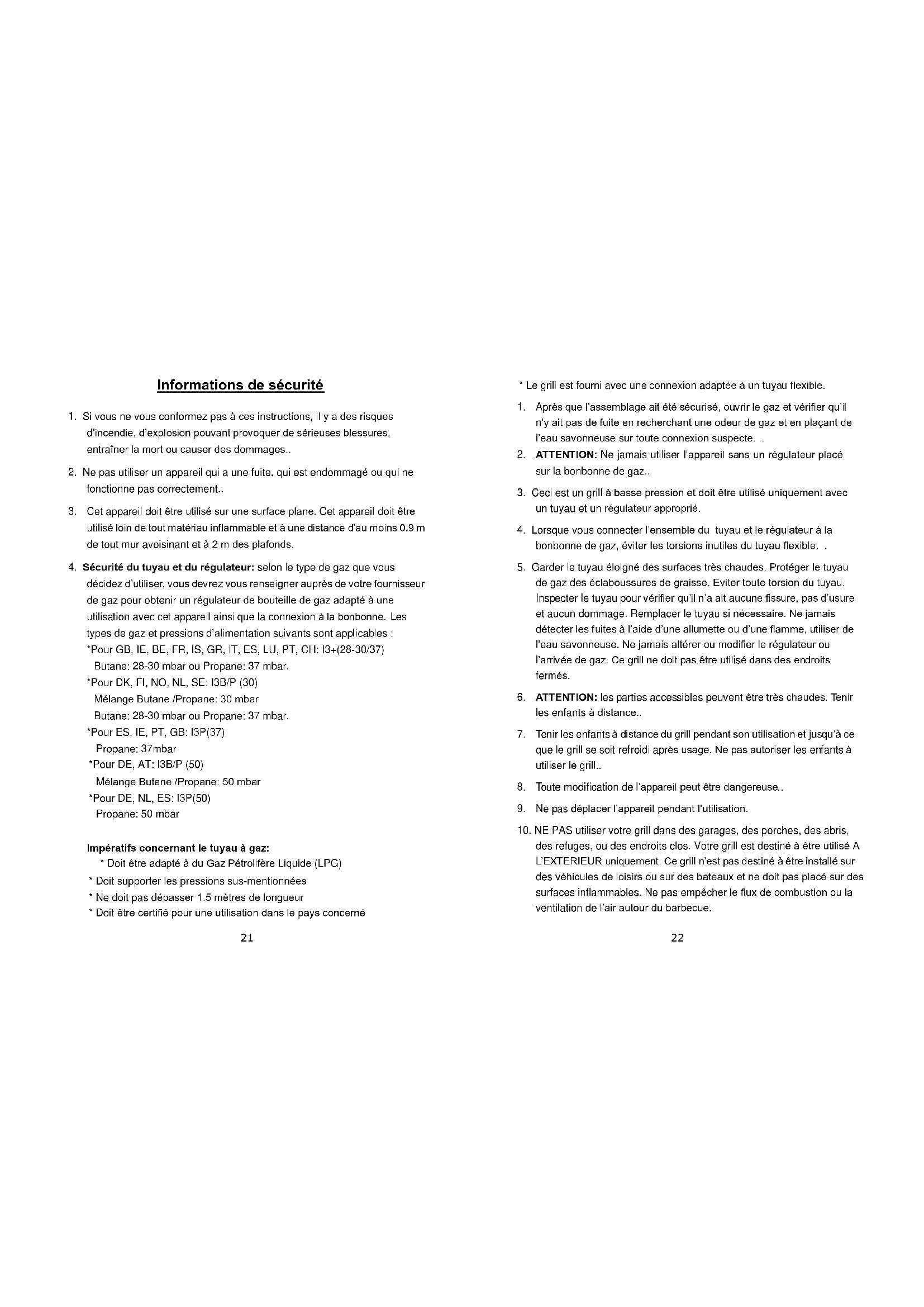décidez d’utiliser, vous devrez vous renseigner auprès de votre fournisseur de gaz pour obtenir un régulateur de bouteille de gaz adapté à une utilisation avec cet appareil ainsi que la connexion à la bonbonne. Les types de gaz et pressions d’alimentation suivants sont applicables : *Pour GB, IE, BE, FR, IS, GR, IT, ES, LU, PT, CH: I3+(28-30/37) Butane: 28-30 mbar ou Propane: 37 mbar. *Pour DK, FI, NO, NL, SE: I3B/P (30) Mélange Butane /Propane: 30 mbar Butane: 28-30 mbar ou Propane: 37 mbar. *Pour ES, IE, PT, GB: I3P(37) Propane: 37mbar *Pour DE, AT: I3B/P (50) Mélange Butane /Propane: 50 mbar *Pour DE, NL, ES: I3P(50) Propane: 50 mbar Impératifs concernant le tuyau à gaz: