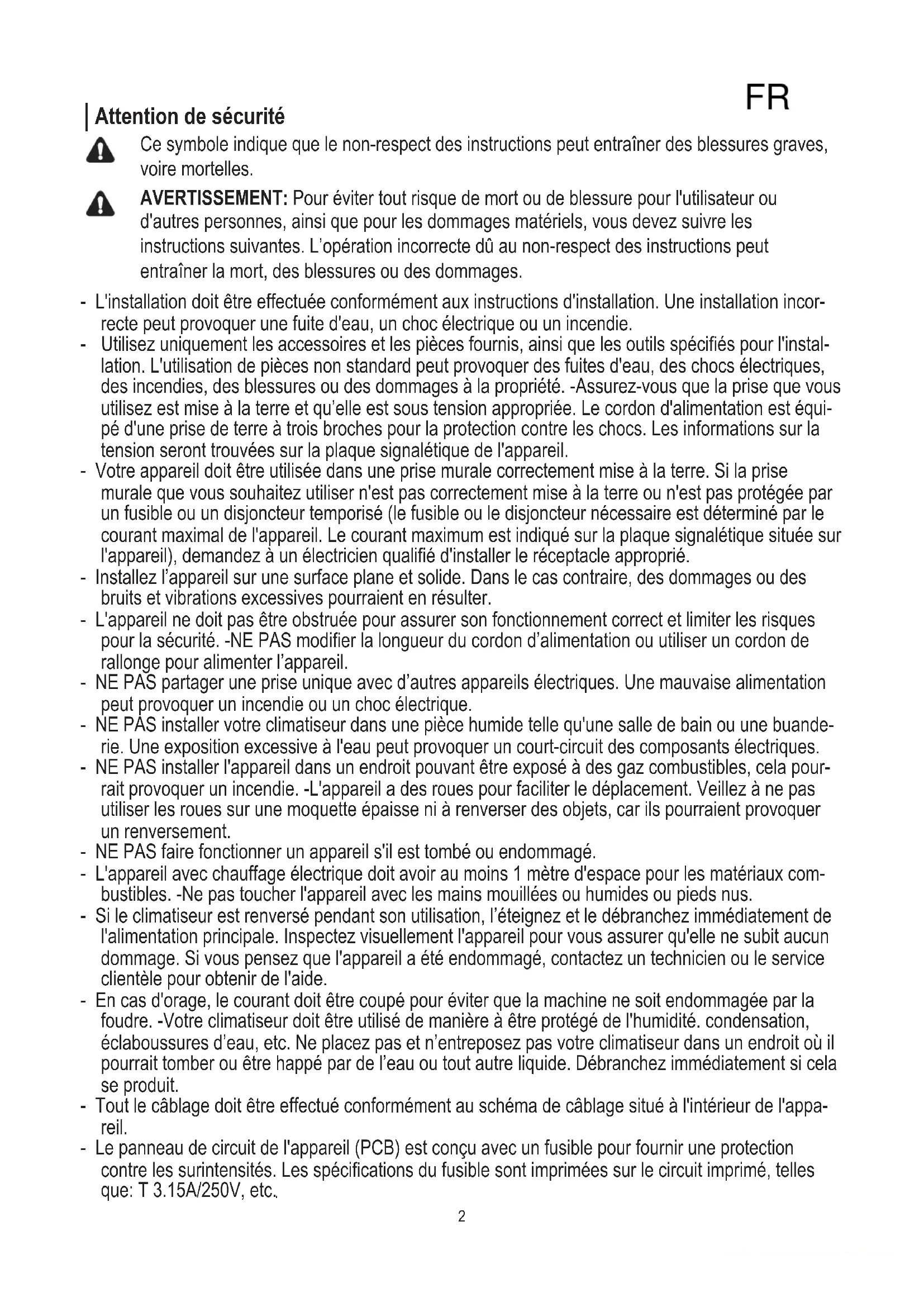 d'autres personnes, ainsi que pour les dommages matériels, vous devez suivre les instructions suivantes. L’opération incorrecte dû au non-respect des instructions peut entraîner la mort, des blessures ou des dommages. - L'installation doit être effectuée conformément aux instructions d'installation. Une installation incor- recte peut provoquer une fuite d'eau, un choc électrique ou un incendie. - Utilisezuniquementlesaccessoiresetlespiècesfournis,ainsiquelesoutilsspéciéspourl'instal- lation. L'utilisation de pièces non standard peut provoquer des fuites d'eau, des chocs électriques, des incendies, des blessures ou des dommages à la propriété. -Assurez-vous que la prise que vous utilisez est mise à la terre et qu’elle est sous tension appropriée. Le cordon d'alimentation est équi- pé d'une prise de terre à trois broches pour la protection contre les chocs. Les informations sur la tension seront trouvées sur la plaque signalétique de l'appareil. - Votre appareil doit être utilisée dans une prise murale correctement mise à la terre. Si la prise murale que vous souhaitez utiliser n'est pas correctement mise à la terre ou n'est pas protégée par un fusible ou un disjoncteur temporisé (le fusible ou le disjoncteur nécessaire est déterminé par le courant maximal de l'appareil. Le courant maximum est indiqué sur la plaque signalétique située sur l'appareil),demandezàunélectricienqualiéd'installerleréceptacleapproprié. - Installez l’appareil sur une surface plane et solide. Dans le cas contraire, des dommages ou des bruits et vibrations excessives pourraient en résulter. - L'appareil ne doit pas être obstruée pour assurer son fonctionnement correct et limiter les risques pourlasécurité.-NEPASmodierlalongueurducordond’alimentationouutiliseruncordonde rallonge pour alimenter l’appareil. - NE PAS partager une prise unique avec d’autres appareils électriques. Une mauvaise alimentation peut provoquer un incendie ou un choc électrique. - NE PAS installer votre climatiseur dans une pièce humide telle qu'une salle de bain ou une buande- rie. Une exposition excessive à l'eau peut provoquer un court-circuit des composants électriques. - NE PAS installer l'appareil dans un endroit pouvant être exposé à des gaz combustibles, cela pour- rait provoquer un incendie. -L'appareil a des roues pour faciliter le déplacement. Veillez à ne pas utiliser les roues sur une moquette épaisse ni à renverser des objets, car ils pourraient provoquer un renversement. - NE PAS faire fonctionner un appareil s'il est tombé ou endommagé. - L'appareil avec chauffage électrique doit avoir au moins 1 mètre d'espace pour les matériaux com- bustibles. -Ne pas toucher l'appareil avec les mains mouillées ou humides ou pieds nus. - Si le climatiseur est renversé pendant son utilisation, l’éteignez et le débranchez immédiatement de l'alimentation principale. Inspectez visuellement l'appareil pour vous assurer qu'elle ne subit aucun dommage. Si vous pensez que l'appareil a été endommagé, contactez un technicien ou le service clientèle pour obtenir de l'aide. - En cas d'orage, le courant doit être coupé pour éviter que la machine ne soit endommagée par la foudre. -Votre climatiseur doit être utilisé de manière à être protégé de l'humidité. condensation, éclaboussures d’eau, etc. Ne placez pas et n’entreposez pas votre climatiseur dans un endroit où il pourrait tomber ou être happé par de l’eau ou tout autre liquide. Débranchez immédiatement si cela se produit. - Tout le câblage doit être effectué conformément au schéma de câblage situé à l'intérieur de l'appa- reil. - Le panneau de circuit de l'appareil (PCB) est conçu avec un fusible pour fournir une protection contrelessurintensités.Lesspécicationsdufusiblesontimpriméessurlecircuitimprimé,telles que: T 3.15A/250V, etc.