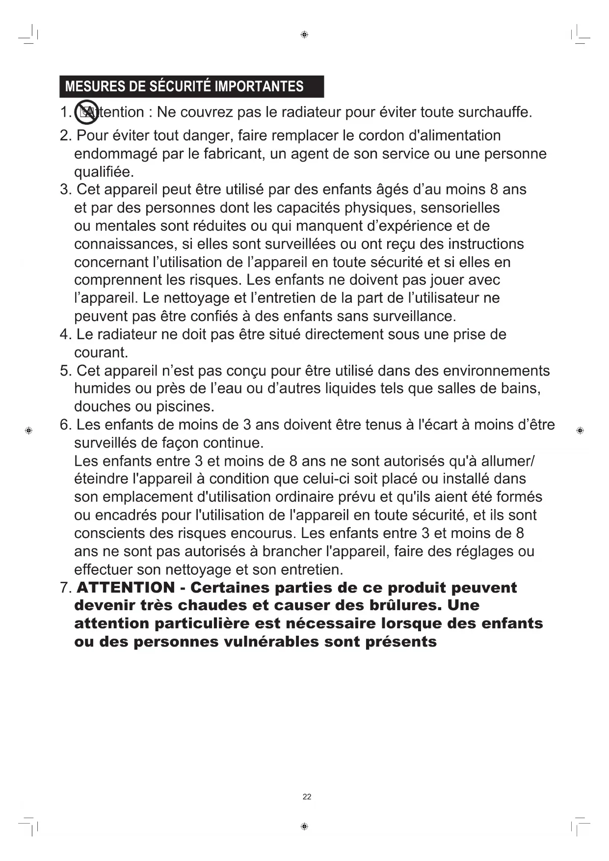 1. Attention : Ne couvrez pas le radiateur pour éviter toute surchauffe.