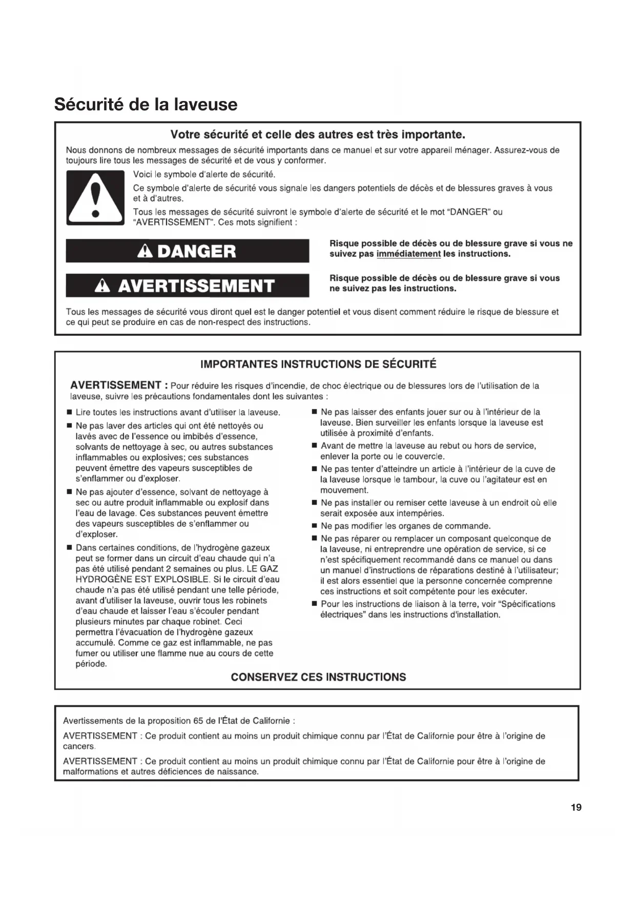 IMPORTANT : Pour éviter tout dommage, installer et remiser la laveuse à l’abri du gel. L’eau qui peut rester dans les tuyaux risque d’abîmer la laveuse en temps de gel. Si la laveuse doit faire l’objet d’un déménagement ou d’entreposage au cours d’une période de gel, hivériser la laveuse. Hivérisation de la laveuse :