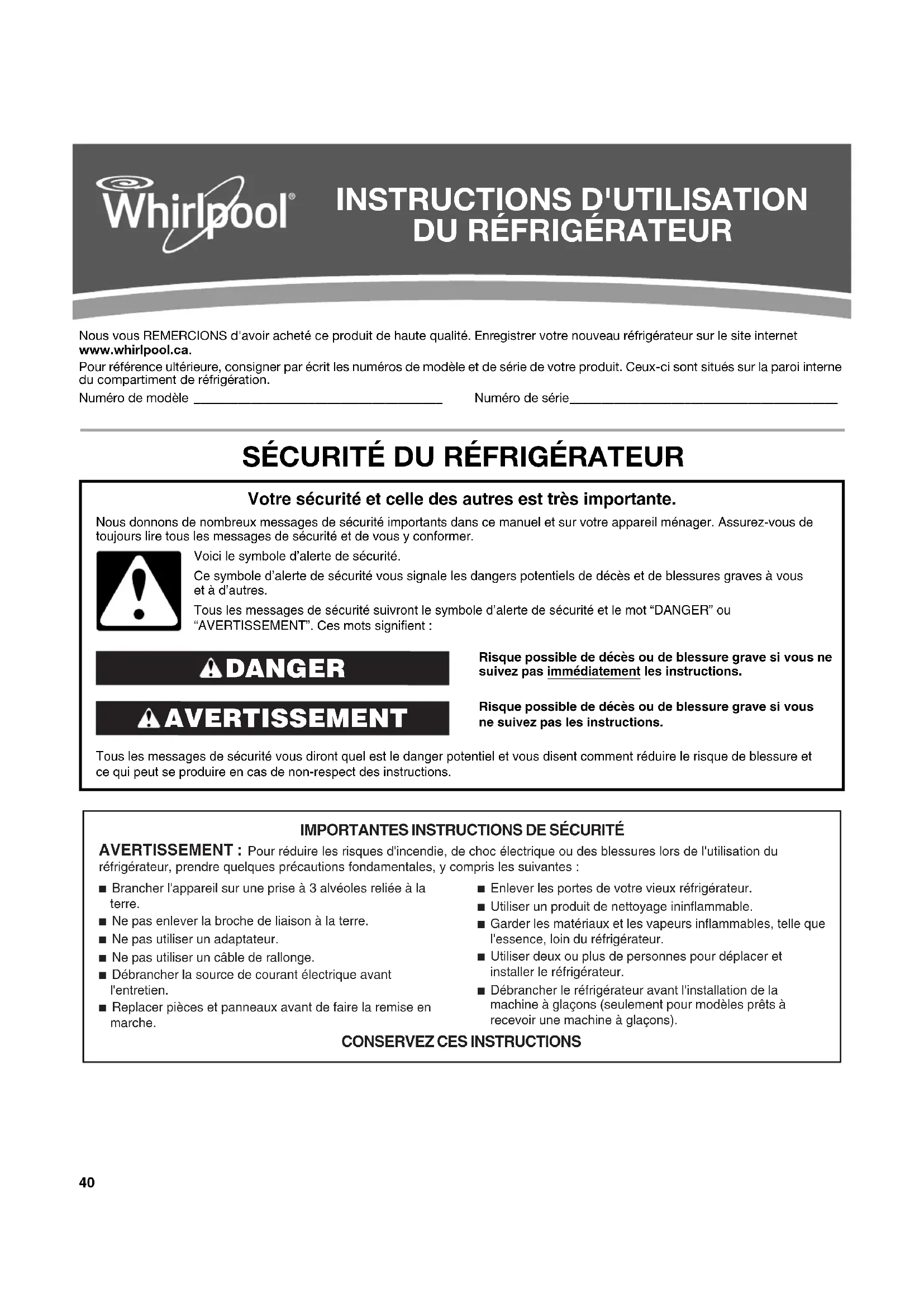 d'alimentation électrique au dos du réfrigérateur à l'aide de ruban adhésif. Lorsque vous arriverez à votre nouvelle habitation, remettez tout en place et consultez la section “Instructions d’installation” pour les instructions de préparation. D'autre part, si votre réfrigérateur a une machine à glaçons automatique, rappelez-vous de raccorder l’approvisionnement d’eau au réfrigérateur.57 DÉPANNAGE Essayer d'abord les solutions suggérées ici. Pour obtenir de l'aide ou des conseils qui permettront peut-être d'éviter une intervention de dépannage, consulter la page de garantie de ce manuel et scanner le code avec votre appareil intelligent, ou consulter le site internet www.whirlpool.ca. Vous pouvez adresser tous commentaires ou questions par courrier à l'adresse ci-dessous : Aux États-Unis :Whirlpool Brand Home AppliancesCustomer eXperience Center553 Benson RoadBenton Harbor, MI 49022-2692Au Canada :Whirlpool Brand Home AppliancesCustomer eXperience Centre200 - 6750 Century Ave.Mississauga ON L5N 0B7Dans votre correspondance, veuillez indiquer un numéro de téléphone où l'on peut vous joindre dans la journée. Fonctionnement du réfrigérateur Le réfrigérateur ne fonctionne pas ■ Le cordon d'alimentation électrique est-il débranché? Brancher sur une prise à 3 alvéoles reliée à la terre. ■ La prise électrique fonctionne-t-elle? Brancher une lampe pour voir si la prise fonctionne. ■ Un fusible est-il grillé ou un disjoncteur s'est-il ouvert? Remplacer le fusible ou réenclencher le disjoncteur. Si le problème persiste, appeler un électricien.■ La(les) commande(s) est(sont)-elle(s) en marche? S'assurer que la commande du réfrigérateur est bien en marche. Voir “Utilisation de la(des) commande(s)”. ■ S'agit-il d'une nouvelle installation? Accorder 24 heures après l'installation pour que le réfrigérateur se refroidisse complètement. REMARQUE : Régler la(les) commande(s) de température sur la position la plus froide ne fera pas refroidir le réfrigérateur plus rapidement. Les lampes ne fonctionnent pas ■ Les ampoules ont-elles grillé? Remplacer les ampoules. Voir “Remplacement des ampoules d'éclairage”.Le moteur semble trop tourner Il se peut que votre nouveau réfrigérateur fonctionne plus longtemps que l'ancien grâce à son compresseur à haute efficacité et ses ventilateurs. L'appareil peut fonctionner plus longtemps encore si la température de la pièce est chaude, si une importante quantité de nourriture y est ajoutée, si la porte est fréquemment ouverte ou si elle a été laissée ouverte. Le réfrigérateur semble bruyantLe bruit des réfrigérateurs a été réduit au cours des années. Du fait de cette réduction, il est possible d'entendre des bruits intermittents venant de votre nouveau réfrigérateur qui n'avaient pas été décelés avec votre ancien modèle. Voici une liste des sons normaux accompagnés d'explications. ■ Bourdonnement - entendu lorsque le robinet d'arrivée d'eau s'ouvre pour remplir la machine à glaçons ■ Pulsation - les ventilateurs/le compresseur se règlent afin d'optimiser la performance ■ Sifflement/cliquetis - écoulement de liquide réfrigérant, mouvement des conduites d'eau ou d'objets posés sur le dessus du réfrigérateur ■ Grésillement/gargouillement - de l'eau tombe sur l'élément de chauffage durant le programme de dégivrage ■ Bruit d'éclatement - contraction/expansion des parois internes, particulièrement lors du refroidissement initial ■ Bruit d’écoulement d’eau - peut être entendu lorsque la glace fond lors du programme de dégivrage et que l’eau s’écoule dans le plateau de dégivrage ■ Grincement/craquement - se produit lorsque la glace est éjectée du moule à glaçonsLes portes ne se ferment pas complètement ou elles ne restent pas fermées ■ La porte est-elle bloquée en position ouverte? Déplacer les emballages d'aliments pour libérer la porte. ■ Un compartiment ou une tablette bloquent-ils le passage? Replacer le compartiment ou la tablette en position correcte. ■ Le couvercle du bac à légumes fait-il obstruction? Vérifier que le couvercle du bac à légumes est enfoncé complètement de sorte que l'arrière repose sur les supports. ■ Le réfrigérateur n'est-il pas incliné vers l'arrière? Pour que les portes se ferment plus facilement, soulever l'avant du réfrigérateur de façon à ce qu'il s'incline légèrement vers l'arrière. Voir “Réglage des portes”. ■ La porte se ferme-t-elle trop rapidement? Fermer doucement et fermement la porte pour l'empêcher de s'ouvrir. AVERTISSEMENT Risque de choc électrique Brancher sur une prise à 3 alvéoles reliée à la terre. Ne pas enlever la broche de liaison à la terre. Ne pas utiliser un adaptateur. Ne pas utiliser un câble de rallonge. Le non-respect de ces instructions peut causer un décès, un incendie ou un choc électrique.58 La porte est difficile à ouvrir ■ Les joints d'étanchéité sont-ils sales ou collants? Nettoyer les joints et les surfaces de contact au savon doux et à l'eau tiède. Rincer et sécher avec un linge doux. Température et humidité La température est trop élevée ■ S'agit-il d'une nouvelle installation? Accorder 24 heures après l'installation pour que le réfrigérateur se refroidisse complètement. ■ La porte est-elle ouverte fréquemment ou a-t-elle été laissée ouverte? Ceci permet à l'air chaud de pénétrer dans le réfrigérateur. Réduire le nombre d’ouvertures de la porte et la maintenir complètement fermée. ■ Une importante quantité d'aliments a-t-elle été ajoutée? Accorder quelques heures pour que le réfrigérateur revienne à sa température normale. ■ La(Les) commande(s) est(sont)-elle(s) correcte(s) pour les conditions existantes? Ajuster la(les) commande(s) à un réglage plus froid. Vérifier la température au bout de 24 heures. Voir “Utilisation de la(des) commande(s)”. Il y a u