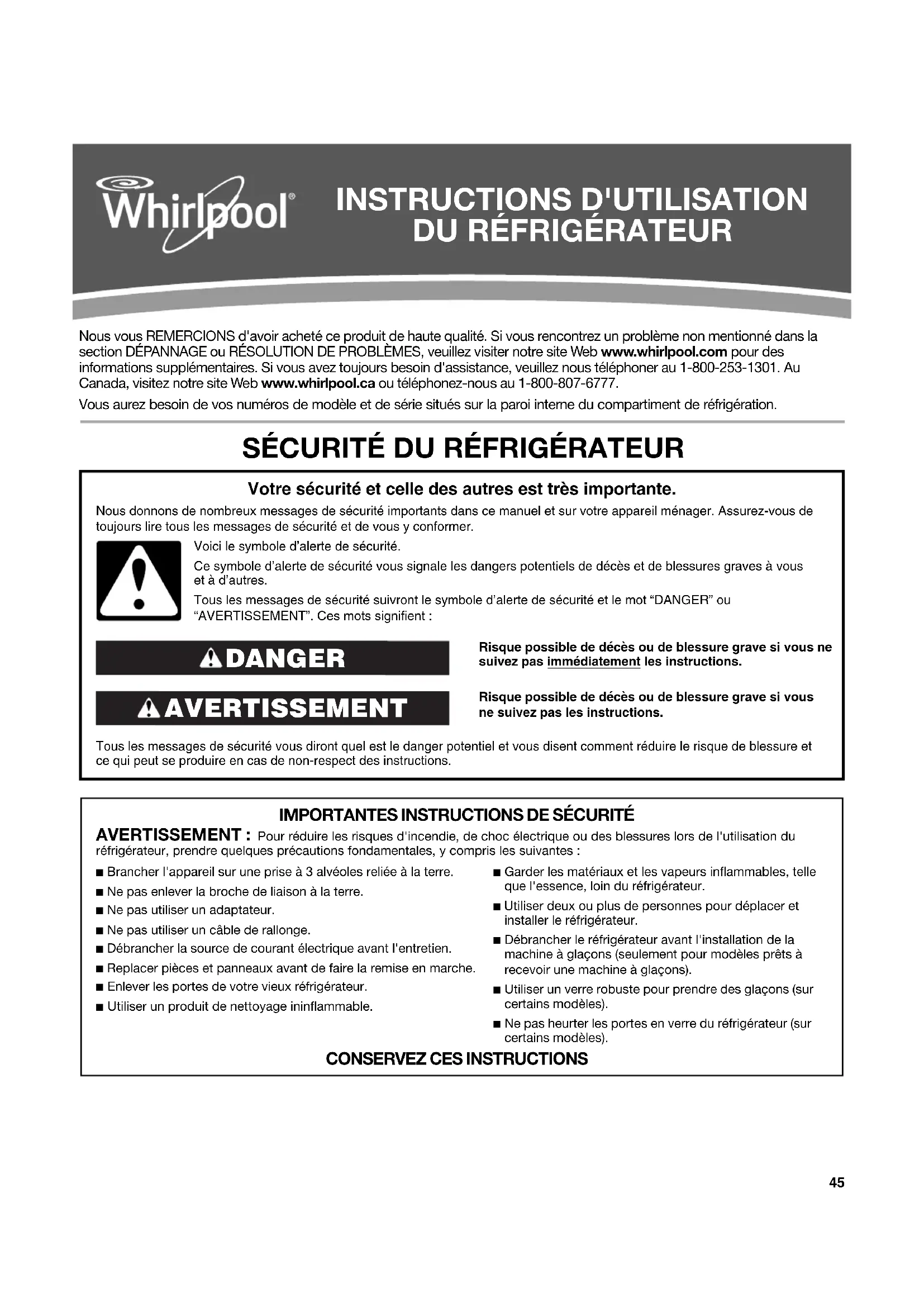 d'alimentation électrique au dos du réfrigérateur à l'aide de ruban adhésif. Lorsque vous arriverez à votre nouvelle habitation, remettez tout en place et consulter la section “Instructions d’installation” pour les instructions de préparation. D'autre part, si votre réfrigérateur a une machine à glaçons automatique, rappelez-vous de raccorder l’approvisionnement d’eau au réfrigérateur.61 DÉPANNAGE Essayer d’abord les solutions suggérées ici ou visiter notre site Internet et la FAQ (foire aux questions) pour éviter le coût d'une intervention de dépannage. Aux É.-U., www.whirlpool.com Au Canada, www.whirlpool.ca Fonctionnement du réfrigérateur Le réfrigérateur ne fonctionne pas ■ Le cordon d'alimentation électrique est-il débranché? Brancher sur une prise à 3 alvéoles reliée à la terre. ■ La prise électrique fonctionne-t-elle? Brancher une lampe pour voir si la prise fonctionne.■ Un fusible est-il grillé ou un disjoncteur s'est-il déclenché? Remplacer le fusible ou réarmer le disjoncteur. Si le problème persiste, appeler un électricien. ■ Les commandes sont-elles en marche? S'assurer que les commandes du réfrigérateur sont en marche. Voir “Utilisation de la(des) commande(s)”. ■ S'agit-il d'une nouvelle installation? Accorder 24 heures après l'installation pour que le réfrigérateur se refroidisse complètement. REMARQUE : Mettre les commandes de la température sur la position la plus froide ne refroidira aucun des compartiments plus rapidement.Le moteur semble trop tourner Il se peut que votre nouveau réfrigérateur fonctionne plus longtemps que l'ancien grâce à son compresseur à haute efficacité et ses ventilateurs. L'appareil peut fonctionner plus longtemps encore si la température de la pièce est chaude, si une importante quantité de nourriture y est ajoutée, si les portes sont fréquemment ouvertes ou si elles ont été laissées ouvertes.Le réfrigérateur semble bruyantLe bruit des réfrigérateurs a été réduit au cours des années. Du fait de cette réduction, il est possible d'entendre des bruits intermittents venant de votre nouveau réfrigérateur qui n'avaient pas été décelés avec votre ancien modèle. Voici une liste des sons normaux accompagnés d'explications. ■ Bourdonnement - entendu lorsque le robinet d'arrivée d'eau s'ouvre pour remplir la machine à glaçons ■ Pulsation - les ventilateurs/le compresseur se règlent afin d'optimiser la performance ■ Sifflement/cliquetis - écoulement de liquide réfrigérant, mouvement des conduites d'eau ou d'objets posés sur le dessus du réfrigérateur ■ Grésillement/gargouillement - de l'eau tombe sur l'élément de chauffage durant le programme de dégivrage ■ Bruit d'éclatement - contraction/expansion des parois internes, particulièrement lors du refroidissement initial ■ Bruit d'écoulement d'eau - peut être entendu lorsque la glace fond lors du programme de dégivrage et que l'eau s'écoule dans le plateau de dégivrage ■ Grincement/craquement - se produit lorsque la glace est éjectée du moule à glaçons.Les portes ne ferment pas complètement ■ La porte est-elle bloquée en position ouverte? Déplacer les emballages d'aliments pour libérer la porte. ■ Un compartiment ou une tablette bloque-t-il/elle le passage? Replacer le compartiment ou la tablette en position correcte.Les portes sont difficiles à ouvrir ■ Les joints d'étanchéité sont-ils sales ou collants? Nettoyer les joints et les surfaces de contact au savon doux et à l'eau tiède. Rincer et sécher avec un linge doux. AVERTISSEMENT Risque de choc électrique Brancher sur une prise à 3 alvéoles reliée à la terre. Ne pas enlever la broche de liaison à la terre. Ne pas utiliser un adaptateur. Ne pas utiliser un câble de rallonge. Le non-respect de ces instructions peut causer un décès, un incendie ou un choc électrique. AVERTISSEMENT Risque d'explosion Utiliser un produit de nettoyage ininflammable. Le non-respect de cette instruction peut causer un décès, une explosion ou un incendie.62 Température et humidité La température est trop élevée ■ S'agit-il d'une nouvelle installation? Accorder 24 heures après l'installation pour que le réfrigérateur se refroidisse complètement. ■ La/Les porte(s) est/sont-elle(s) fréquemment ouverte(s) ou laissée(s) ouverte(s)? Ceci permet à l'air chaud de pénétrer dans le réfrigérateur. Minimiser les ouvertures de porte et garder les portes complètement fermées. ■ Une importante quantité d'aliments a-t-elle été ajoutée? Accorder quelques heures pour que le réfrigérateur revienne à sa température normale. ■ Les commandes sont-elles correctement réglées pour les conditions existantes? Ajuster les commandes un cran plus froid. Vérifier la température au bout de 24 heures. Voir “Utilisation de la(des) commande(s)”. Il y a une accumulation d'humidité à l'intérieur REMARQUE : Une certaine accumulation d'humidité est normale. ■ La pièce est-elle humide? Ceci contribue à l'accumulation de l'humidité. ■ La/Les porte(s) est/sont-elle(s) fréquemment ouverte(s) ou laissée(s) ouverte(s)? Ceci permet à l'air humide de pénétrer dans le réfrigérateur. Minimiser les ouvertures de porte et garder les portes complètement fermées. Glaçons et eau La machine à glaçons ne produit pas ou pas suffisamment de glaçons ■ Le réfrigérateur est-il connecté à l'alimentation en eau et le robinet d'arrêt d'eau est-il ouvert? Brancher le réfrigérateur à l'alimentation en eau et ouvrir le robinet d'arrêt d'eau complètement. ■ La canalisation de la source d'eau du domicile comporte- t-elle une déformation? Une déformation dans la canalisation peut réduire l'écoulement d'eau. Redresser la canalisation d'eau. ■ La machine à glaçons est-elle allumée? S'assurer que le bras de commande en broche ou l'interrupteur (selon le modèle) est en position ON (marche). ■ S'agit