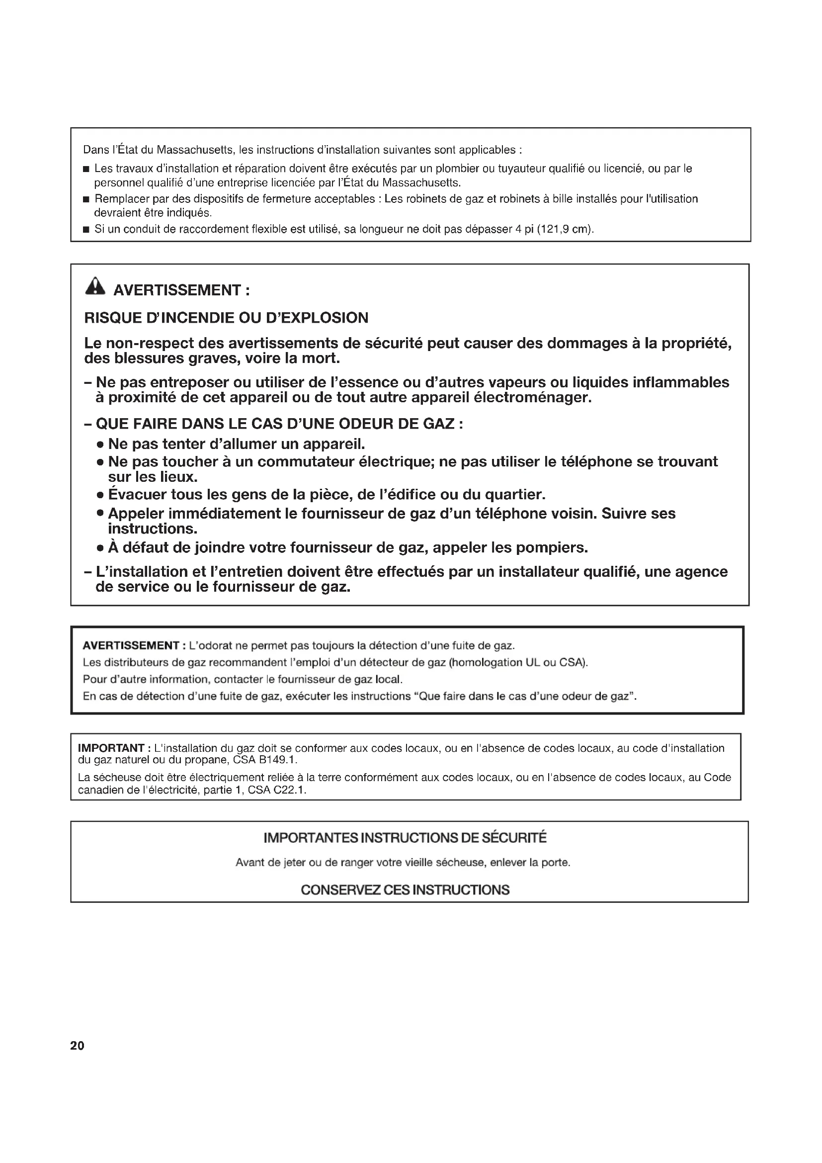 Dans l’État du Massachusetts, les instructions d’installation suivantes sont applicables : ■ Les travaux d’installation et réparation doivent être exécutés par un plombier ou tuyauteur qualifié ou licencié, ou par le personnel qualifié d’une entreprise licenciée par l’État du Massachusetts. ■ Remplacer par des dispositifs de fermeture acceptables : Les robinets de gaz et robinets à bille installés pour l'utilisation devraient être indiqués. ■ Si un conduit de raccordement flexible est utilisé, sa longueur ne doit pas dépasser 4 pi (121,9 cm). – Ne pas entreposer ou utiliser de l’essence ou d’autres vapeurs ou liquides inammables à proximité de cet appareil ou de tout autre appareil électroménager. – QUE FAIRE DANS LE CAS D’UNE ODEUR DE GAZ :