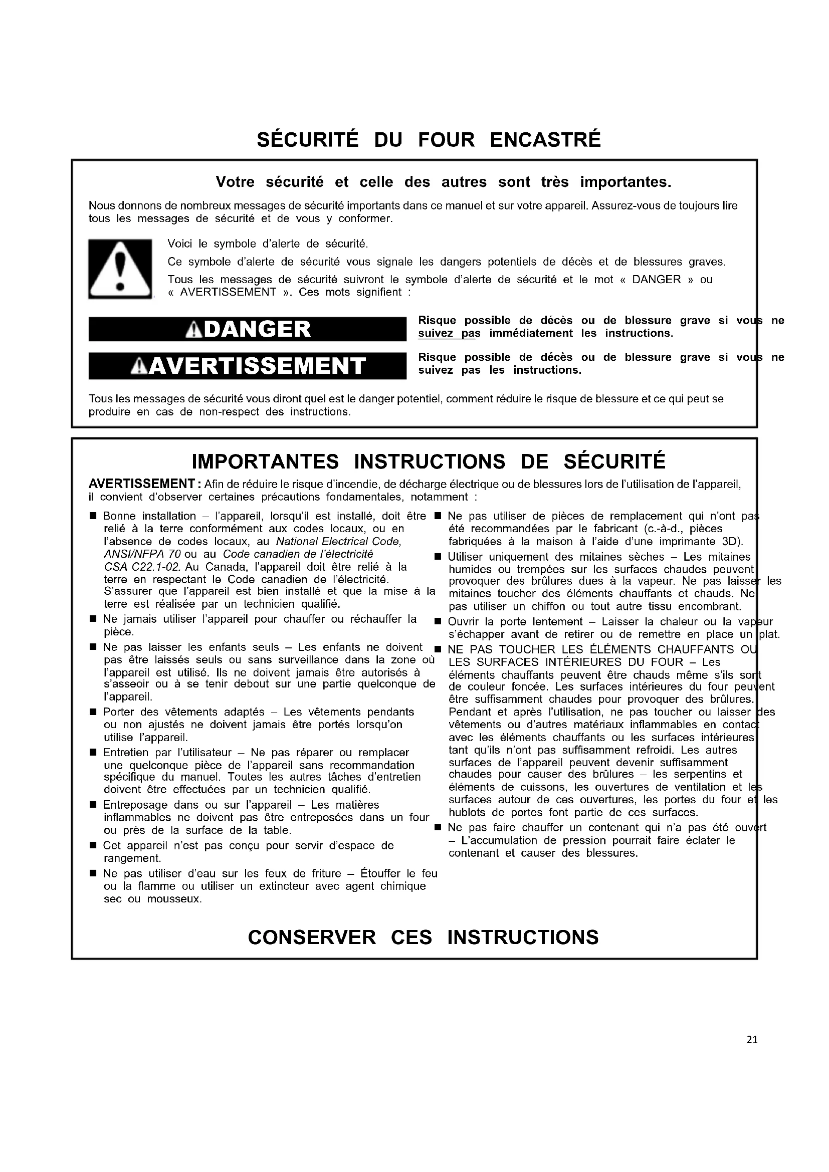 AVERTISSEMENT : Afin de réduire le risque d’incendie, de décharge électrique ou de blessures lors de l’utilisation de l’appareil, il convient d’observer certaines précautions fondamentales, notamment : Garder dégagés les conduits de ventilation du four. Position des grilles du four – toujours placer les grilles à la position souhaitée lorsque le four est froid. Si une grille doit être déplacée pendant que le four est chaud, ne pas laisser la poignée entrer en contact avec l’élément chaud du four. Pour les fours autonettoyants : Ne pas nettoyer le joint de la porte – Le joint de la porte est essentiel pour une bonne étanchéité. Faire attention à ne pas frotter, endommager ou déplacer le joint. Ne pas utiliser de revêtement de protection pour recouvrir le four et ne pas utiliser de nettoyant commercial pour four, sauf s’il est certifié pour une utilisation dans les fours autonettoyants. Ne nettoyer que les pièces indiquées.