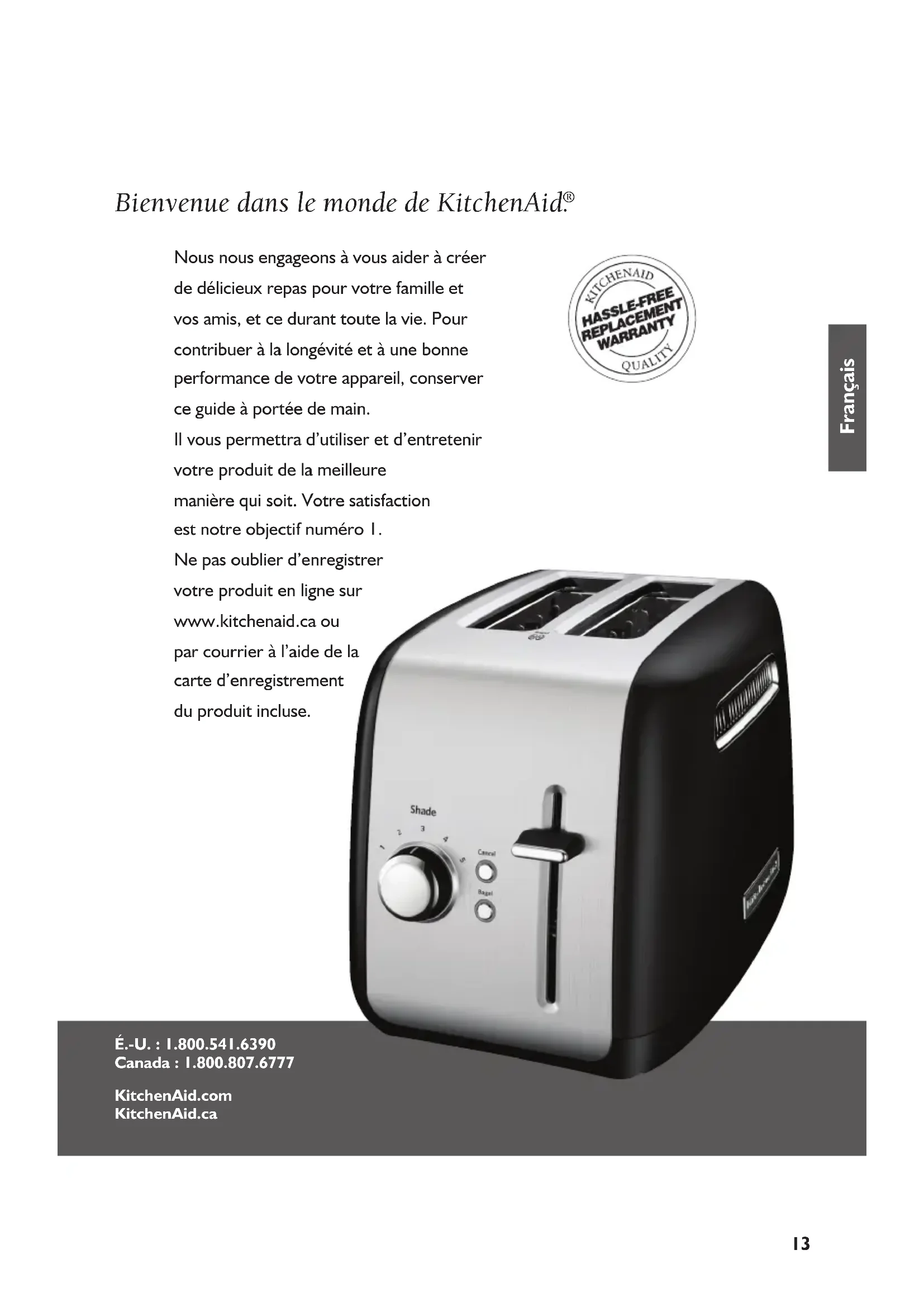 Nous nous engageons à vous aider à créer de délicieux repas pour votre famille et vos amis, et ce durant toute la vie. Pour contribuer à la longévité et à une bonne performance de votre appareil, conserver ce guide à portée de main. Il vous permettra d’utiliser et d’entretenir votre produit de la meilleure manière qui soit. Votre satisfaction est notre objectif numéro 1. Ne pas oublier d’enregistrer votre produit en ligne sur www.kitchenaid.ca ou par courrier à l’aide de la carte d’enregistrement du produit incluse. É.-U. : 1.800.541.6390 Canada : 1.800.807.6777 KitchenAid.com KitchenAid.ca W10441000A P1.5 Toaster.indd 13 10/7/11 3:50 PM14 Table des matières