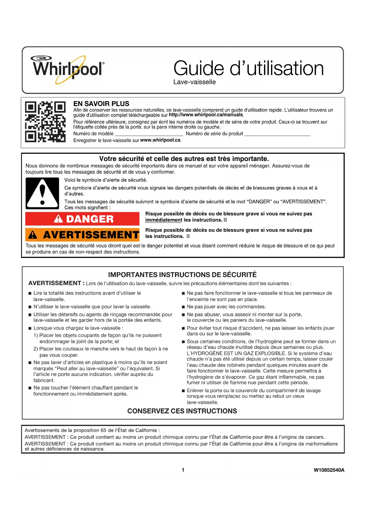 Afin de conserver les ressources naturelles, ce lave-vaisselle comprend un guide d'utilisation rapide. L'utilisateur trouvera un guide d'utilisation complet téléchargeable sur http://www.whirlpool.ca/manuals